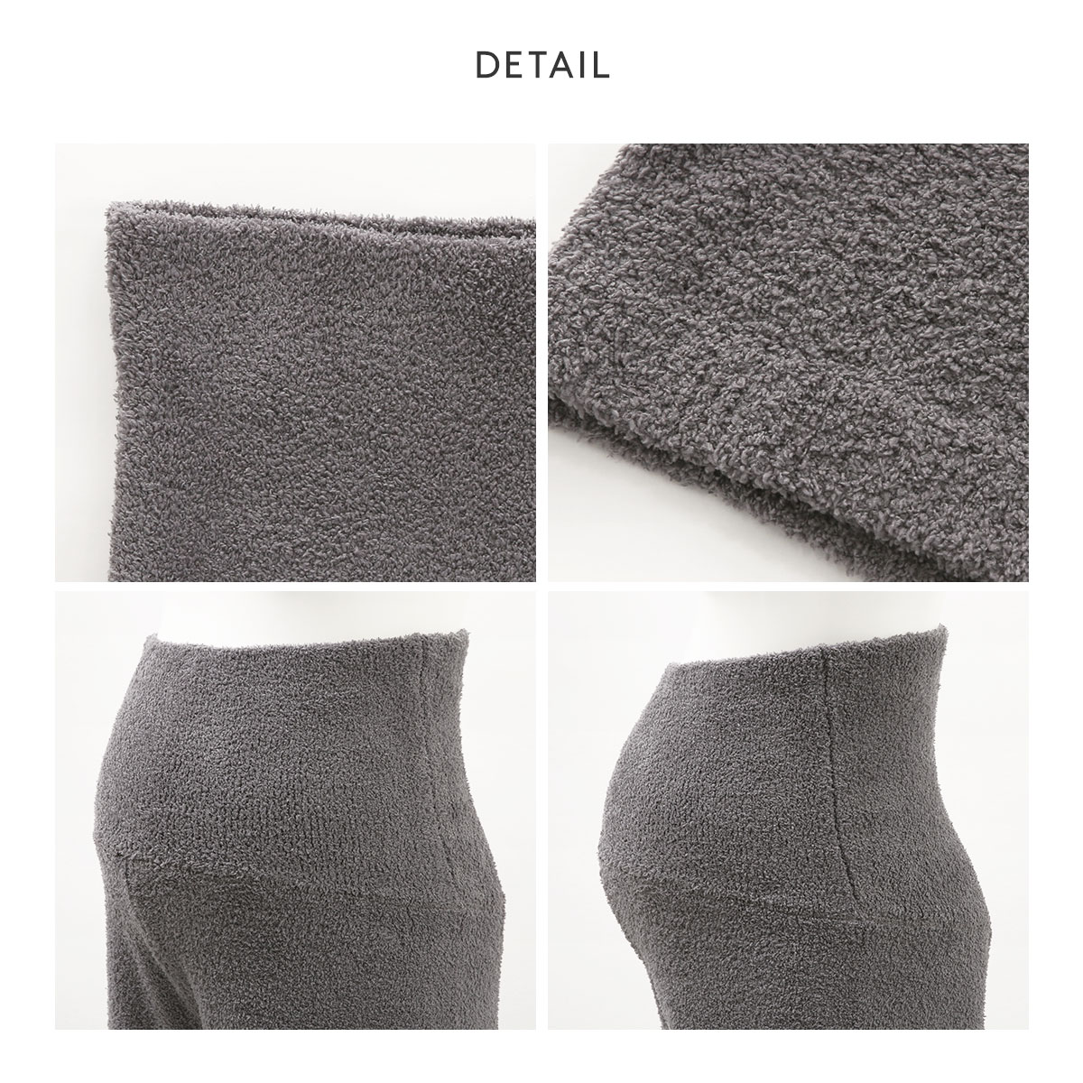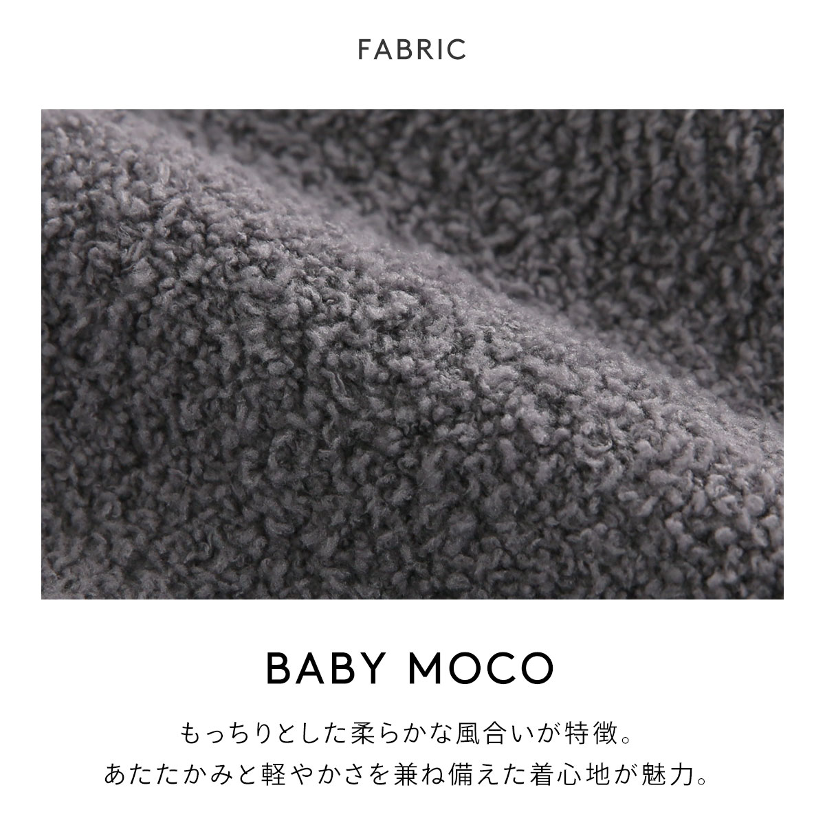 身生地は、柔らかさとふわふわ感はそのままに、毛足を短くすることですっきりご着用いただけるベビモコ素材。ボリューム感がありつつも、軽やかなはき心地が魅力です。