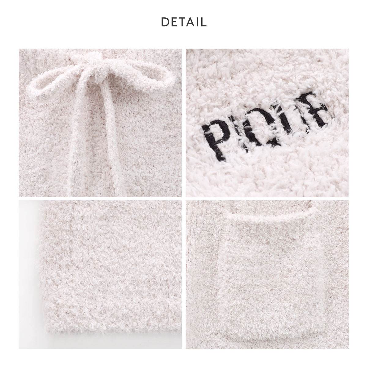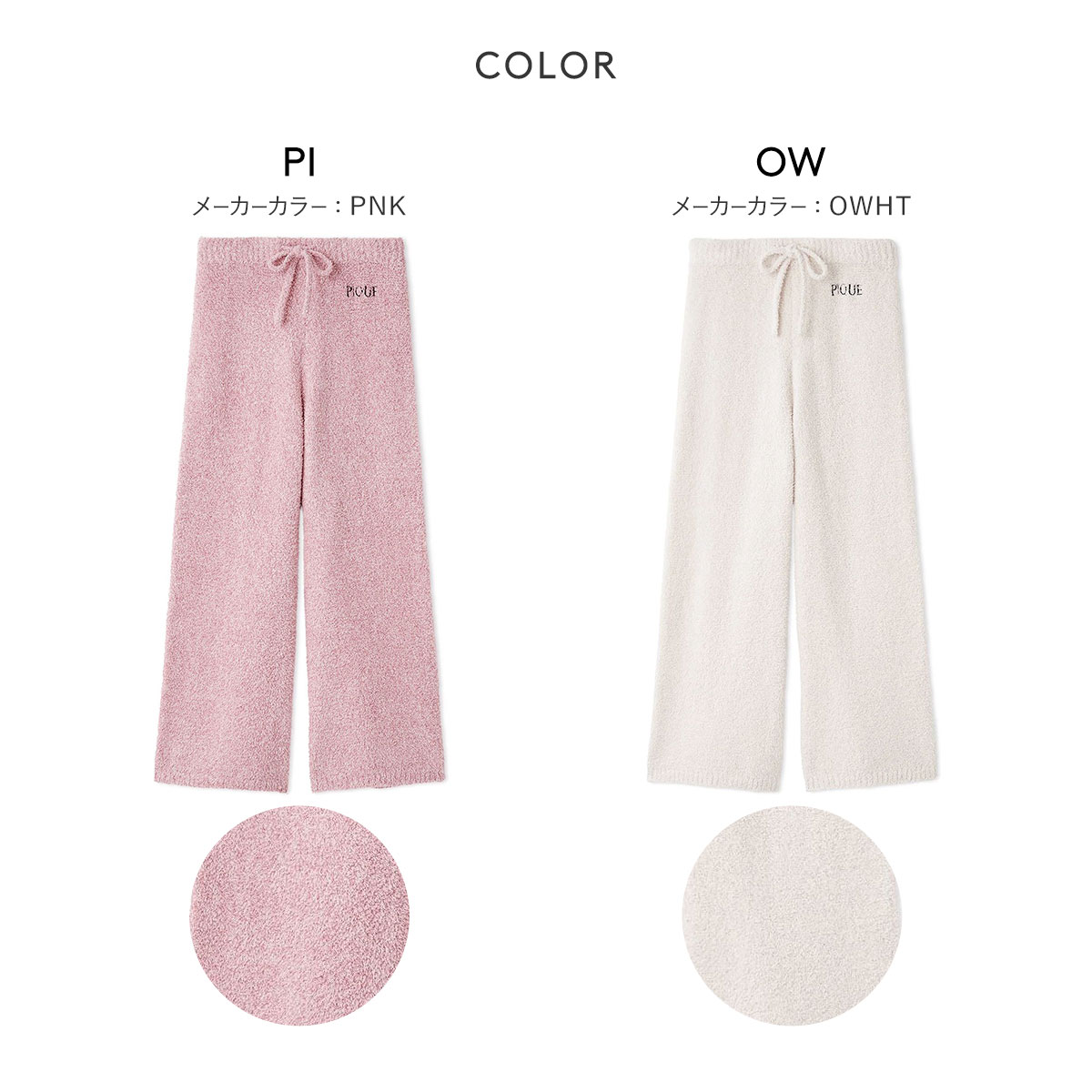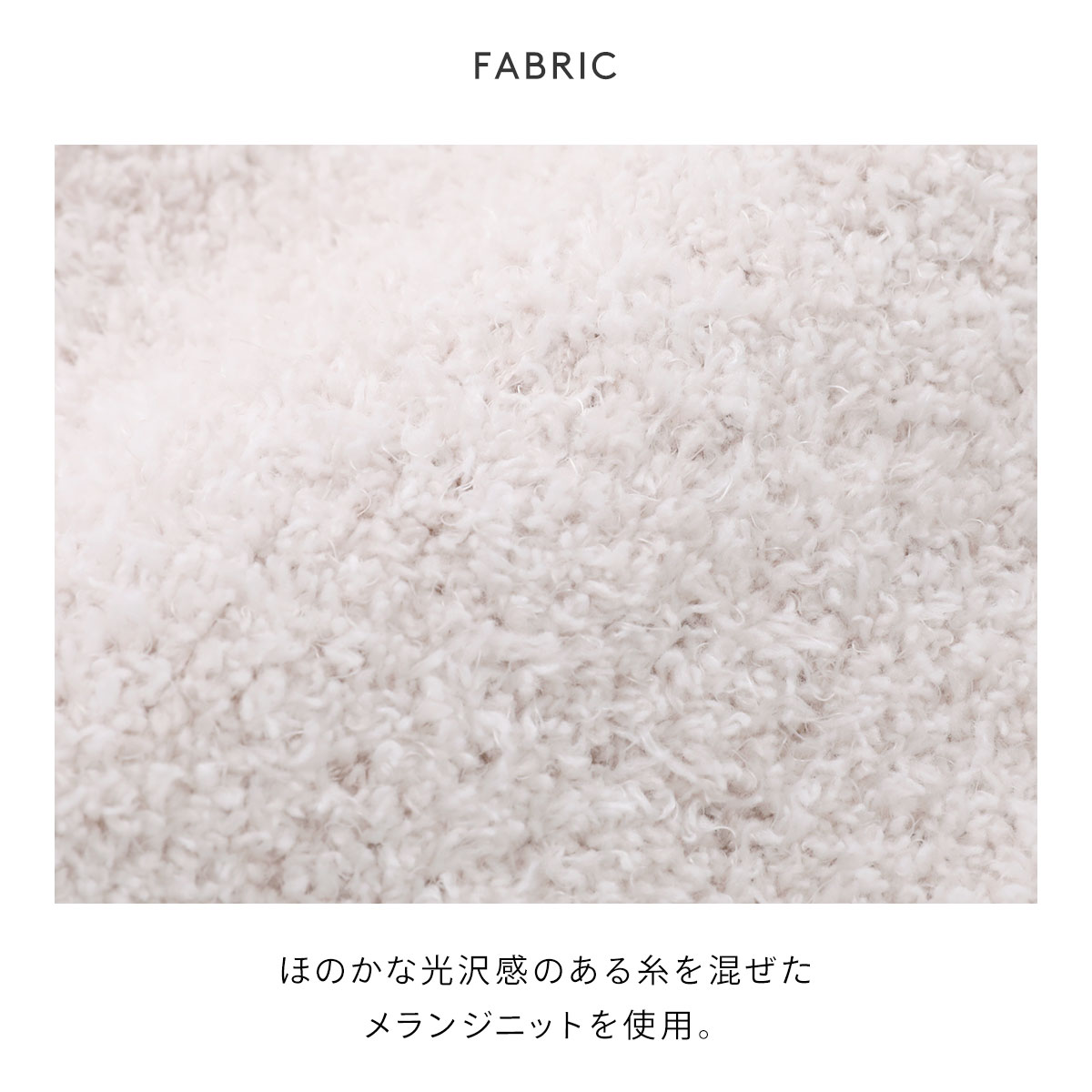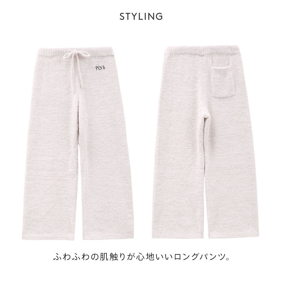 ほのかな光沢感のある糸を混ぜたメランジニットを使用した、ふわふわの肌触りが心地いいロングパンツ。
