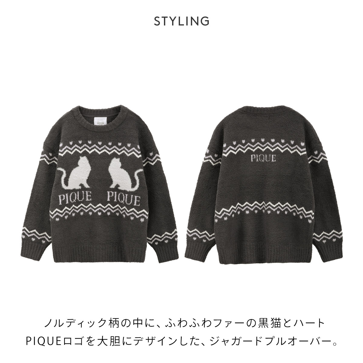 温かみのあるノルディック柄の中に、ふわふわファーの黒猫とハート、PIQUEロゴを大胆にデザインした、ジャガードプルオーバーです。