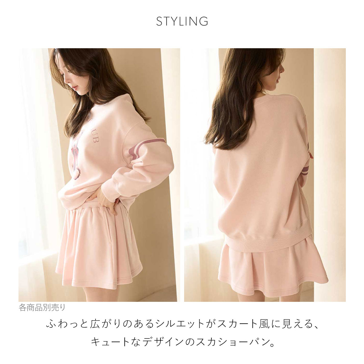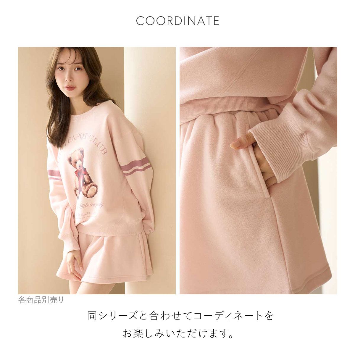 同時期に展開するベアモチーフのシリーズとカラー連動した、柔らかな裏毛素材のスカショーパン。