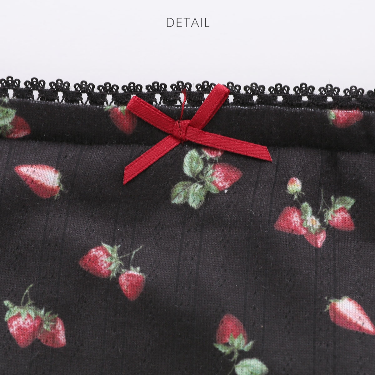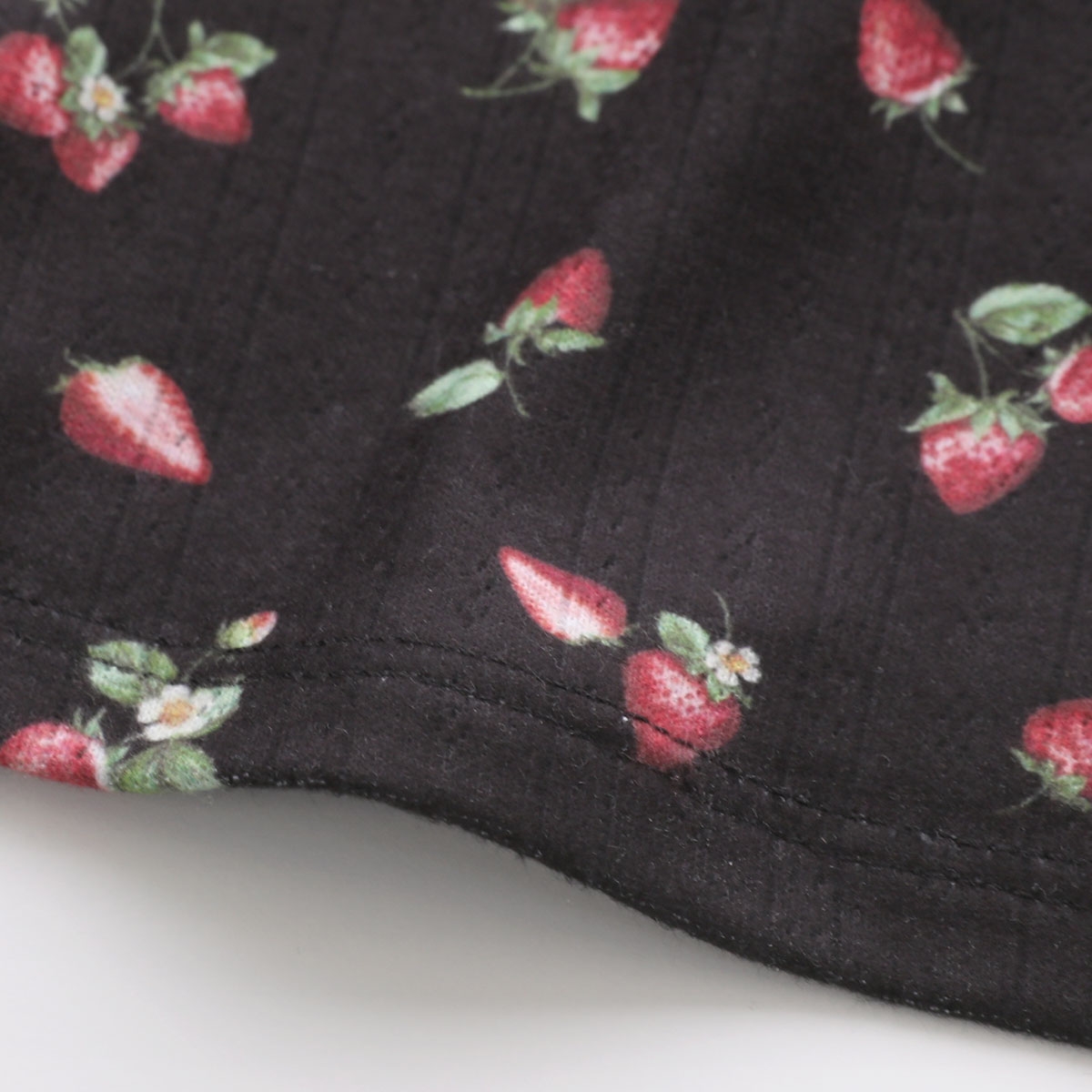 アイレット生地にジューシーないちごの絵柄を総柄プリントした、甘すぎない印象のカットソーシリーズ。