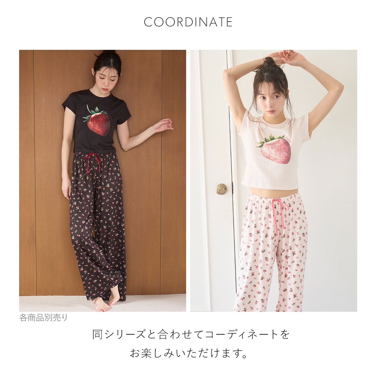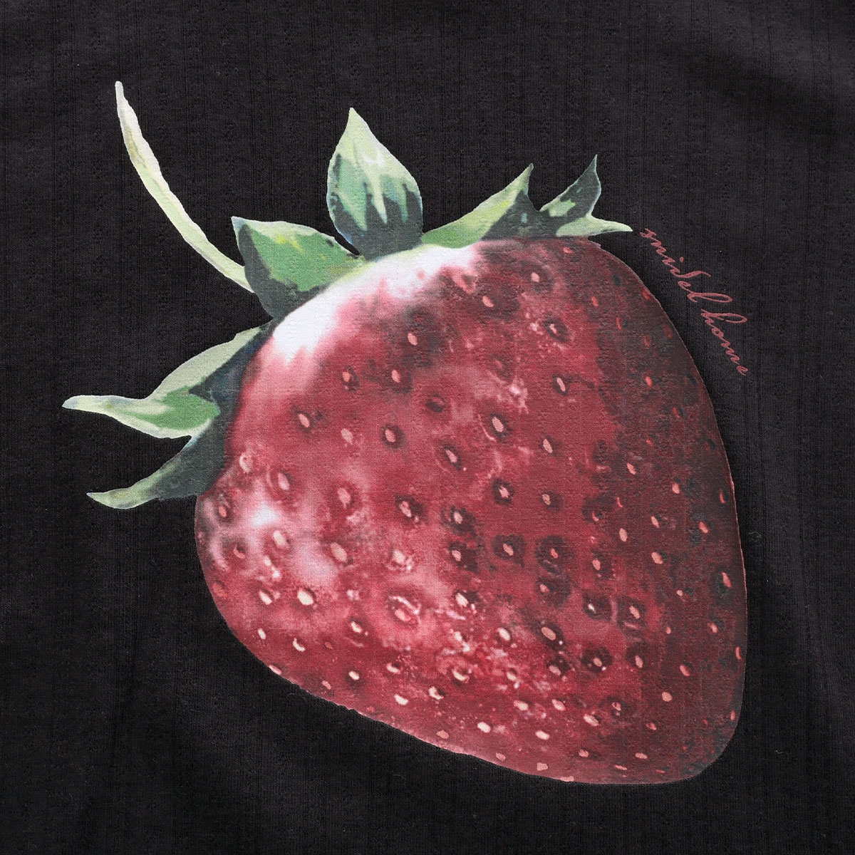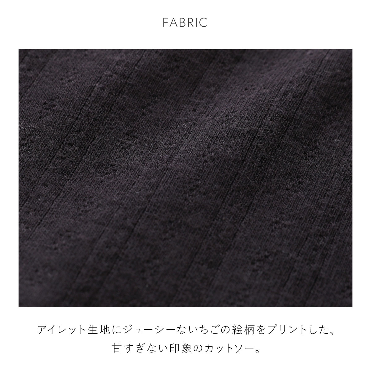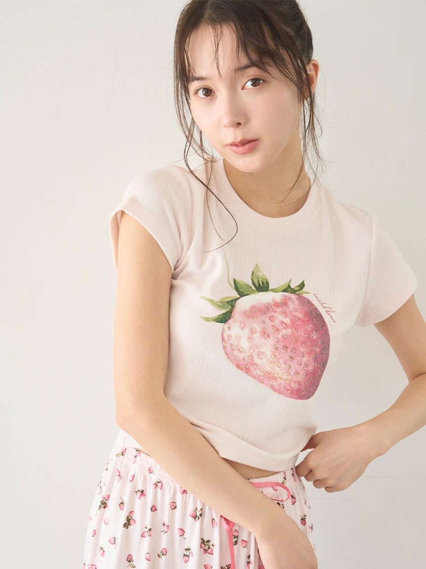 アイレット生地にジューシーないちごの絵柄をプリントした、甘すぎない印象のカットソーシリーズ。