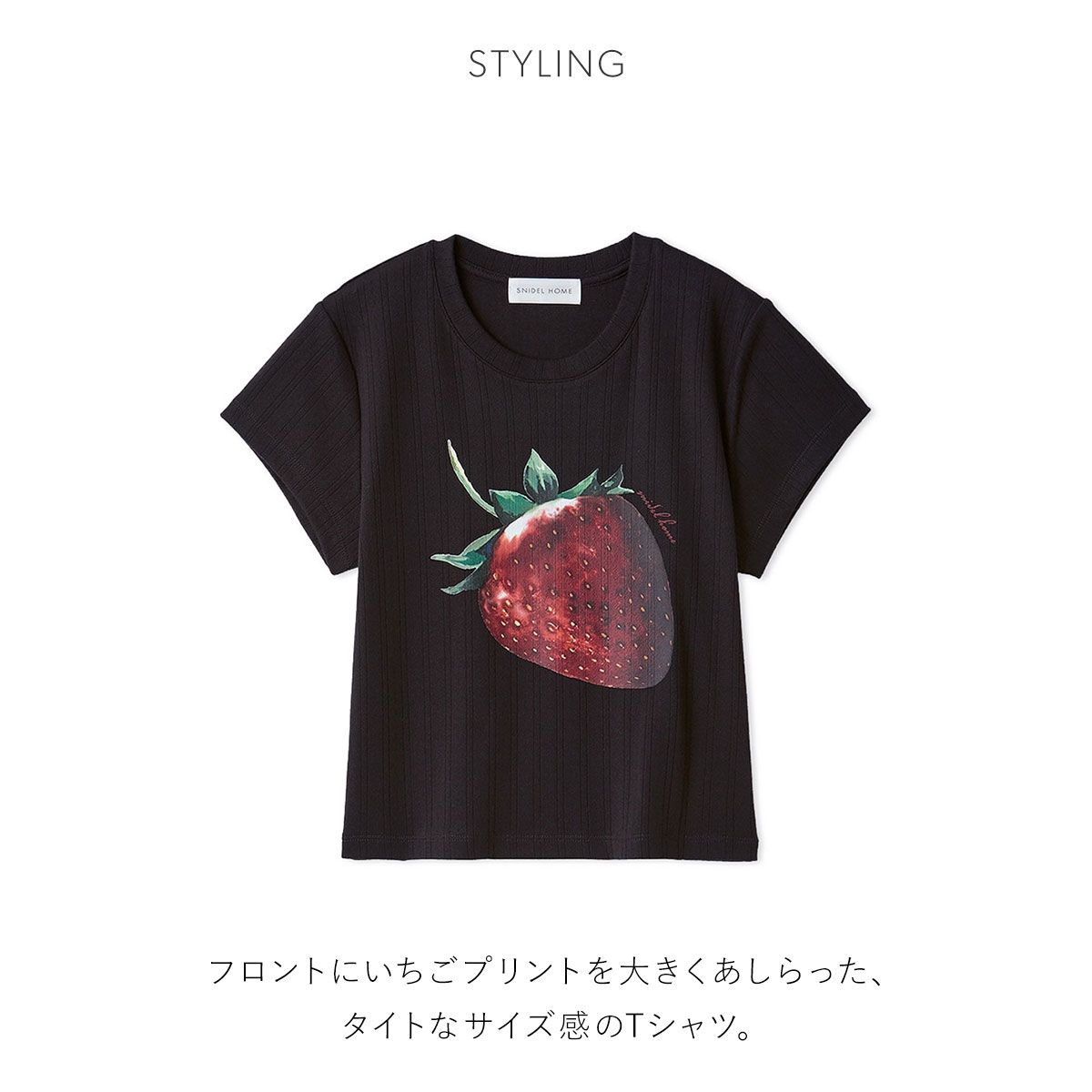 こちらは、フロントにいちごプリントを大きくあしらった、タイトなサイズ感のTシャツです。