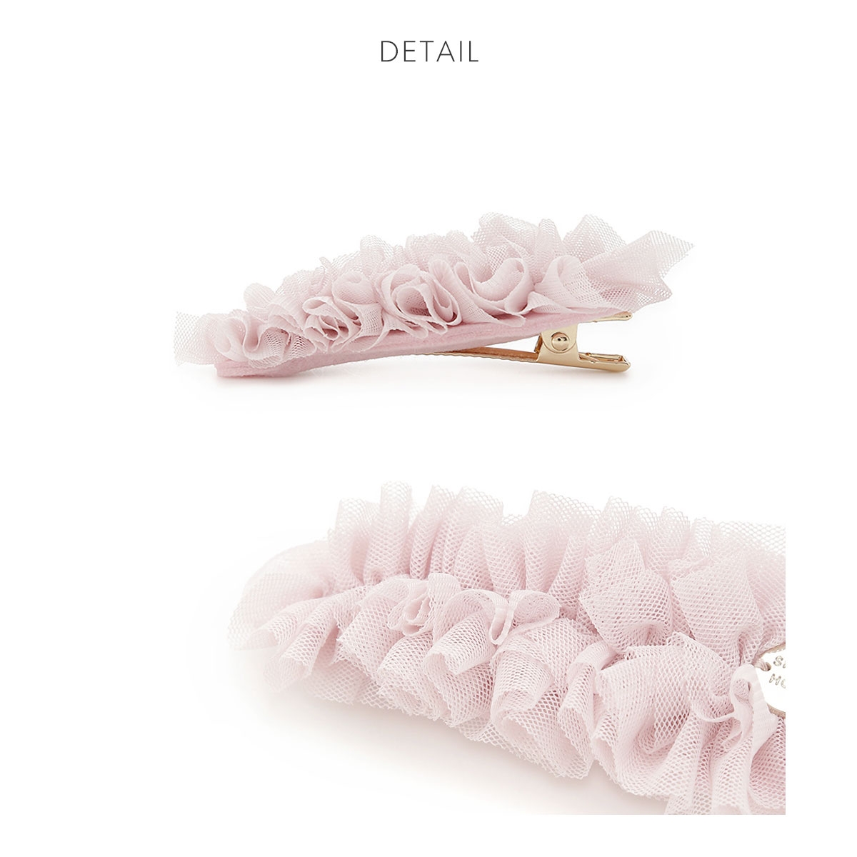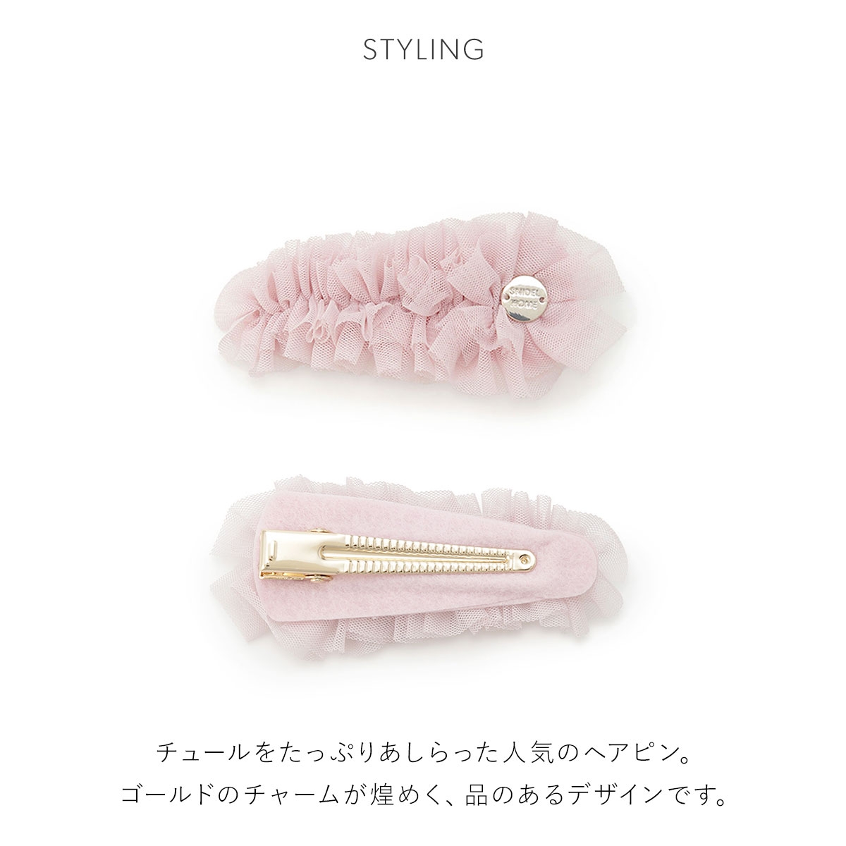 チュールをたっぷりあしらった人気のヘアピン。ワンポイントで付けたゴールドのチャームが煌めく、品のあるデザインです。
