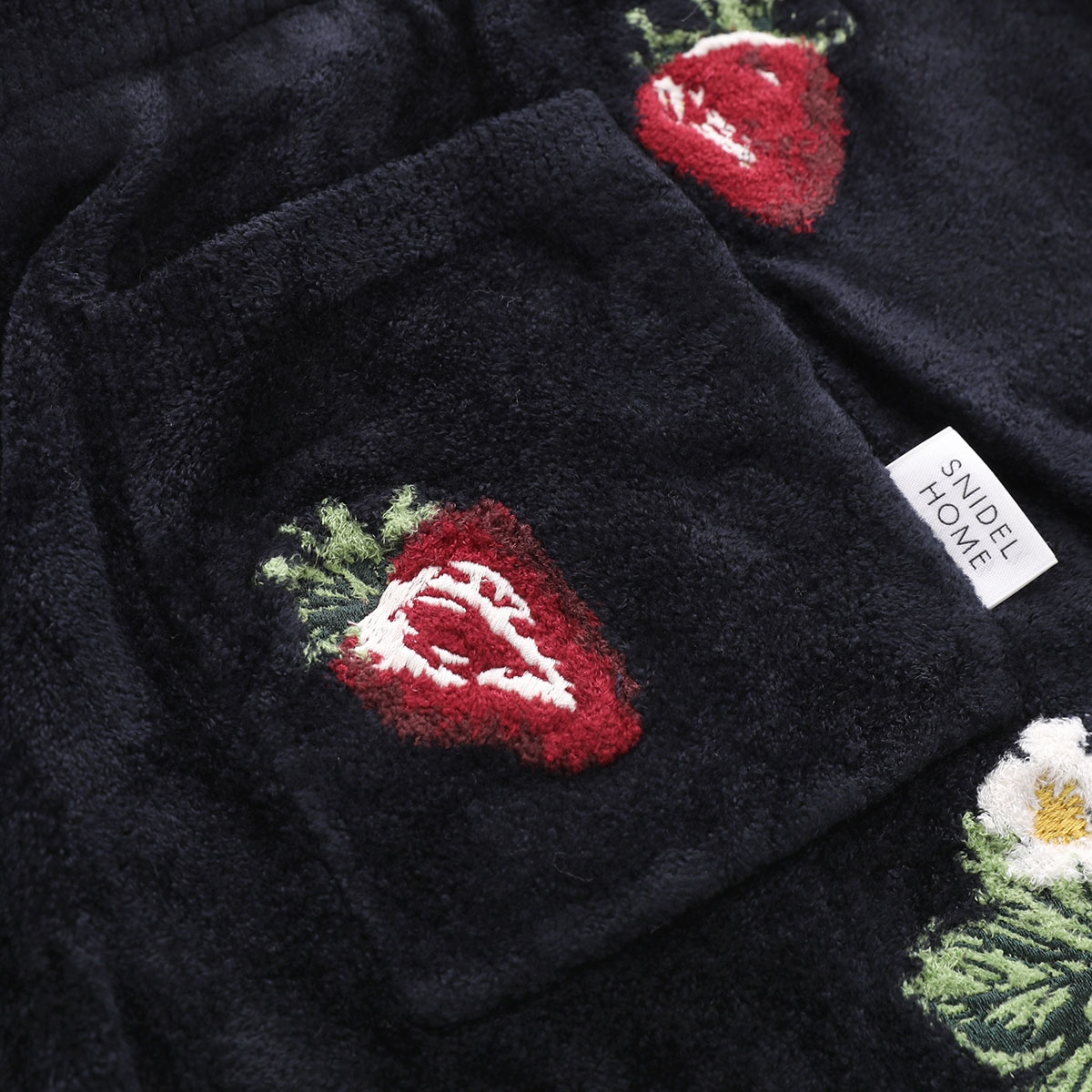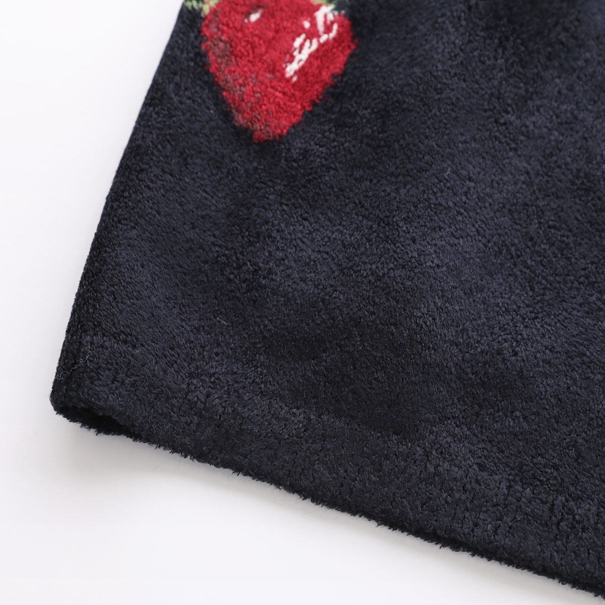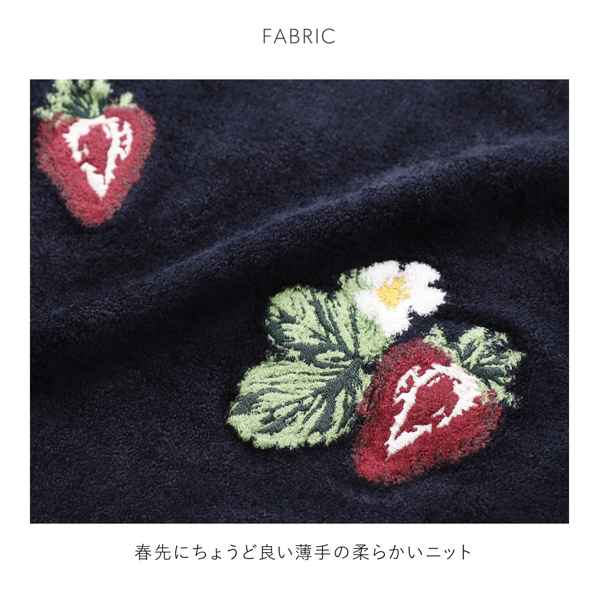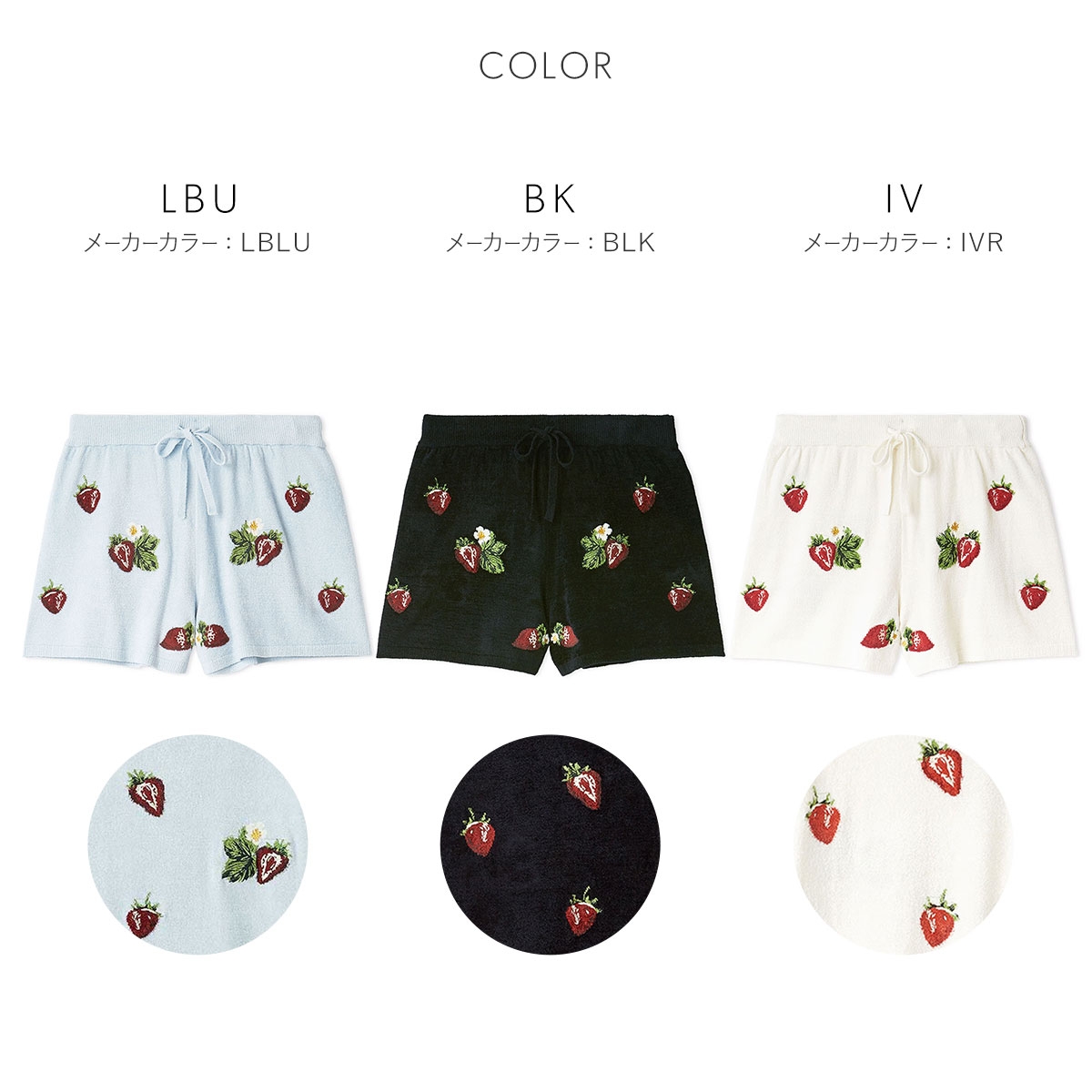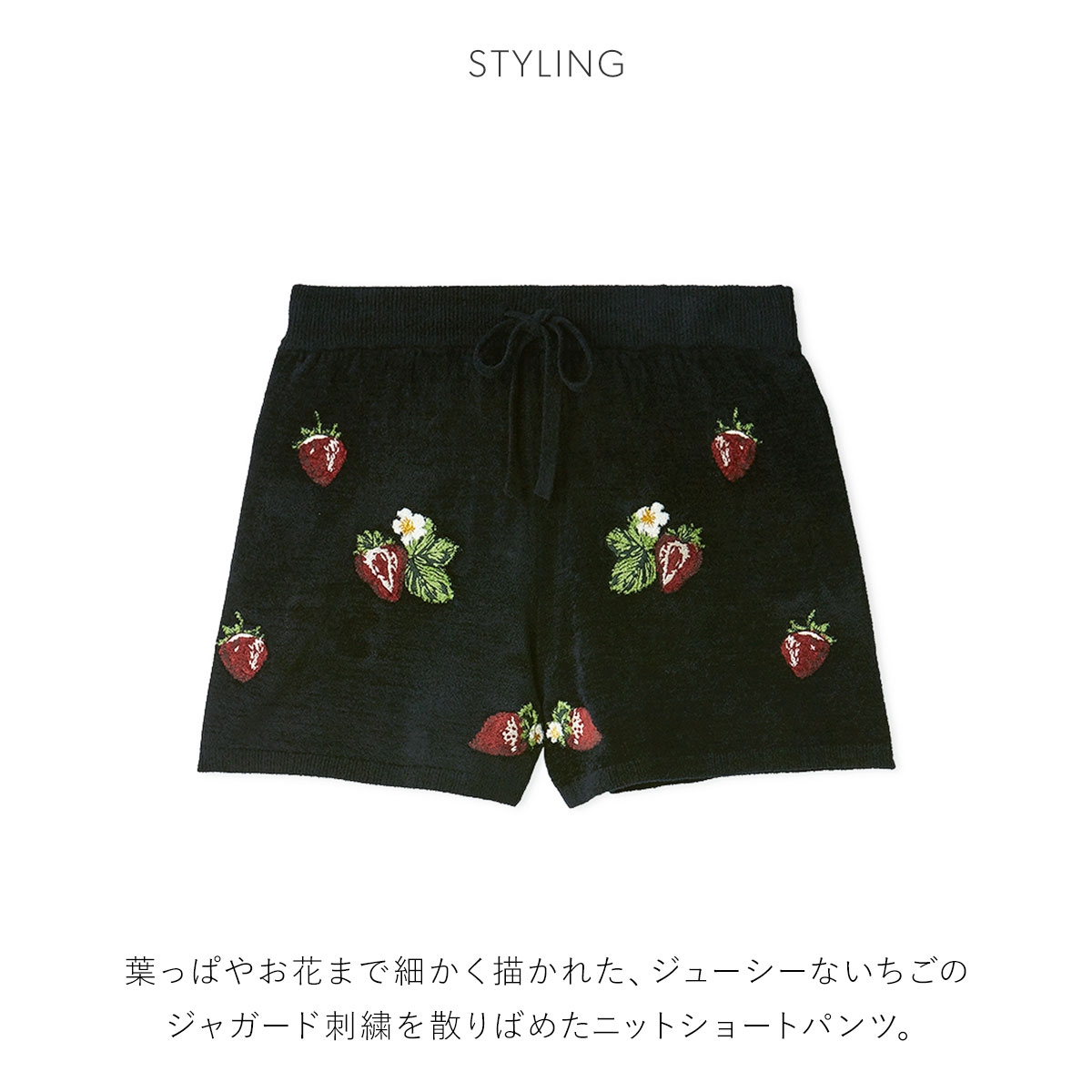 葉っぱやお花まで細かく描かれた、ジューシーないちごのジャガード刺繍を散りばめたニットショートパンツ。