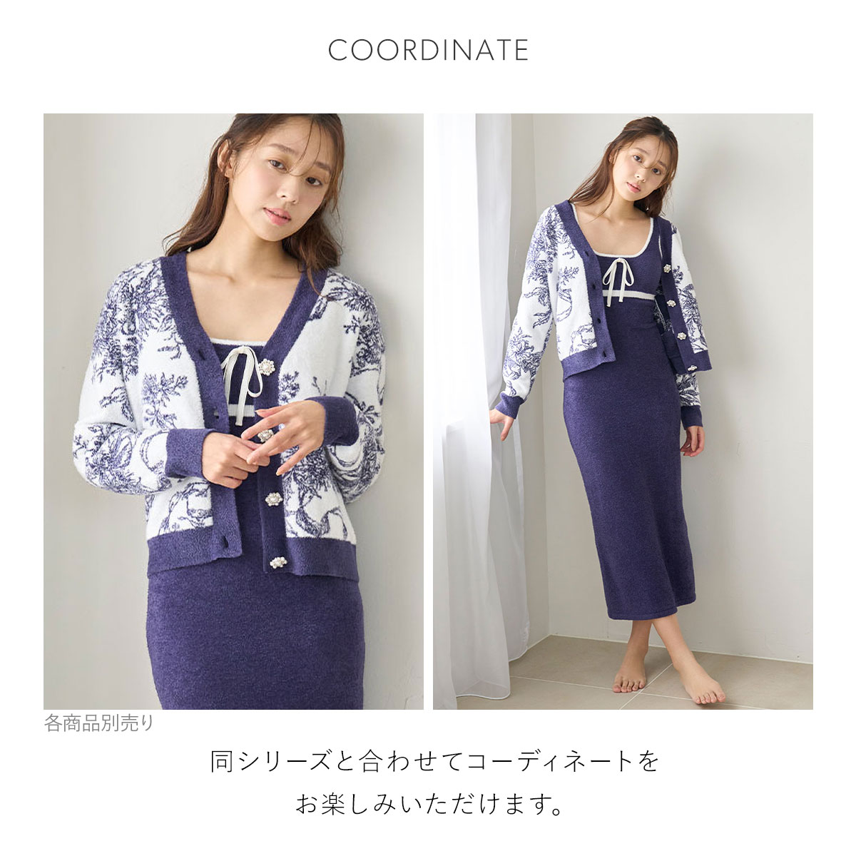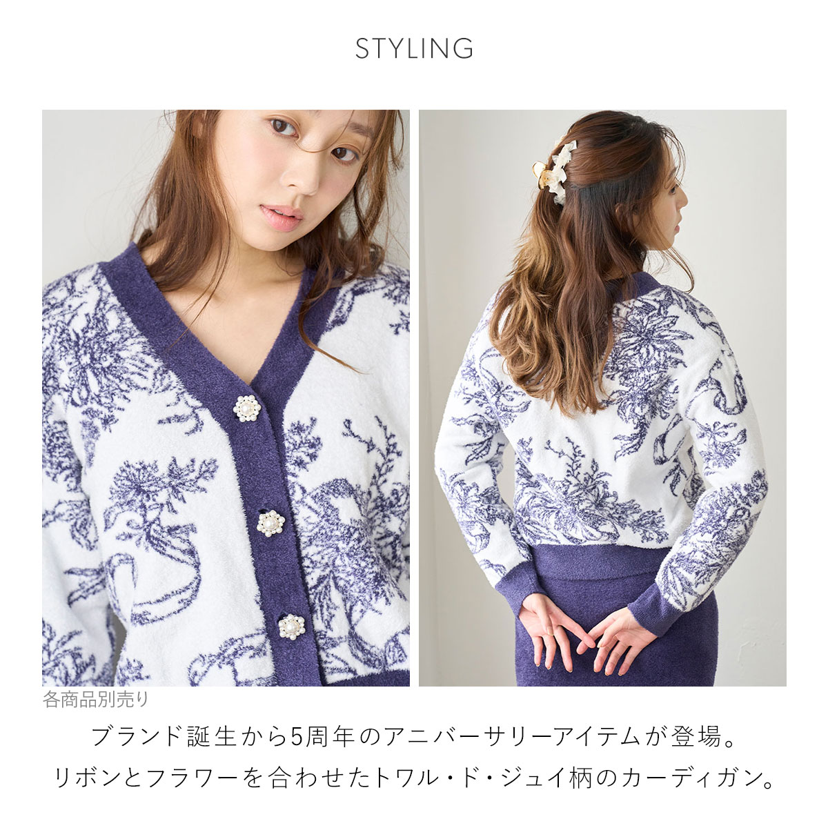 リボンとフラワーを合わせたロマンティックなトワル・ド・ジュイ柄をあしらった、ふっくらと柔らかな風合いのジャガードカーディガンです。ファッションブランド・SNIDELで過去に人気を博したアイテムをオマージュした、スペシャルなデザインです。