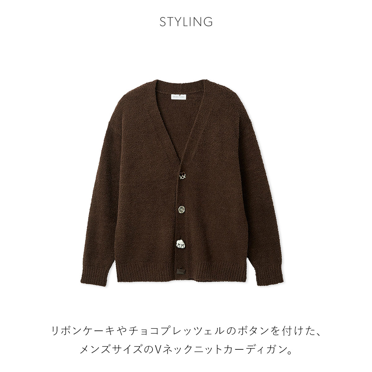 こちらは、リボンケーキやチョコプレッツェルのボタンを付けた、メンズサイズのVネックニットカーディガンです。