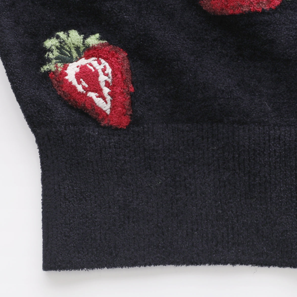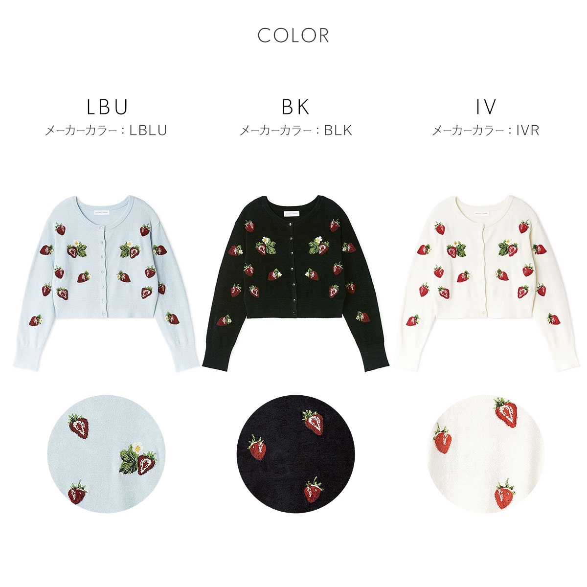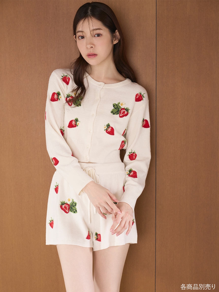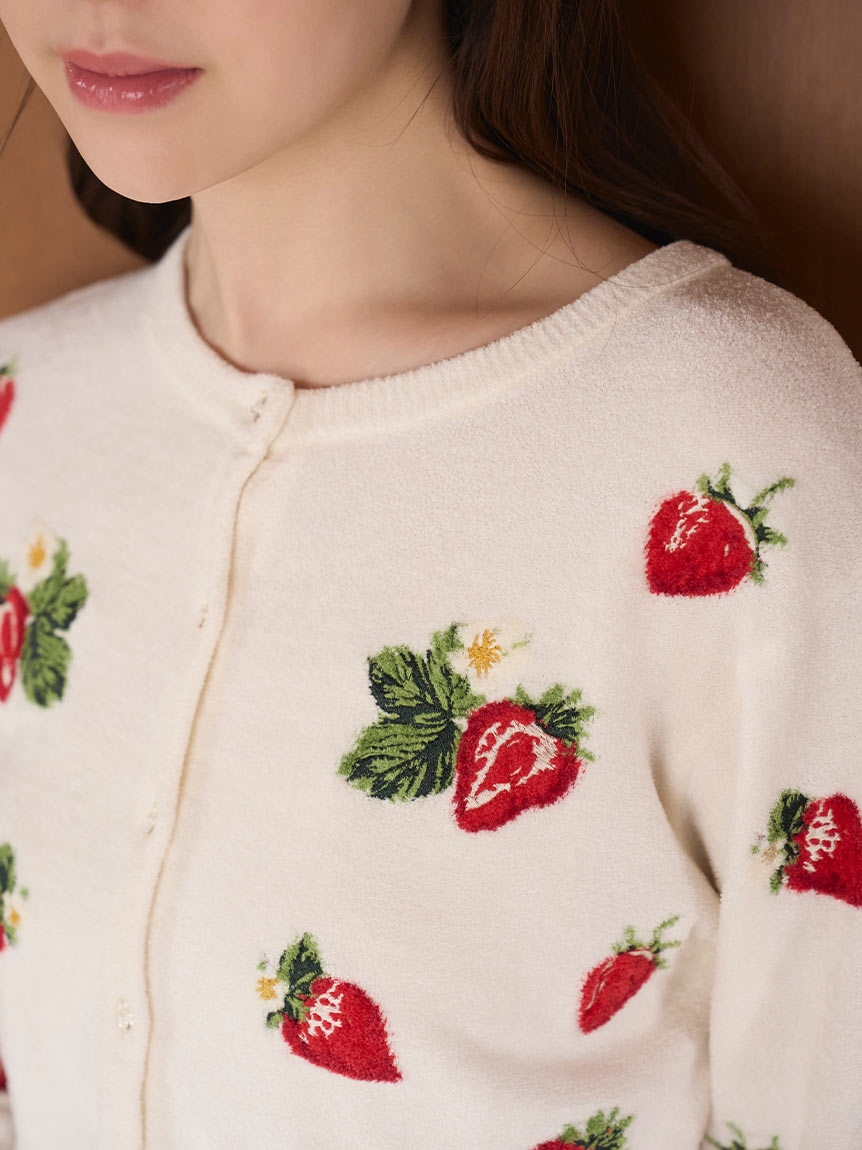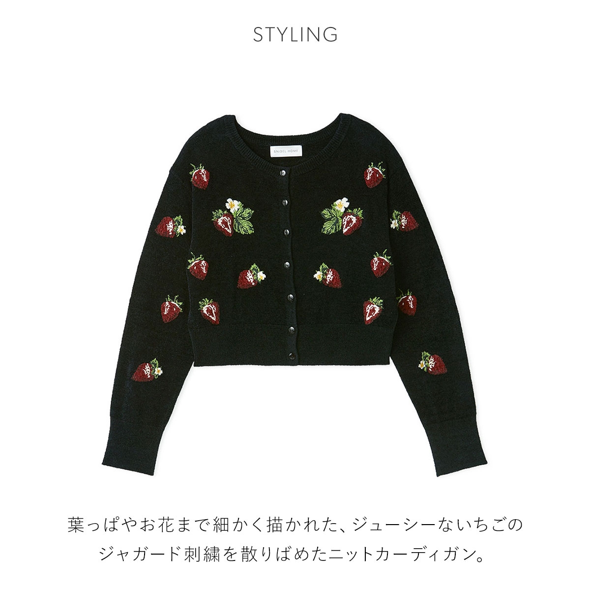 葉っぱやお花まで細かく描かれた、ジューシーないちごのジャガード刺繍を散りばめたニットカーディガン。