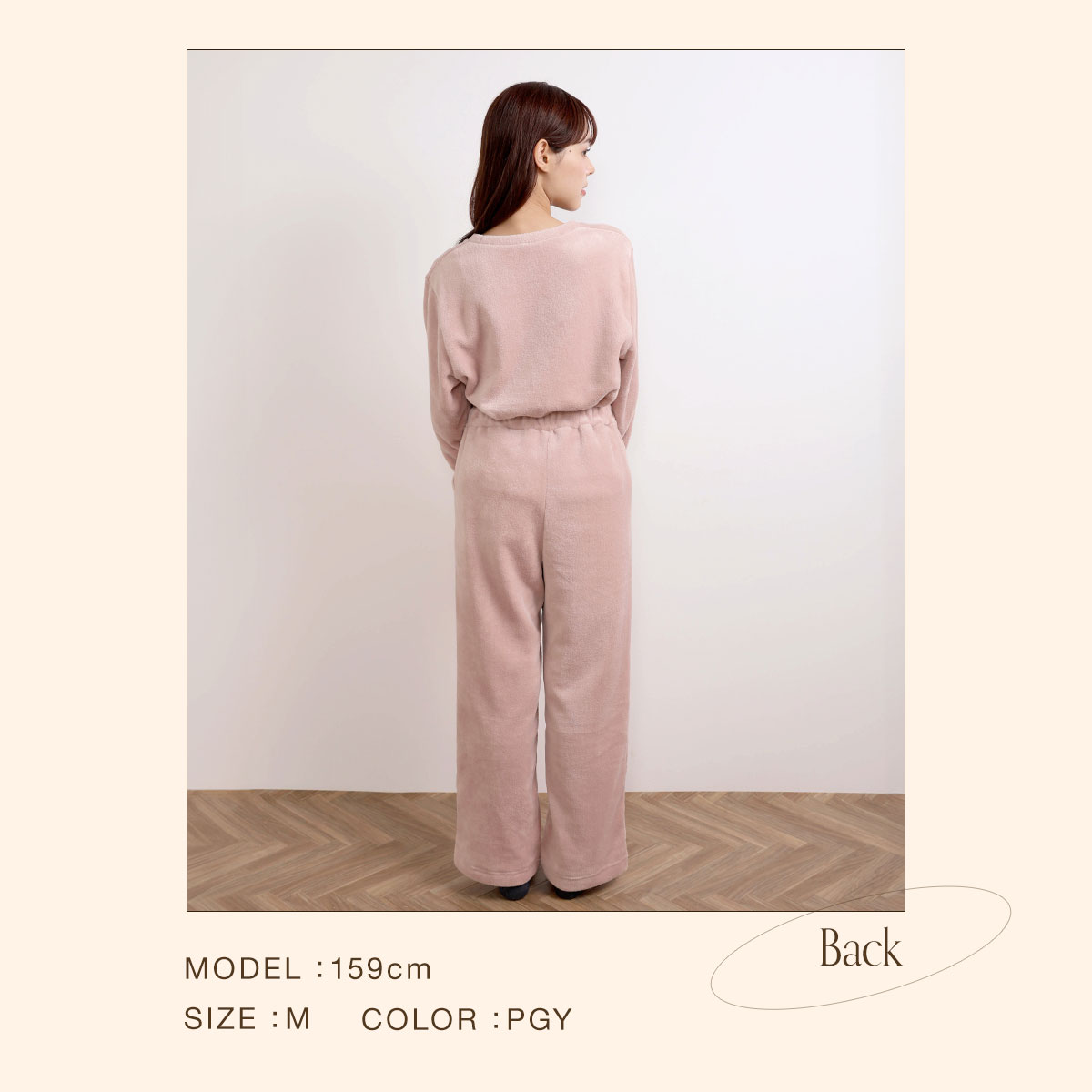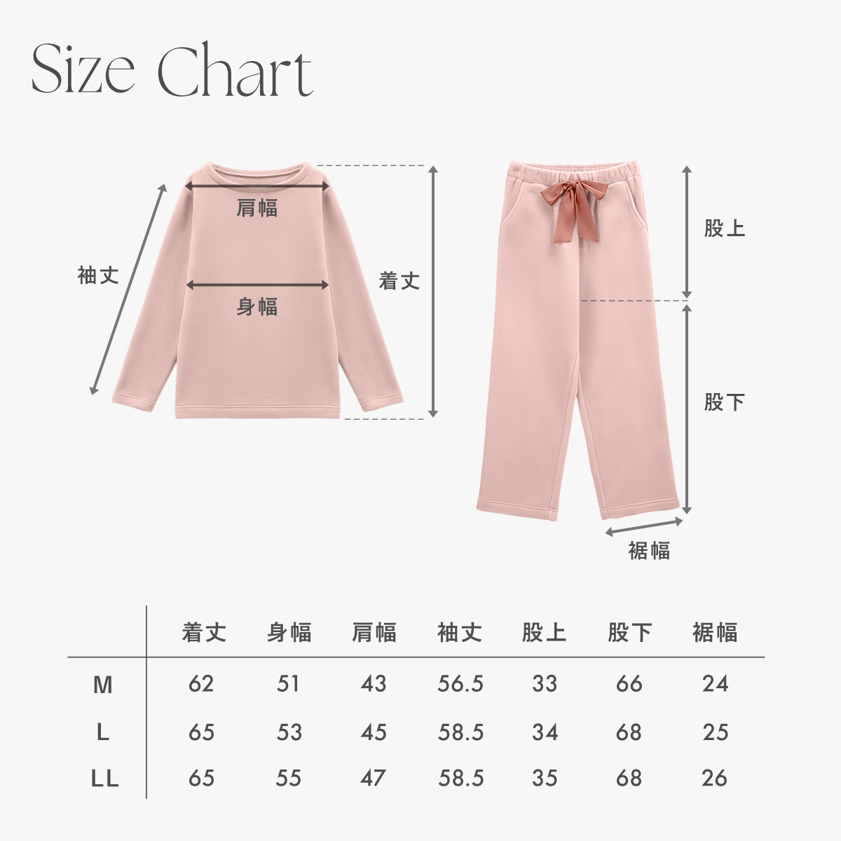 思わず頬ずりしたくなる、とろけるような肌触りの“パウダーフリース”生地を使用したセットアップ。ふんわり軽いのに保温性抜群で、まるで温かい空気に包まれているようなやさしい着心地です。