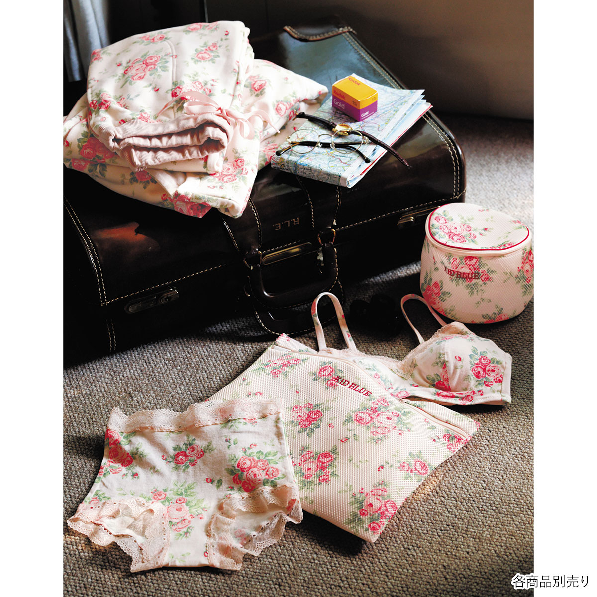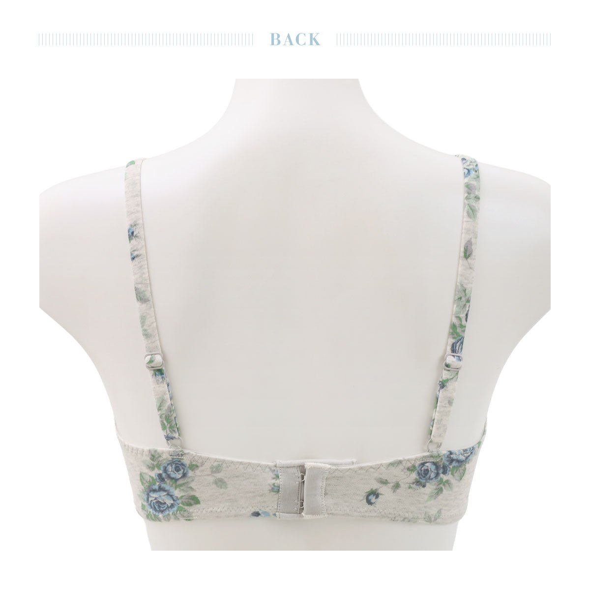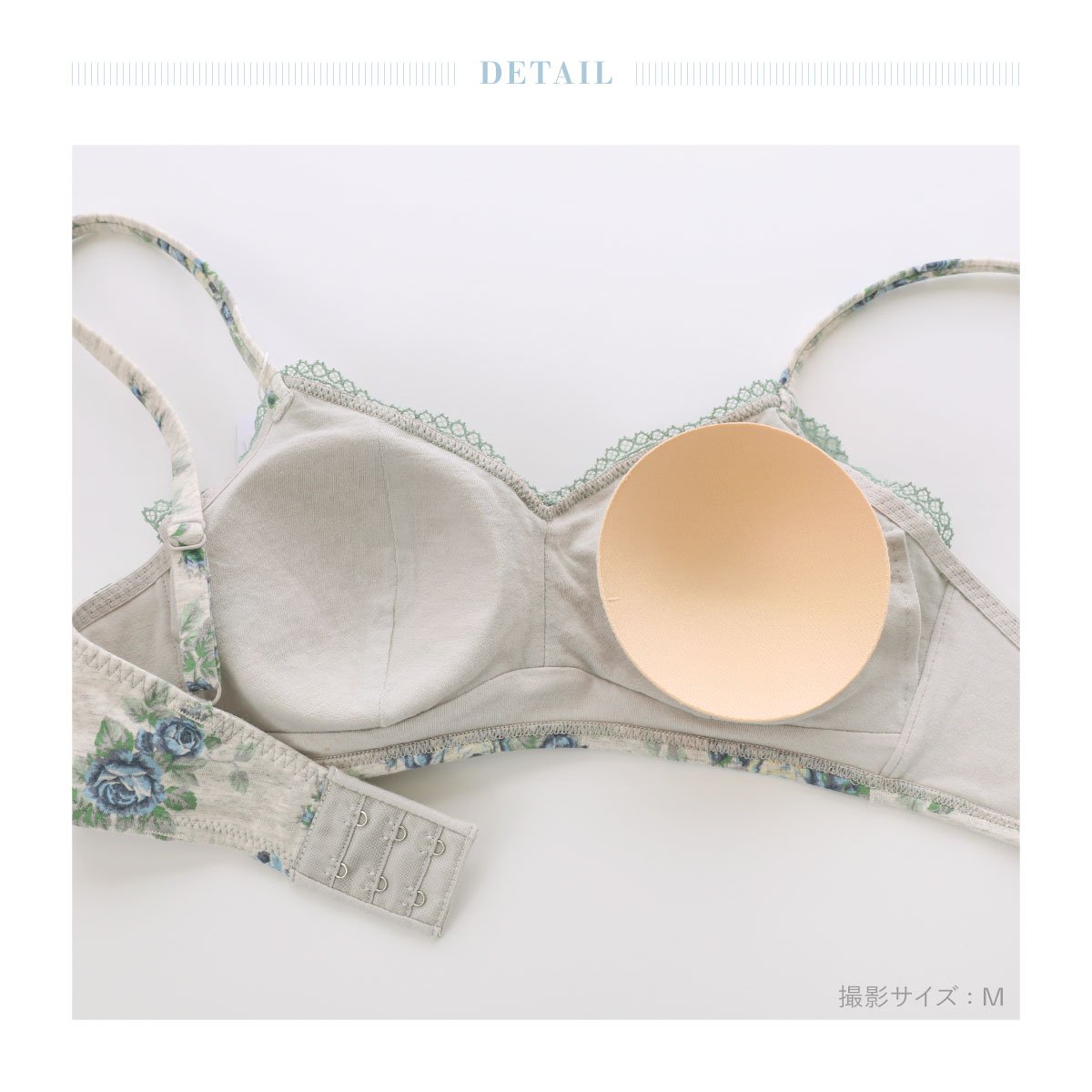 サーモンピンクは優しい薄いピンク、ブルーは杢グレーにローズを乗せ温かみのある雰囲気に仕上げました。後ろホックタイプのノンワイヤーブラジャーは、ストラップからアンダーまで総柄で華やか。カップ上部のレースが大人フェミニンな印象をプラスします。