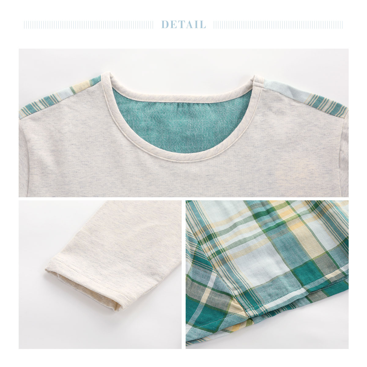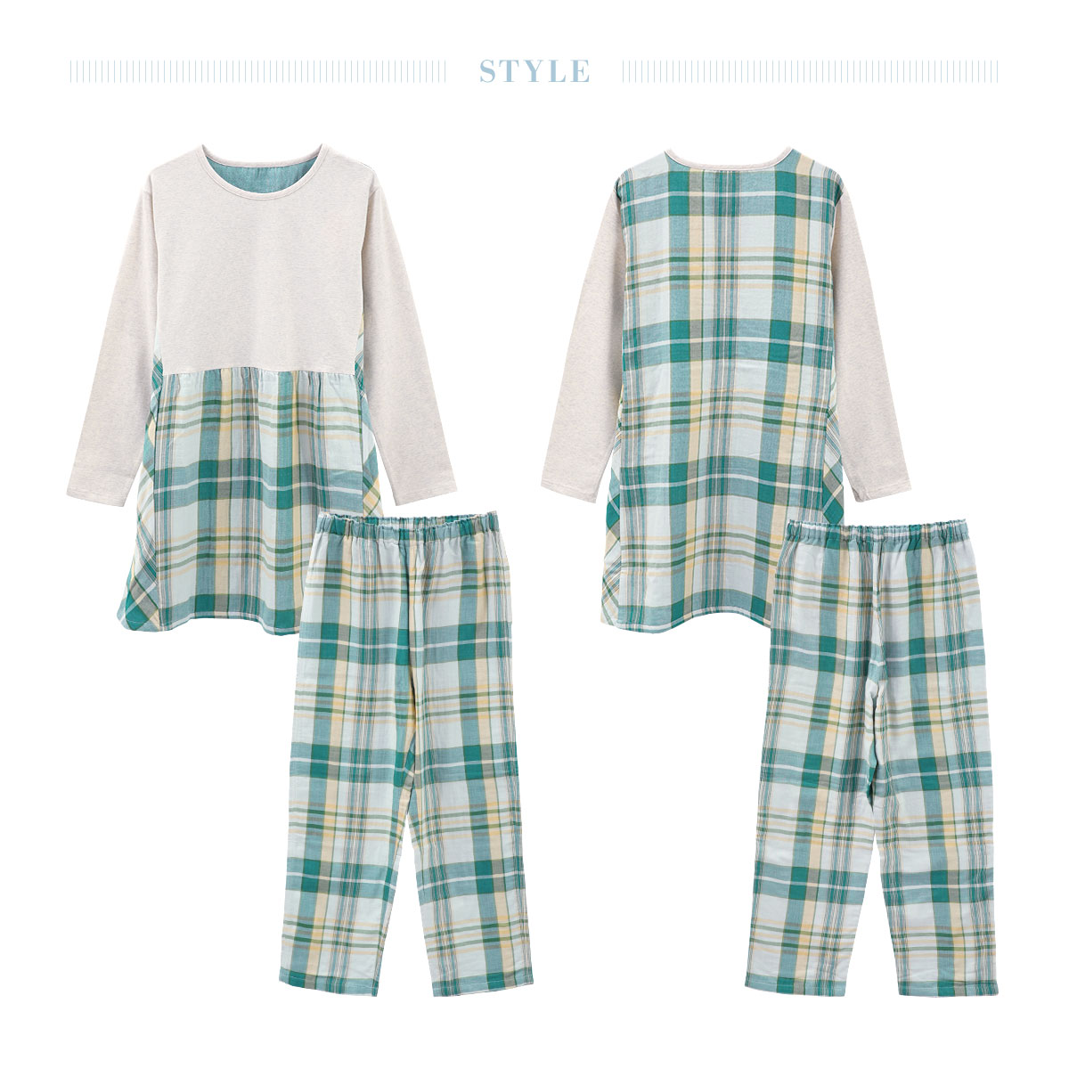 チュニックデザインの長袖パジャマは切り替えとギャザーがポイントです。トップスは裾に向かい広がっているシルエットで気になるお腹周りもカバーします。前身頃と袖は体の動きに合わせて伸縮するベア天竺を使用し着脱しやすく動きやすい仕様です。パンツはストレートタイプでバランスよく着こなせます。