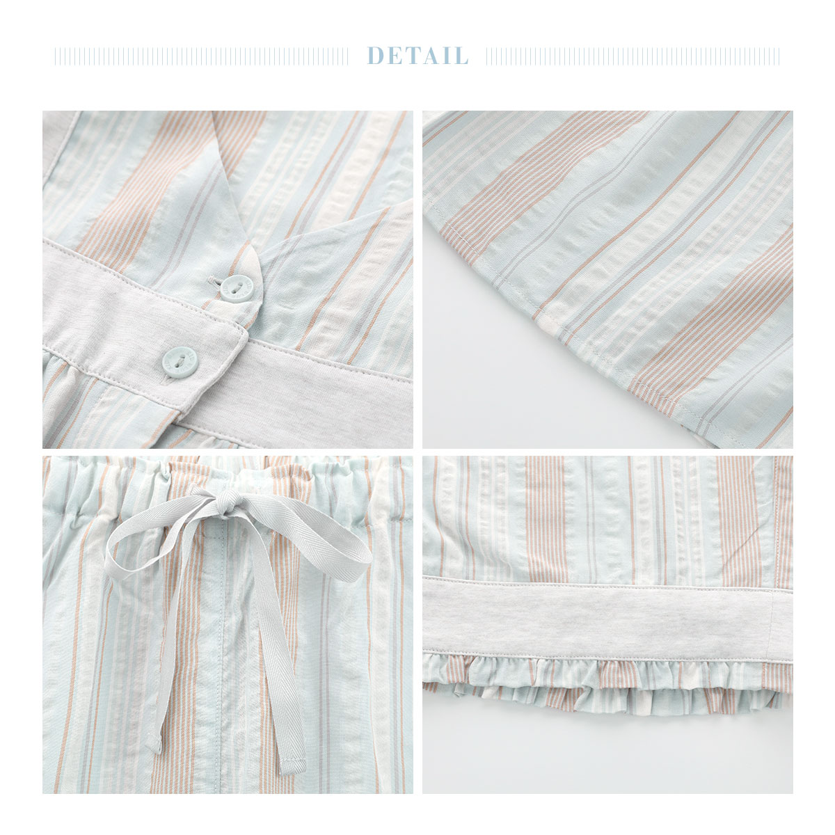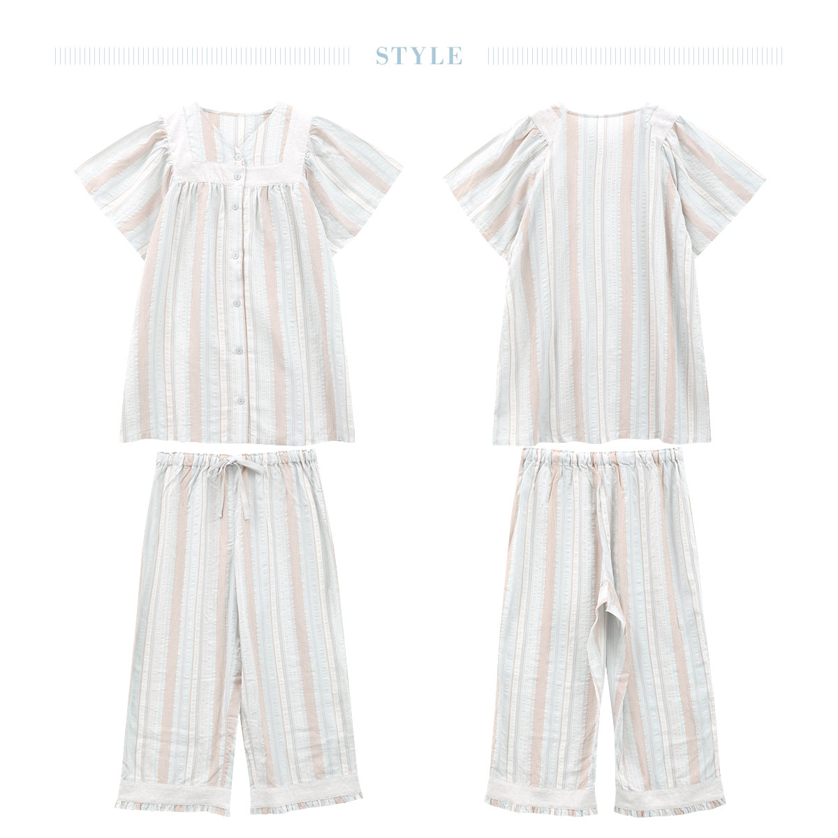 オリジナルのストライプ柄は縦ラインを強調し、細見え効果も期待できます。半袖パジャマは、前開きのトップスと7分丈ボトムスのセットで、すっきりしたVネックとフレアスリーブが特徴。二の腕を程よく隠し、襟元や裾の切り替えがデザインのアクセントに。