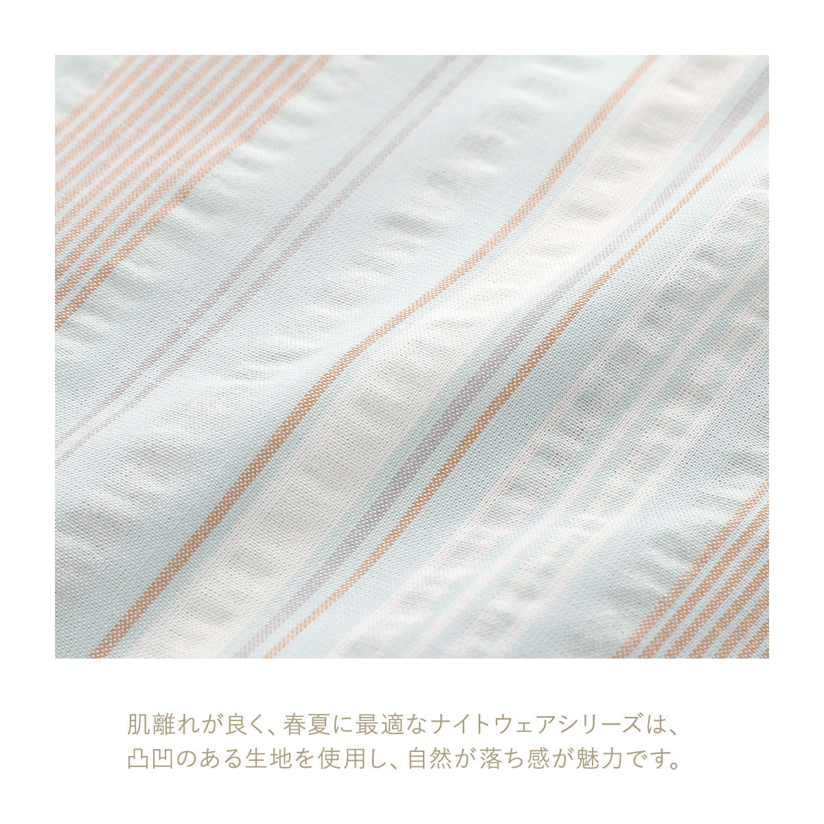 肌離れが良く、春夏に最適なナイトウェアシリーズは、凹凸のある生地を使用し、自然な落ち感が魅力です。