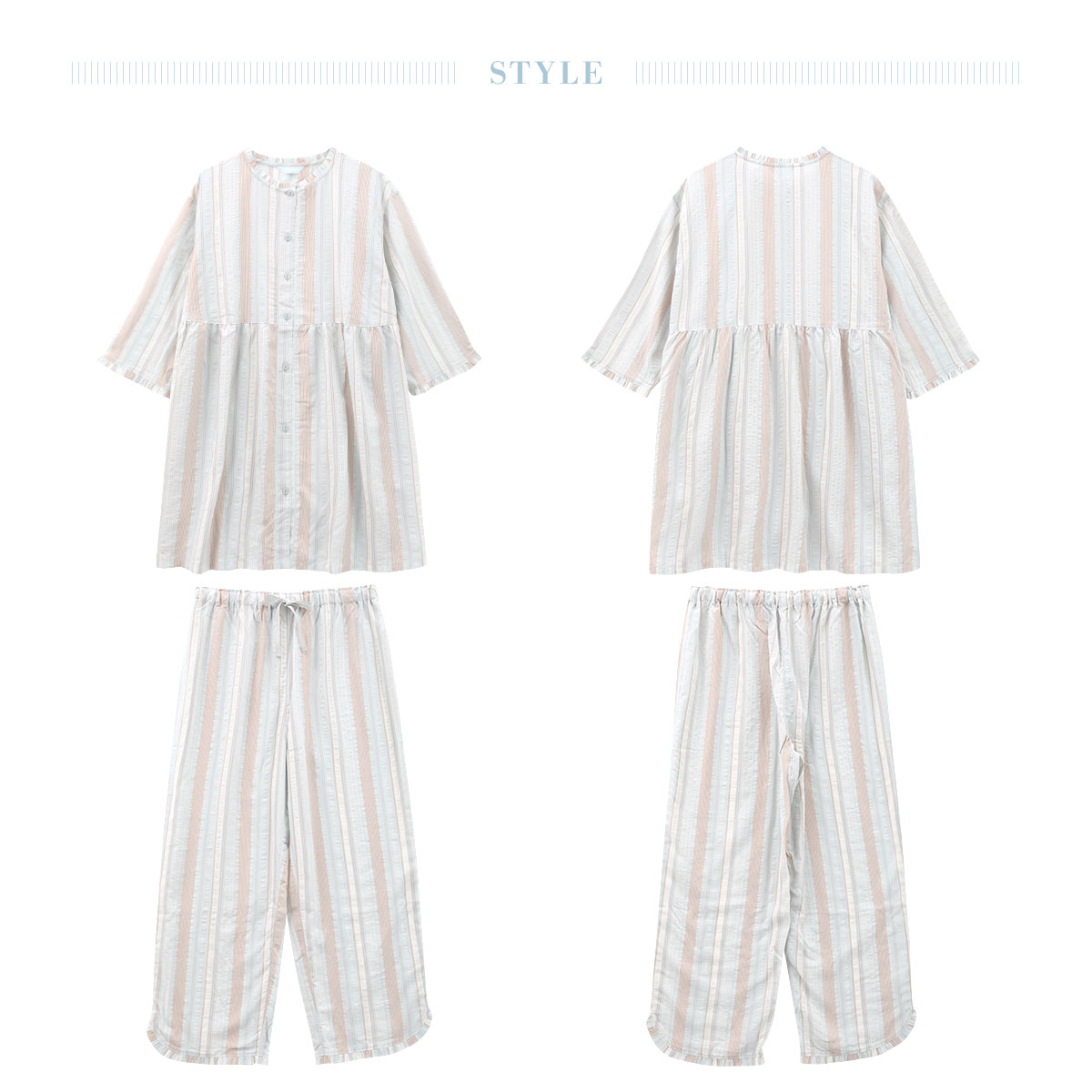 8分袖トップスとくるぶし丈ボトムスのパジャマは、冷房対策にもぴったり。ノーカラーの前開きデザインで、ギャザーの切り替えラインが女性らしさを引き立てます。裾にはフリルをあしらい、フェミニンな印象をプラスしました。快適さとスタイルを両立させた一着です。