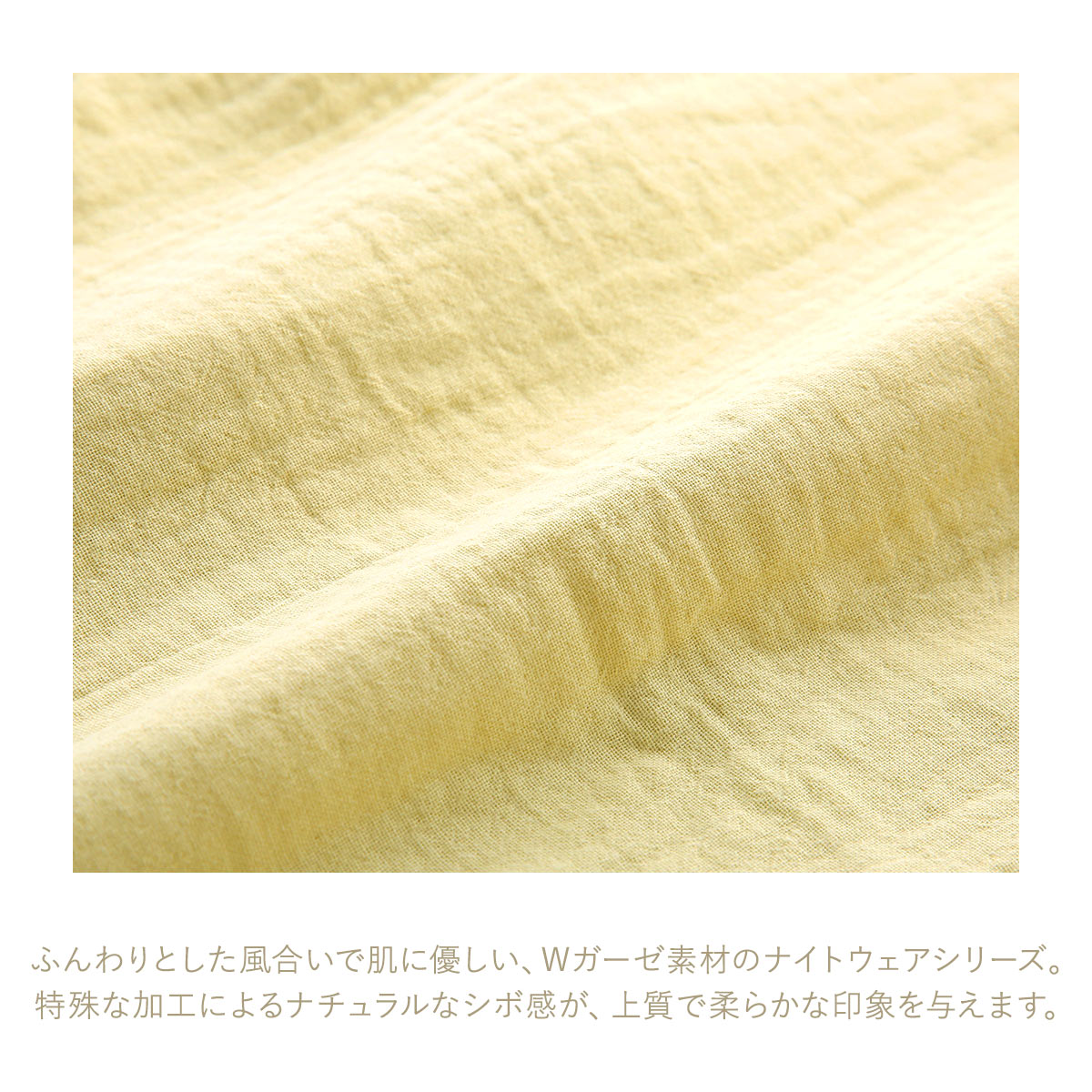 ふんわりとした風合いで肌に優しい、Wガーゼ素材のナイトウェアシリーズです。特殊な加工によるナチュラルなシボ感が、上質で柔らかな印象を与えます。