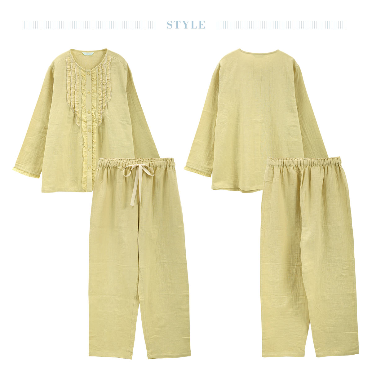2種類の異なる布を重ねたフリル使いが、ナチュラルなムードの中に華やかさをプラスする長袖パジャマ。フリルは裁ち切りにして軽やかさを演出し、前立てと袖口のピコフリルが可愛らしさを添えます。