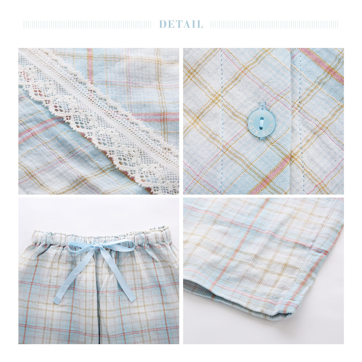 空気を含んだ3重構造のガーゼが、ふんわりと柔らかく優しい着心地を実現。肌側には無撚糸を使用し、さらに肌触りを良く仕上げました。品のある新鮮なオリジナルチェック柄が、リラックスタイムにぴったりです。