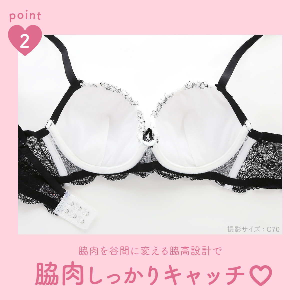 ブラは丸みのきれいなもっちり下厚の内蔵モールドカップ仕様。バストをほどよく寄せてナチュラルなバストラインをメイクします。脇高設計で気になる脇肉もしっかりキャッチ。