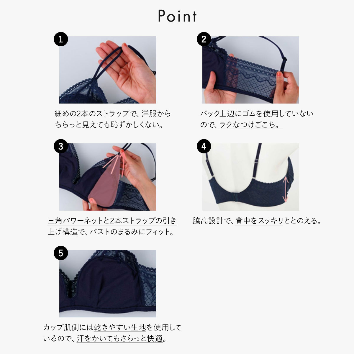 ・三角パワーネットと2本ストラップの引き上げ構造で、バストのまるみにフィット。