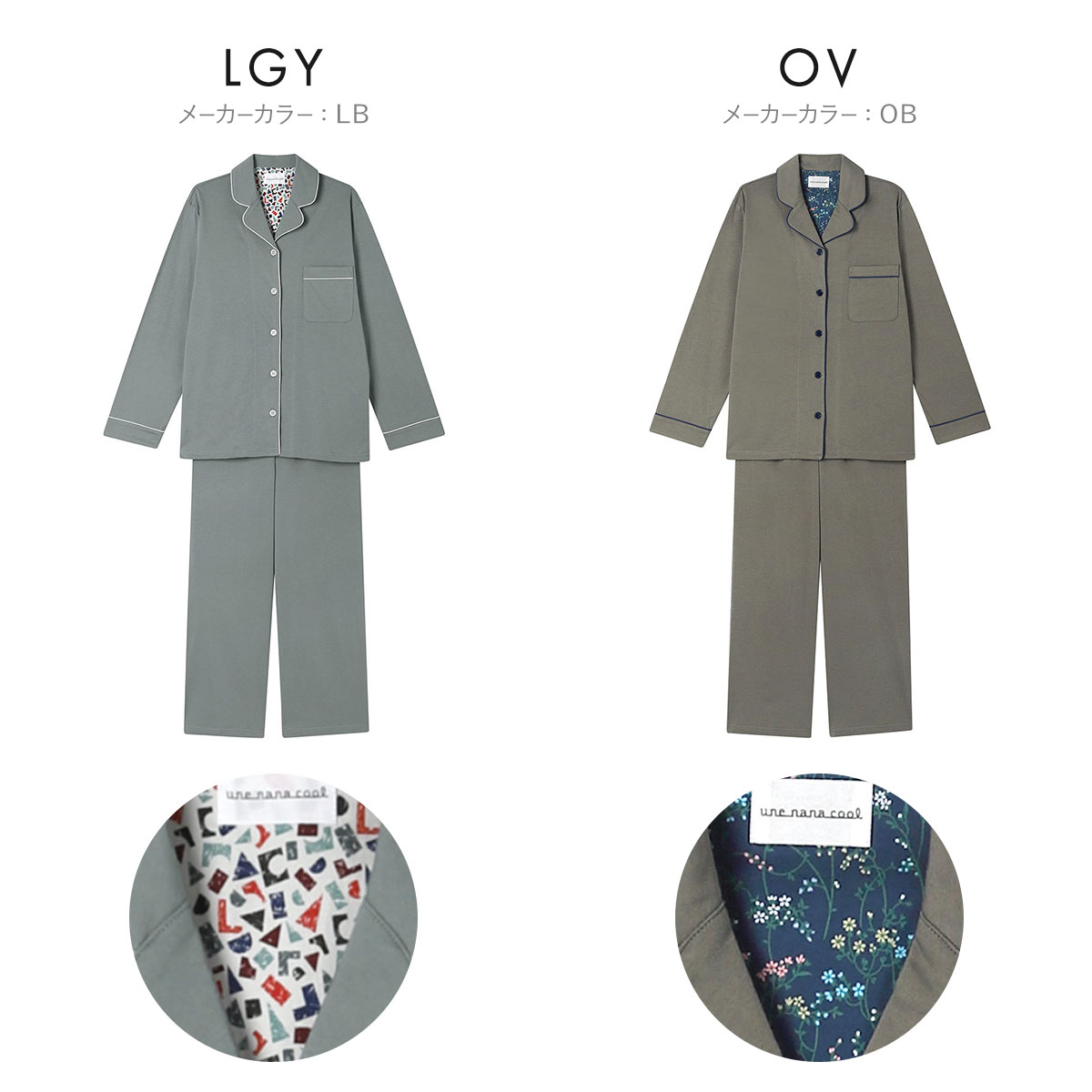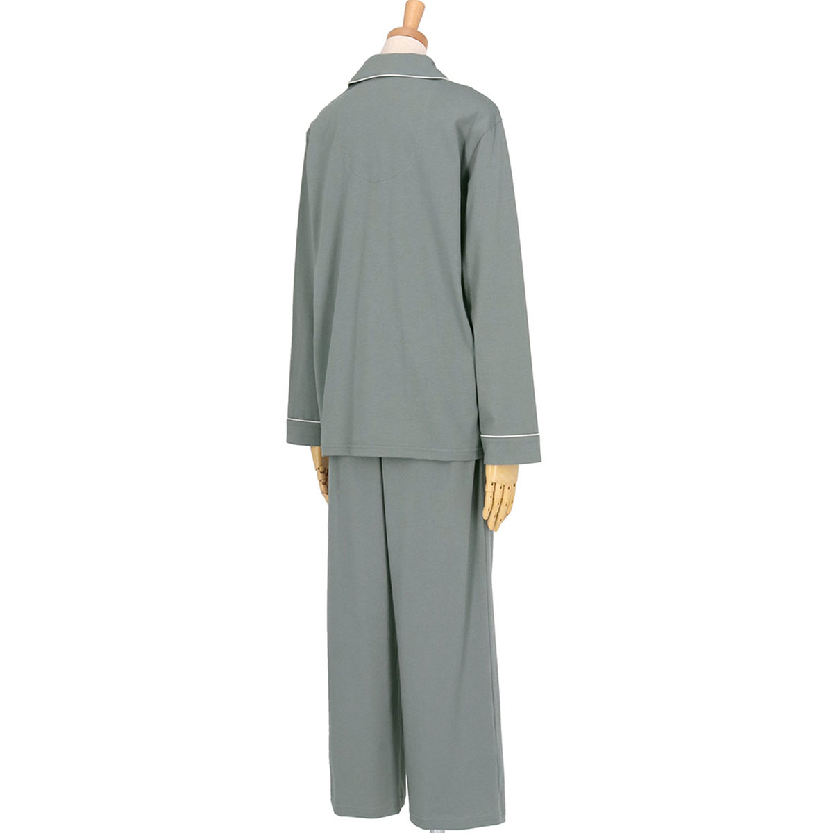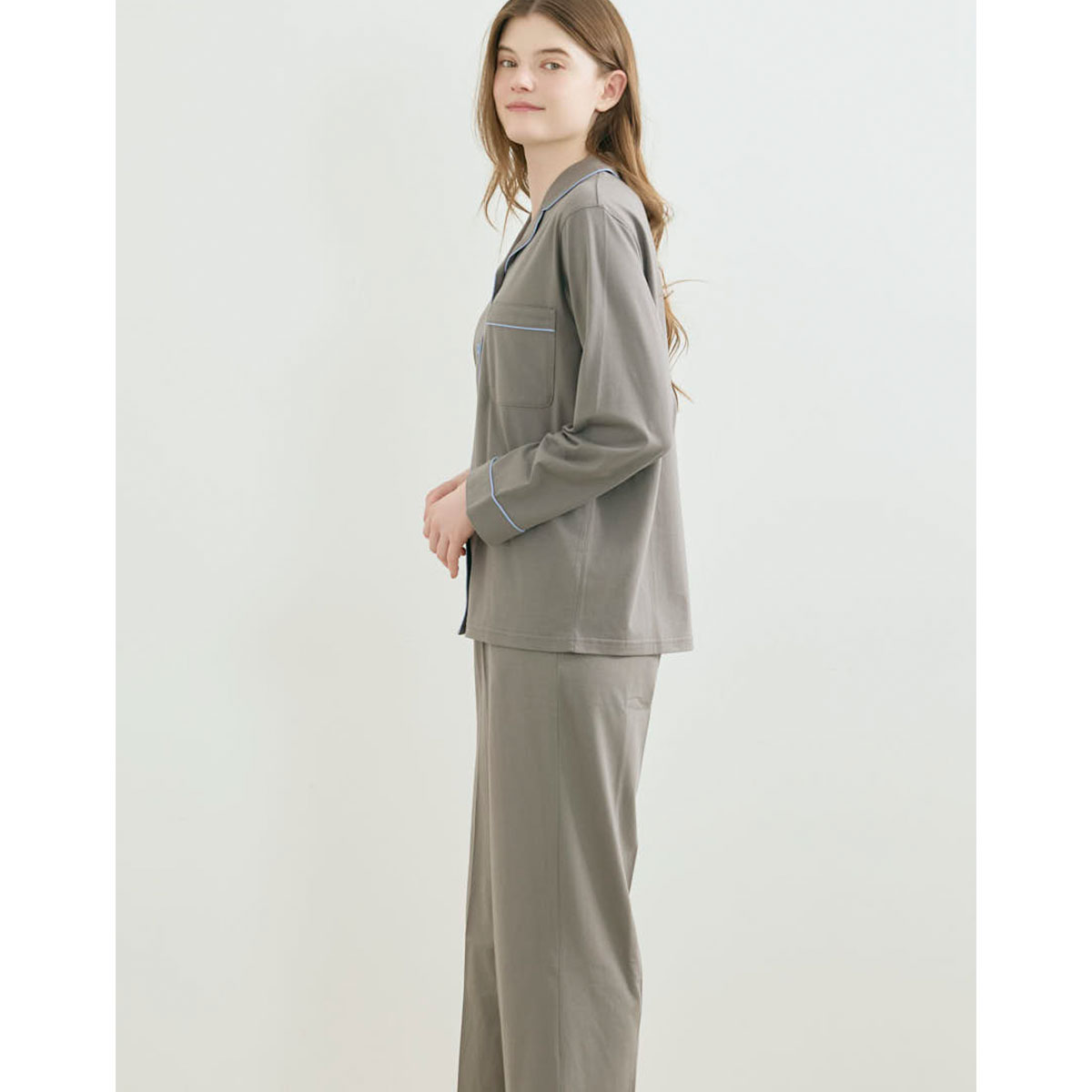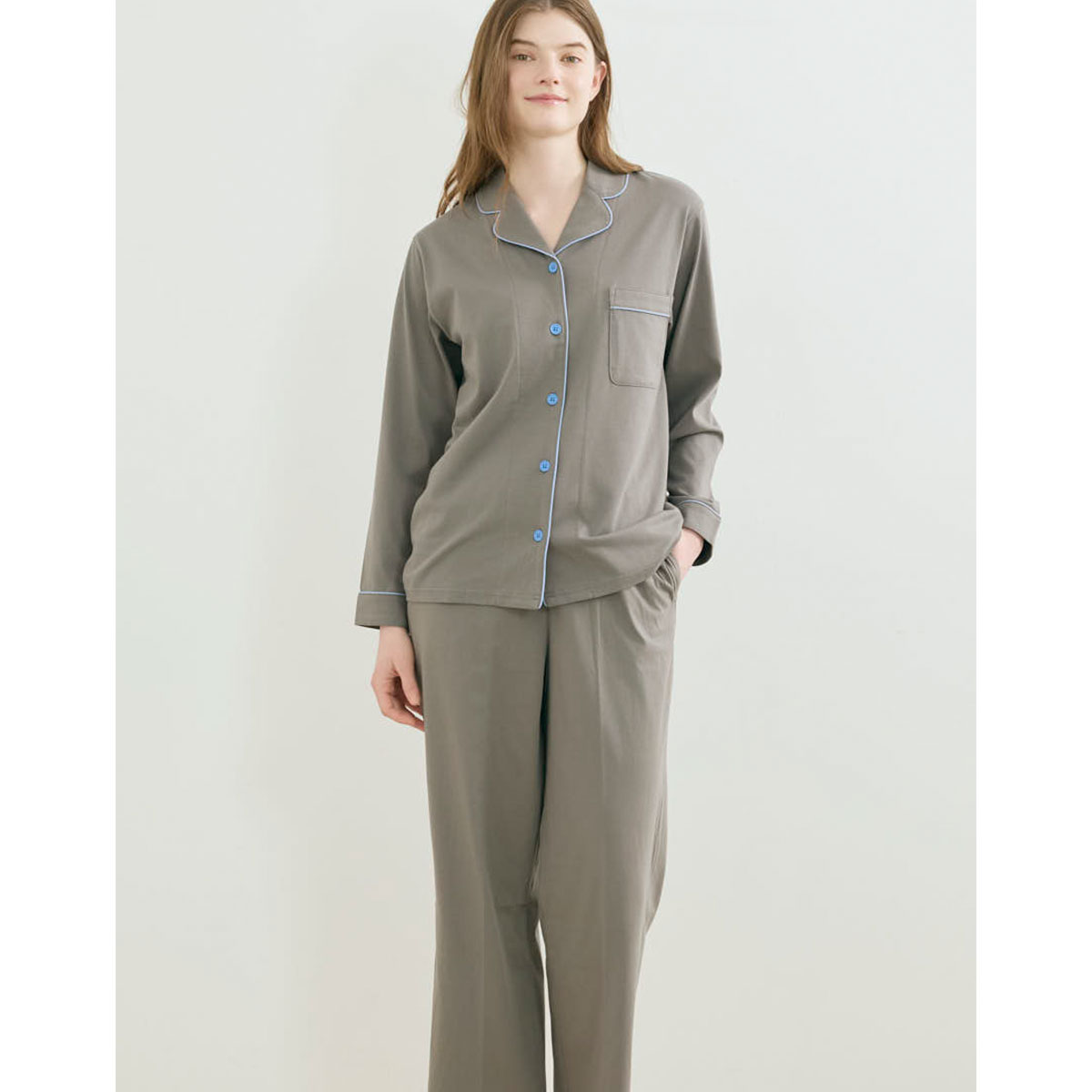 なめらかなハイゲージ素材を使用した開襟シャツの長袖パジャマ。
