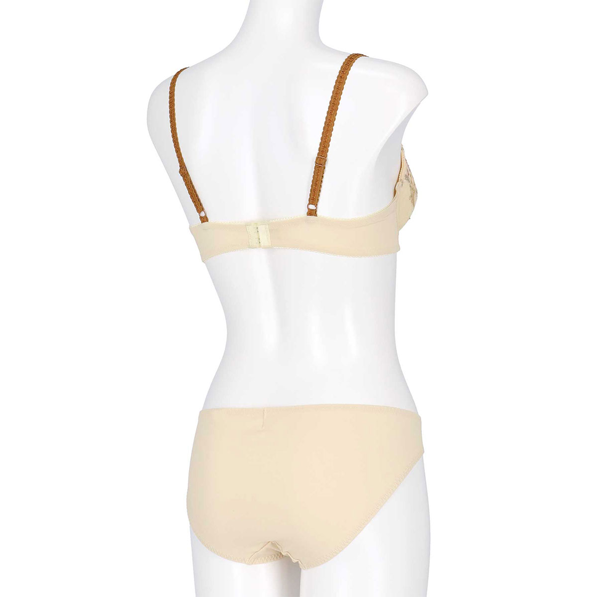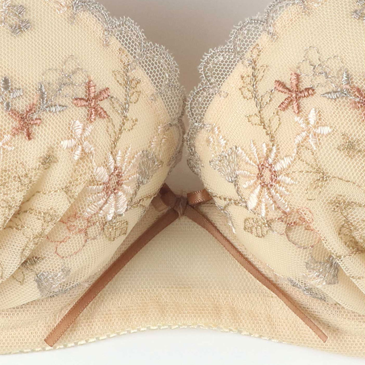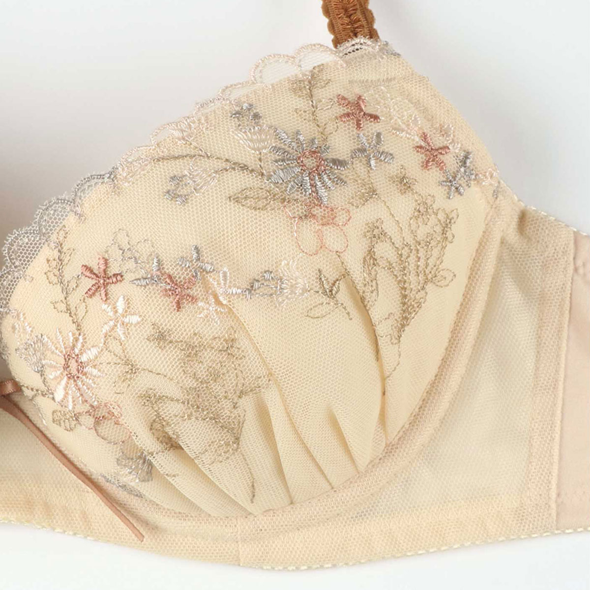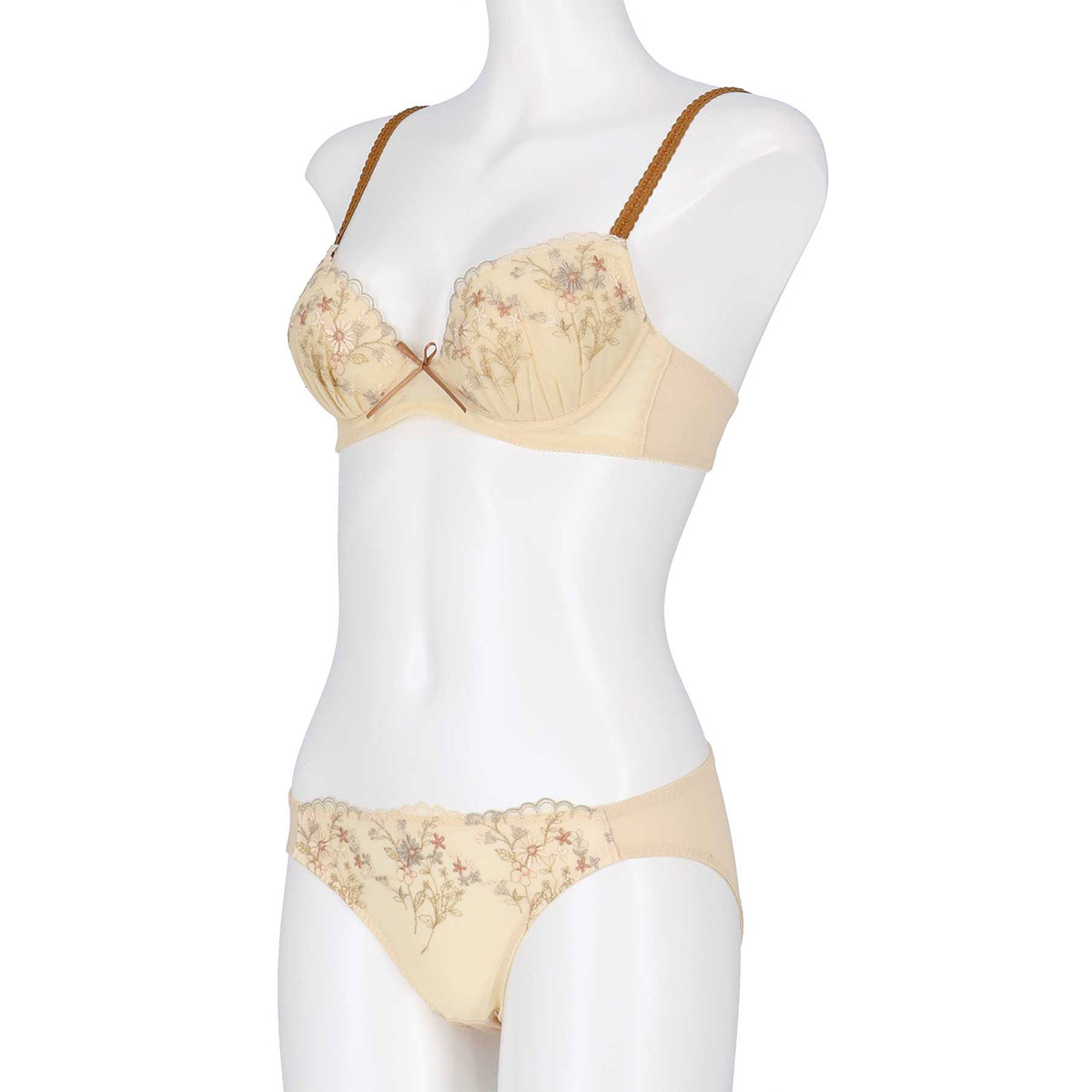 可憐な小花ブーケを多色で表現したエンブロイダリーレースが特徴的な、まる胸メイクのブラ&ショーツセットです。