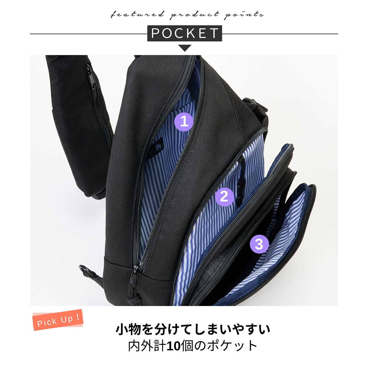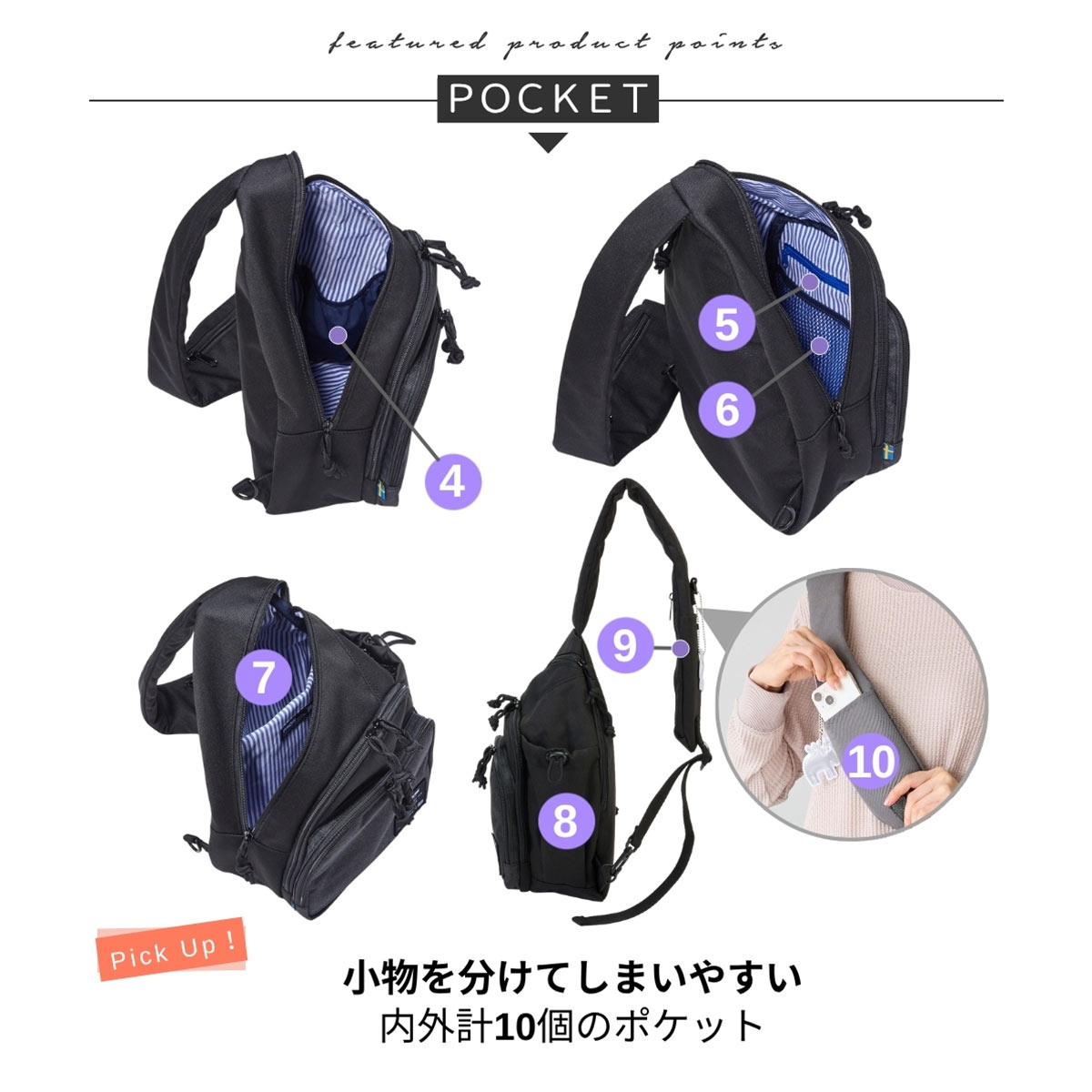 合計10個のポケットで、小物を分けてすっきり収納できます。肩ひもの両面にもポケットが付いており、スマホなどを入れておくのに便利です。