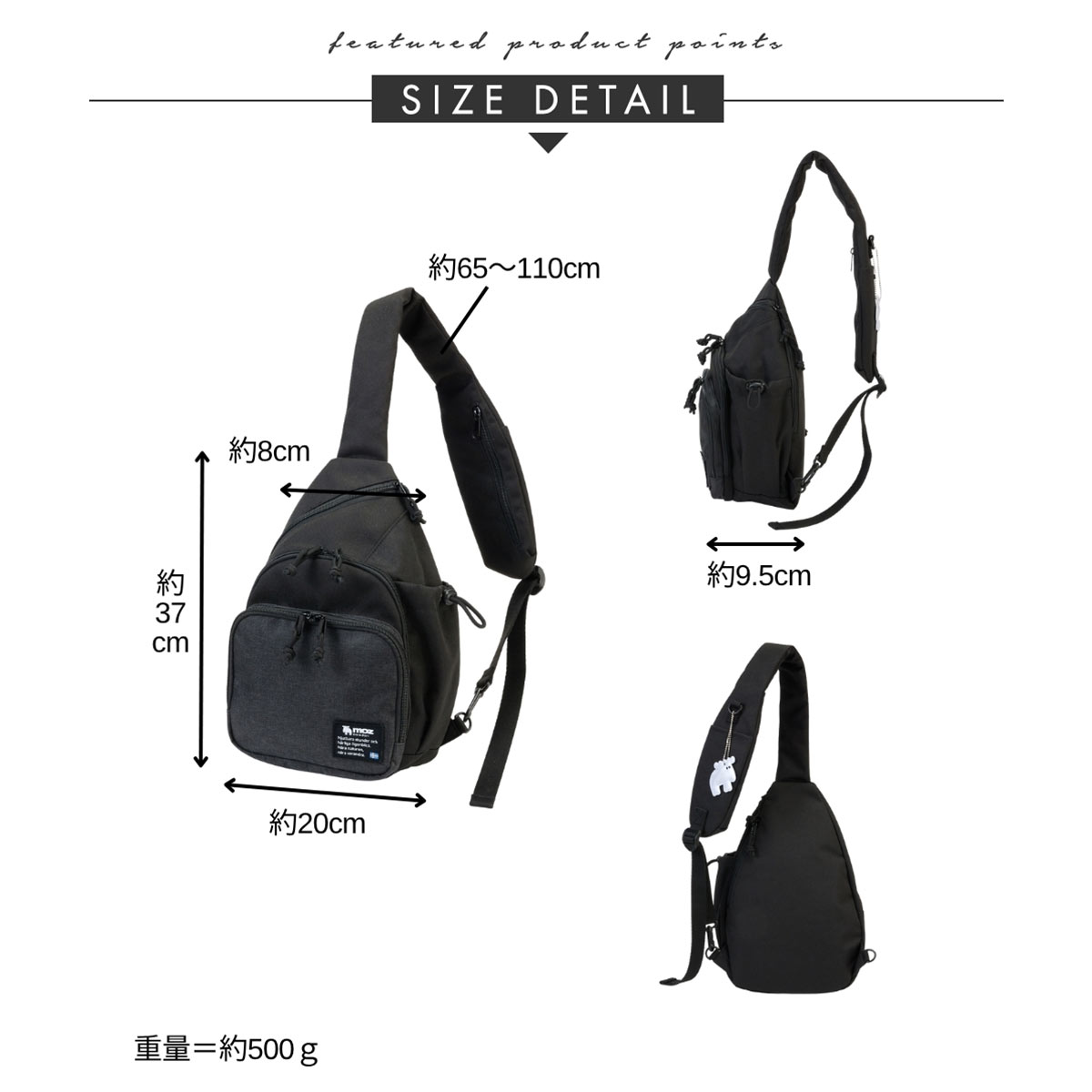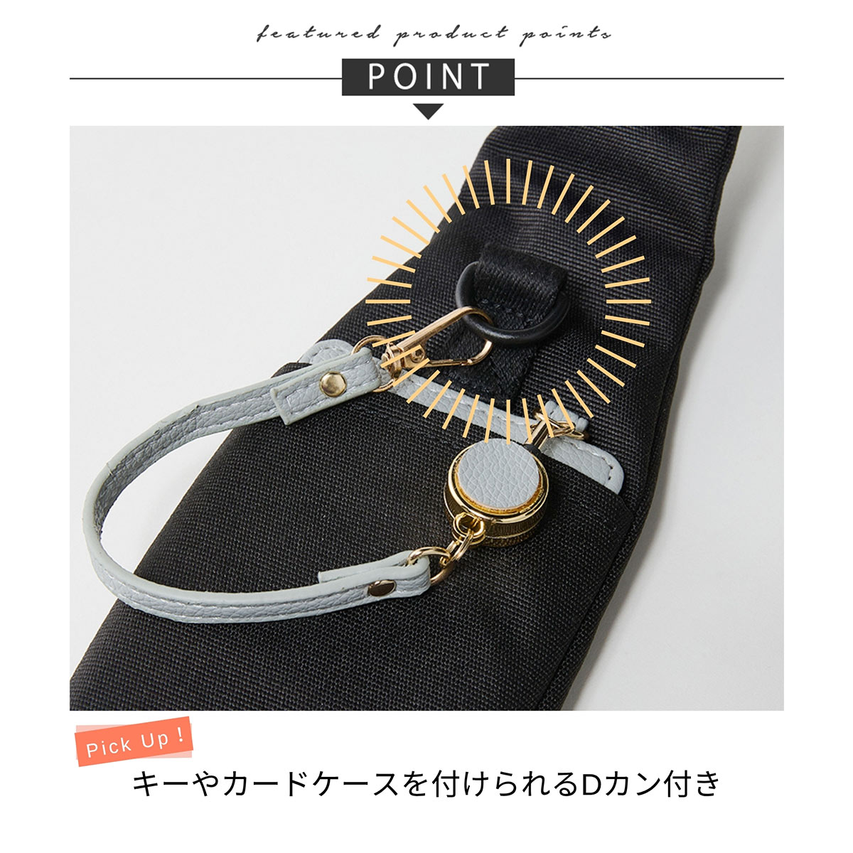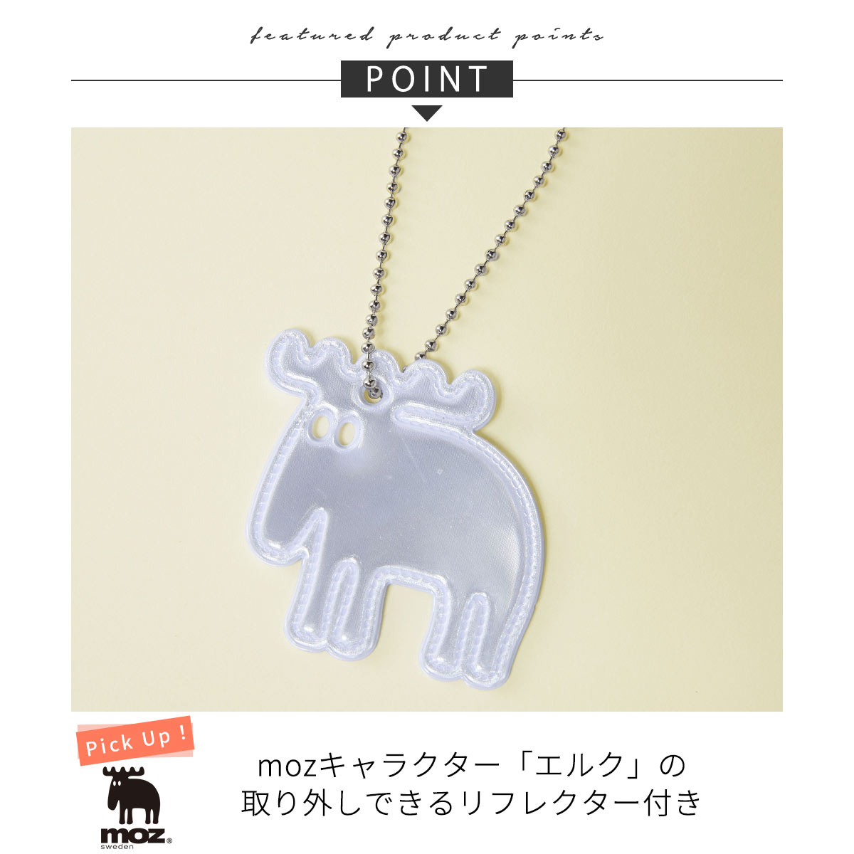 キーやカードケースを付けられるDカン、光を反射するエルクのリフレクターなど、機能性も充実。軽量なので、一日中快適に持ち運べます。