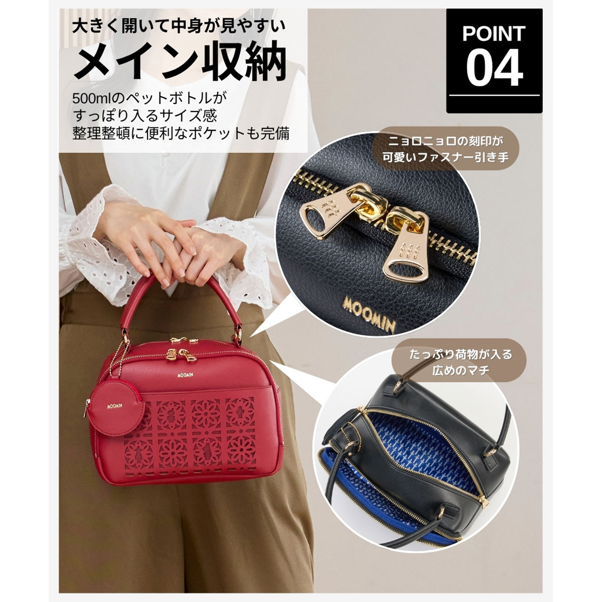 ムーミンキャラクターのシルエットを型抜きした、繊細なデザインが魅力のニッセン2WAYショルダーバッグです。コロンとしたフォルムと上品なフェイクレザー素材が、カジュアルからお呼ばれまで幅広いシーンにマッチします。
