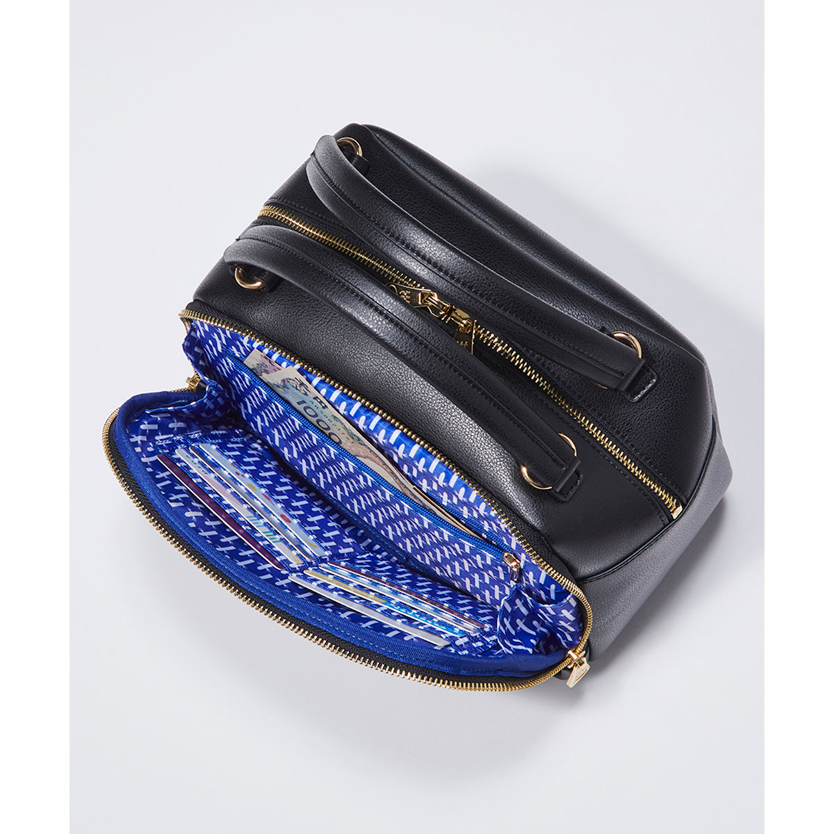 お財布機能付きの前面ポケットには、カードや小銭、お札を整理して収納でき、ミニマルなお出かけをサポート。メイン収納は500mlペットボトルも入る見た目以上の収納力です。