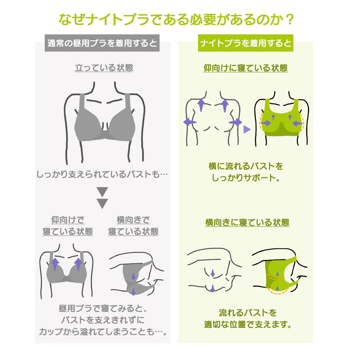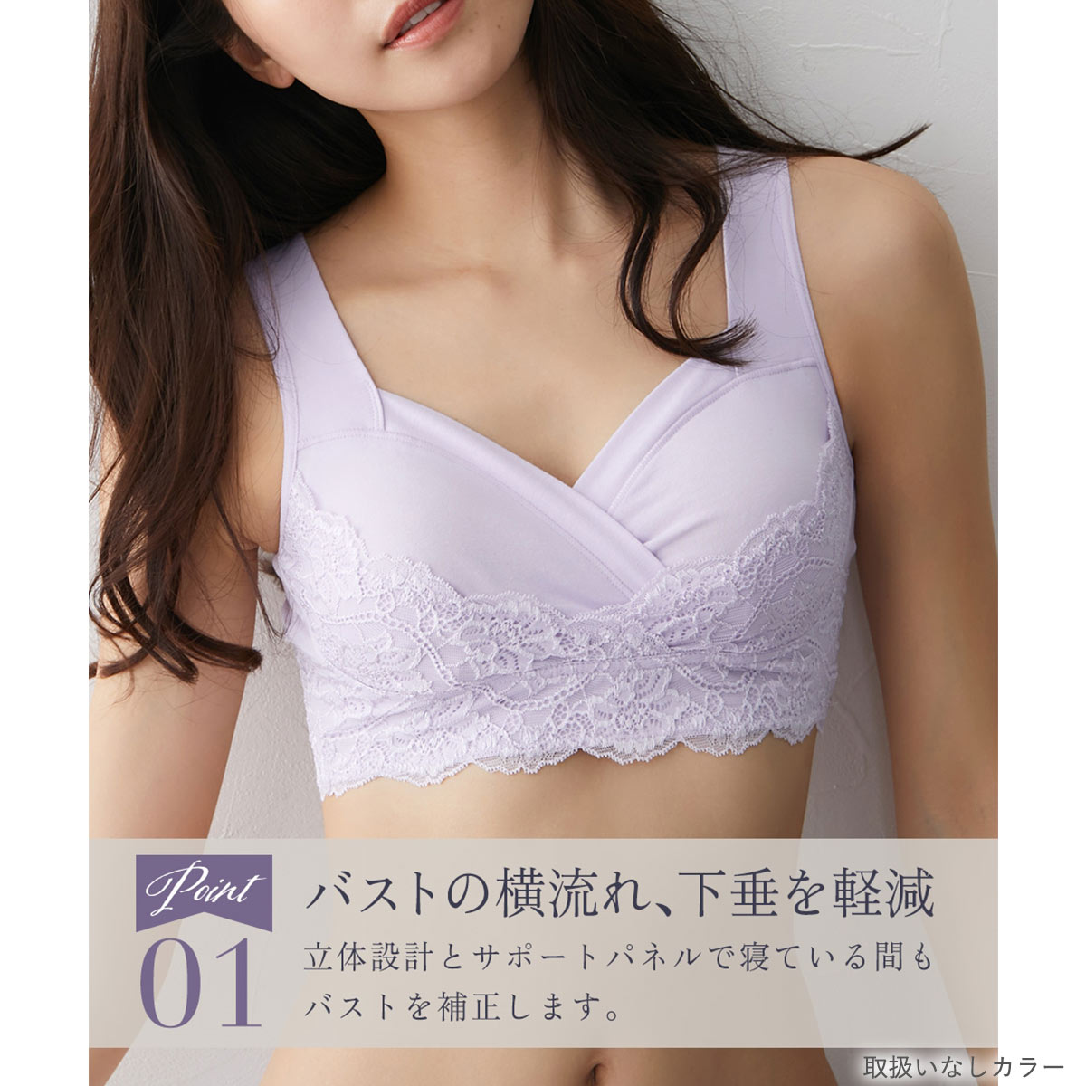 就寝時におすすめの、ニッセンオリジナル「n Dream」シリーズのナイトブラ。ワイヤーやサイドボーンなしでも、クロスアップカシュクールパネルがバストを優しく寄せ上げ、寝返りを打っても流れを防止します。