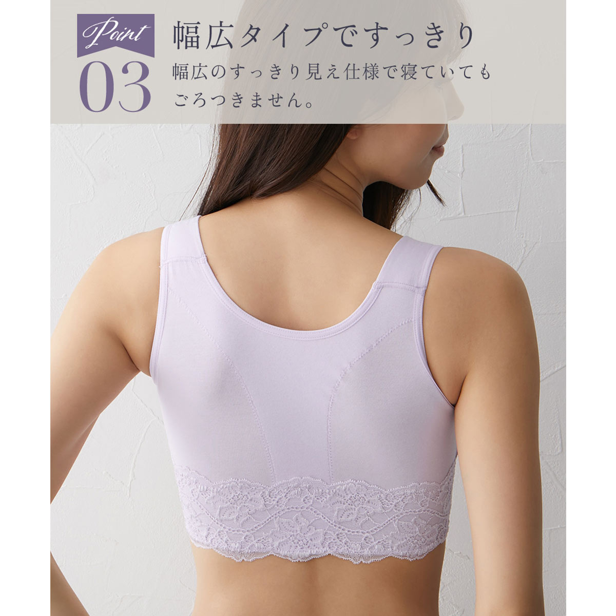幅広ストラップが肩への食い込みを防ぎ、脇高設計で脇のお肉まですっきり整えます。肌に優しい綿混素材で、デリケートな肌にも安心。ノンワイヤーでも安定感を求める方におすすめです。