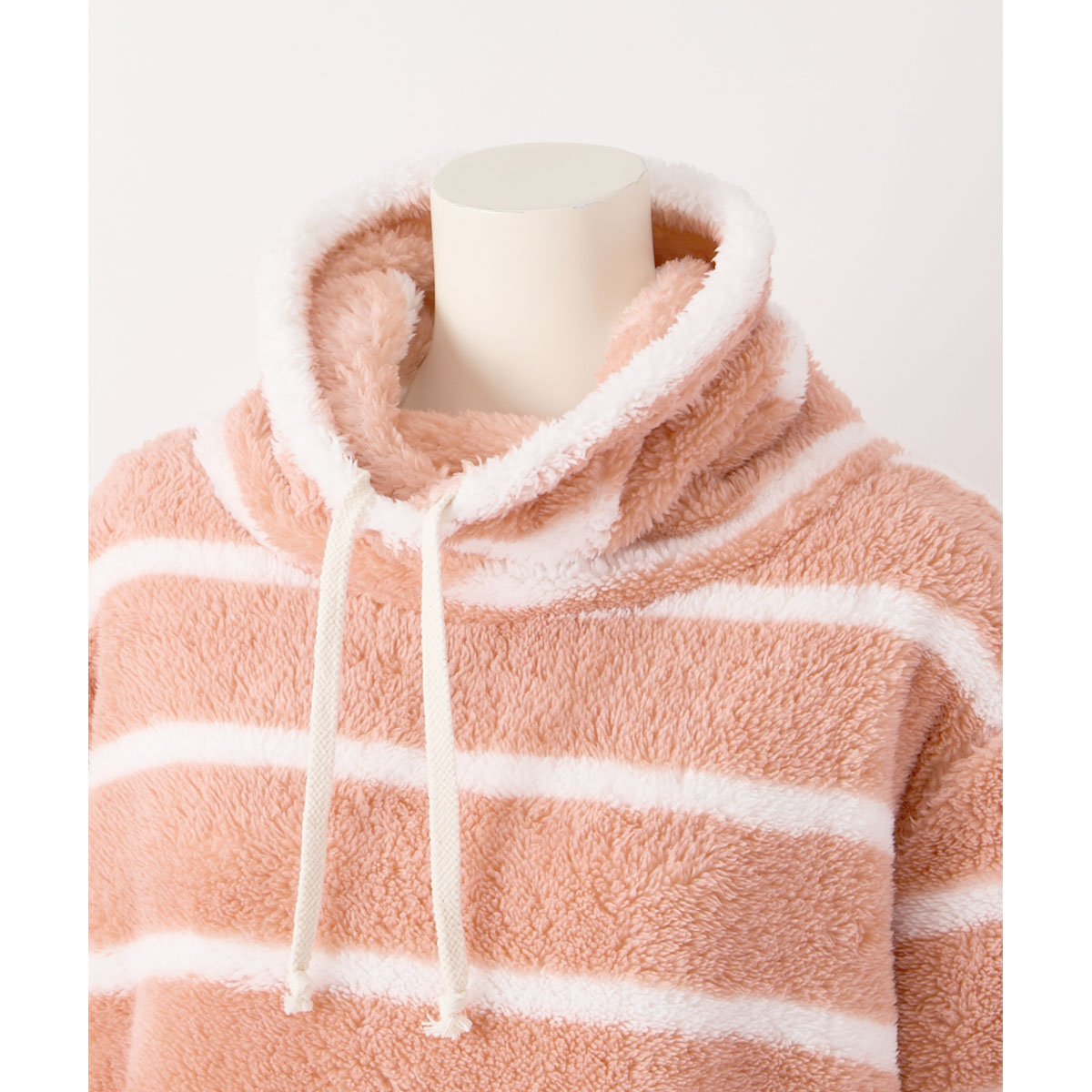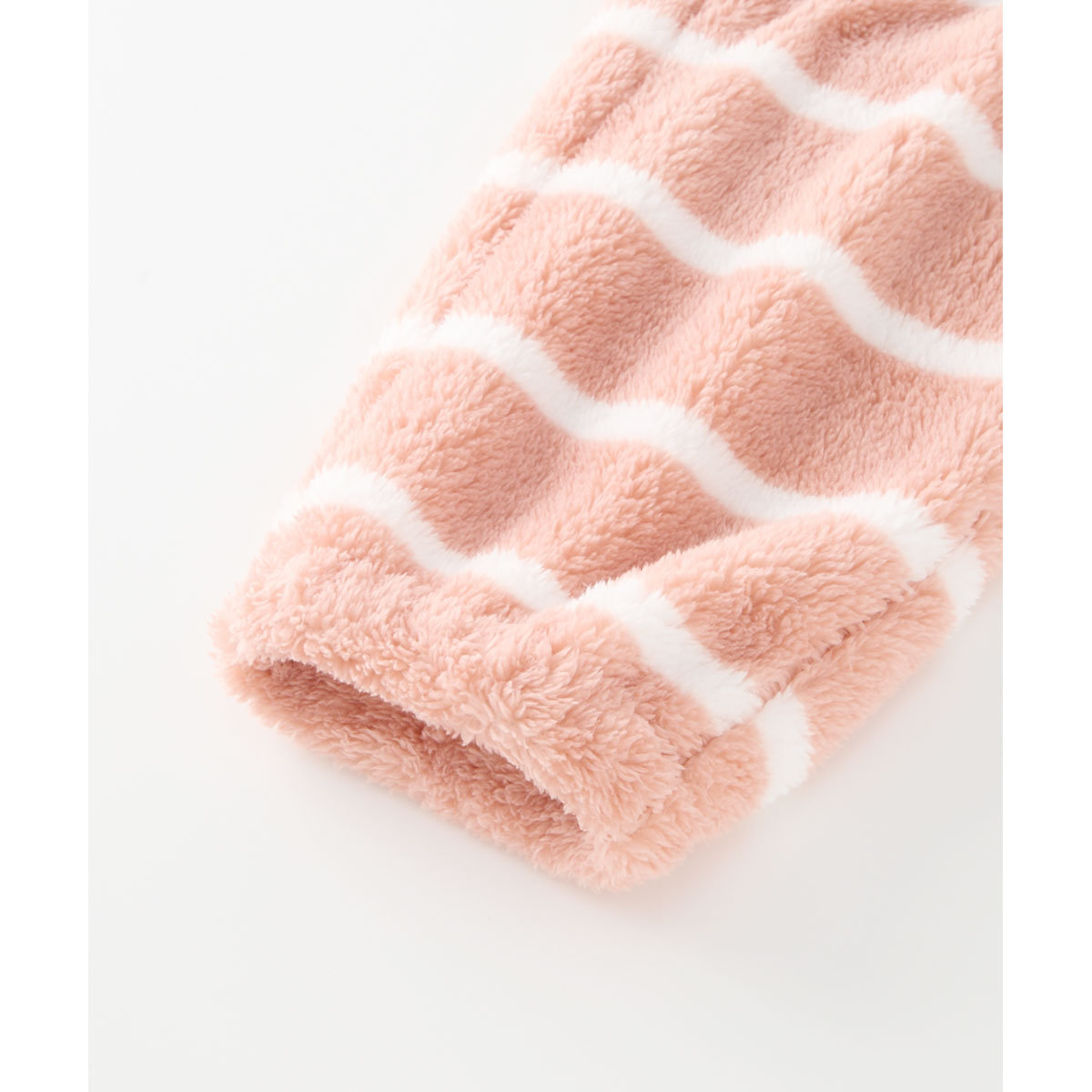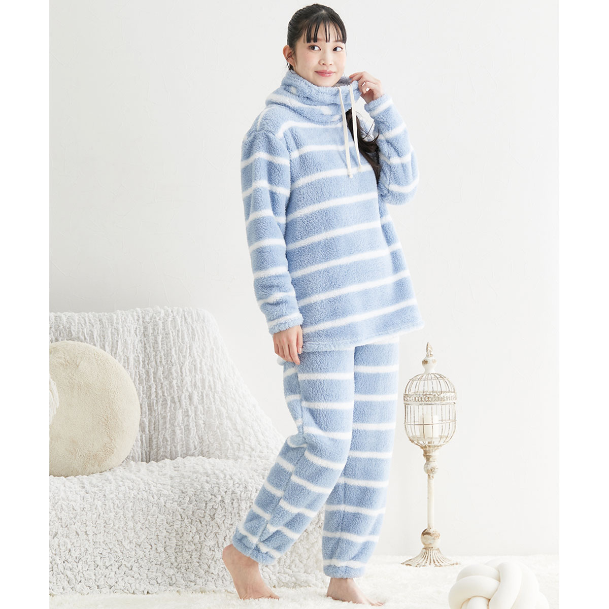 両面ボアのやわらかな肌触りが空気を含み、ボリュームがあるのにふんわり軽い着心地。程よい伸縮性があり、リラックスタイムにぴったりです。