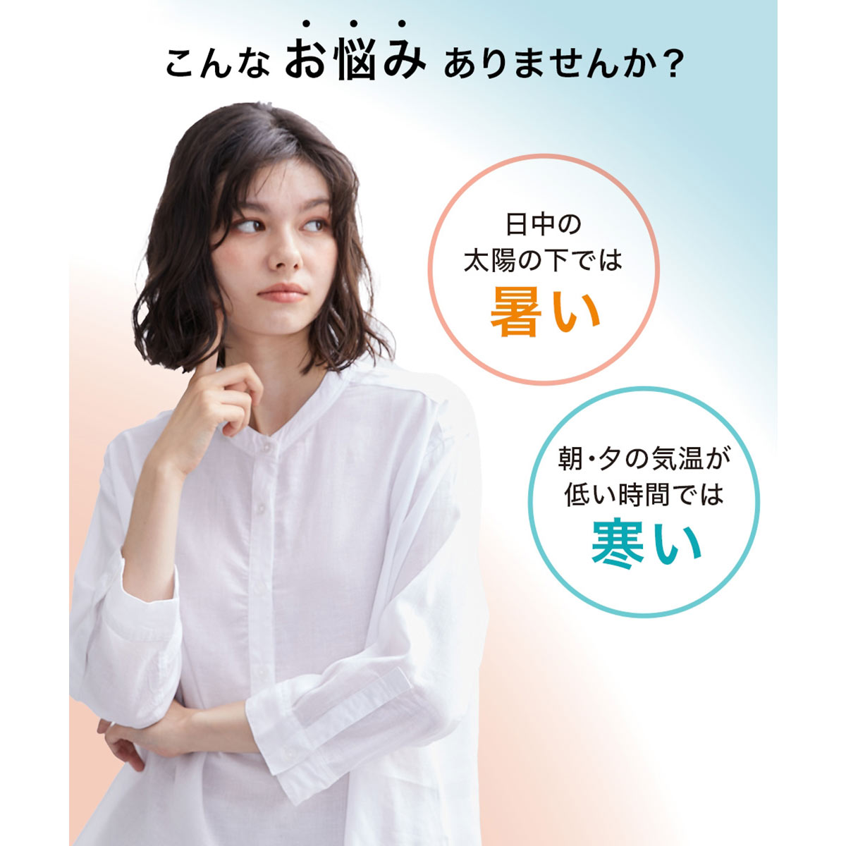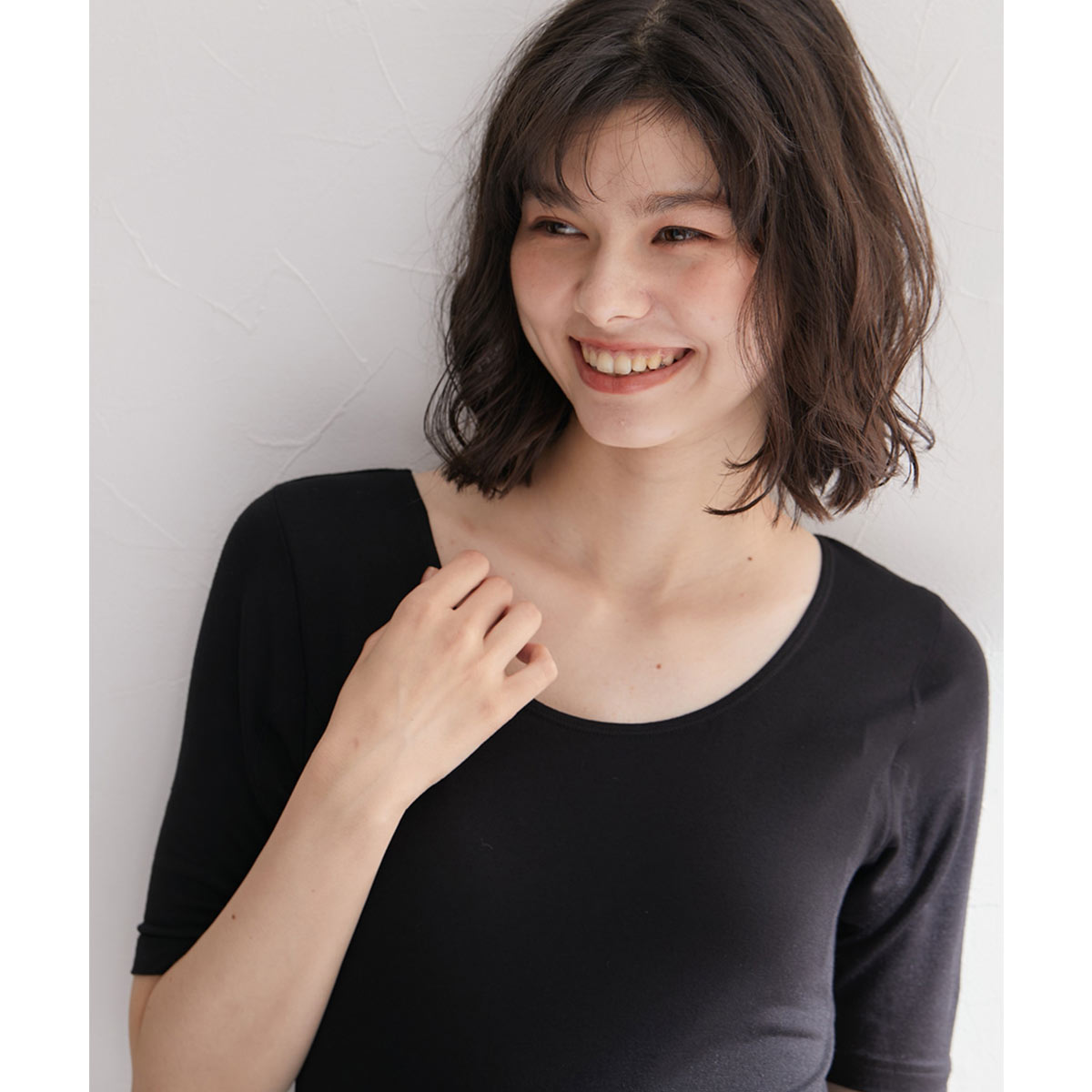 アウターから見えにくい襟ぐりと背中が出にくい長めの丈で、ぴったりフィットしても着ぶくれしません。汗取り付きで、汗をかくシーンも安心。1日を通して気温差がある日や、季節の変わり目におすすめです。