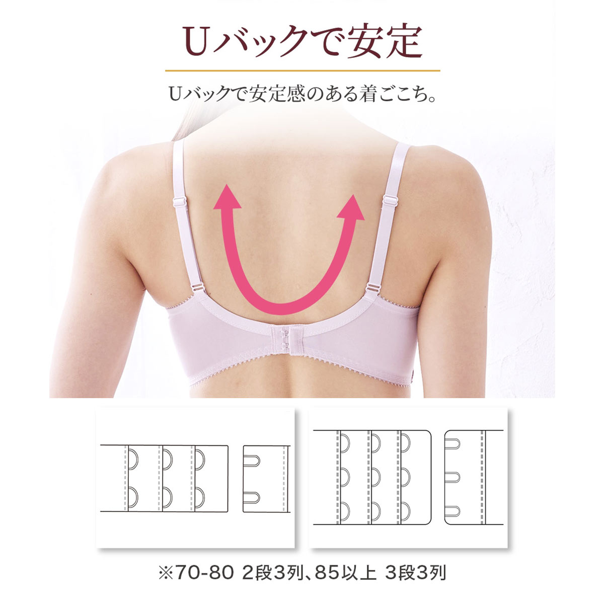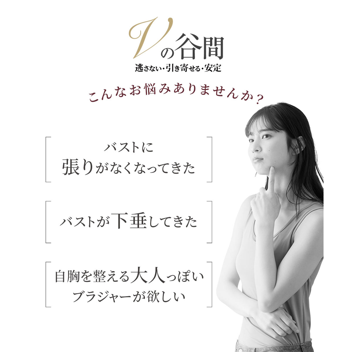 脇に流れやすいバストを、V字ラインとこだわりのカップパターンでしっかり引き寄せ、美しいバストラインをメイク。前中心は低めのL字ワイヤーを採用し、「私の胸ってこんなにきれいだった?」 と思わず見惚れるほどのシルエットを実現します。
