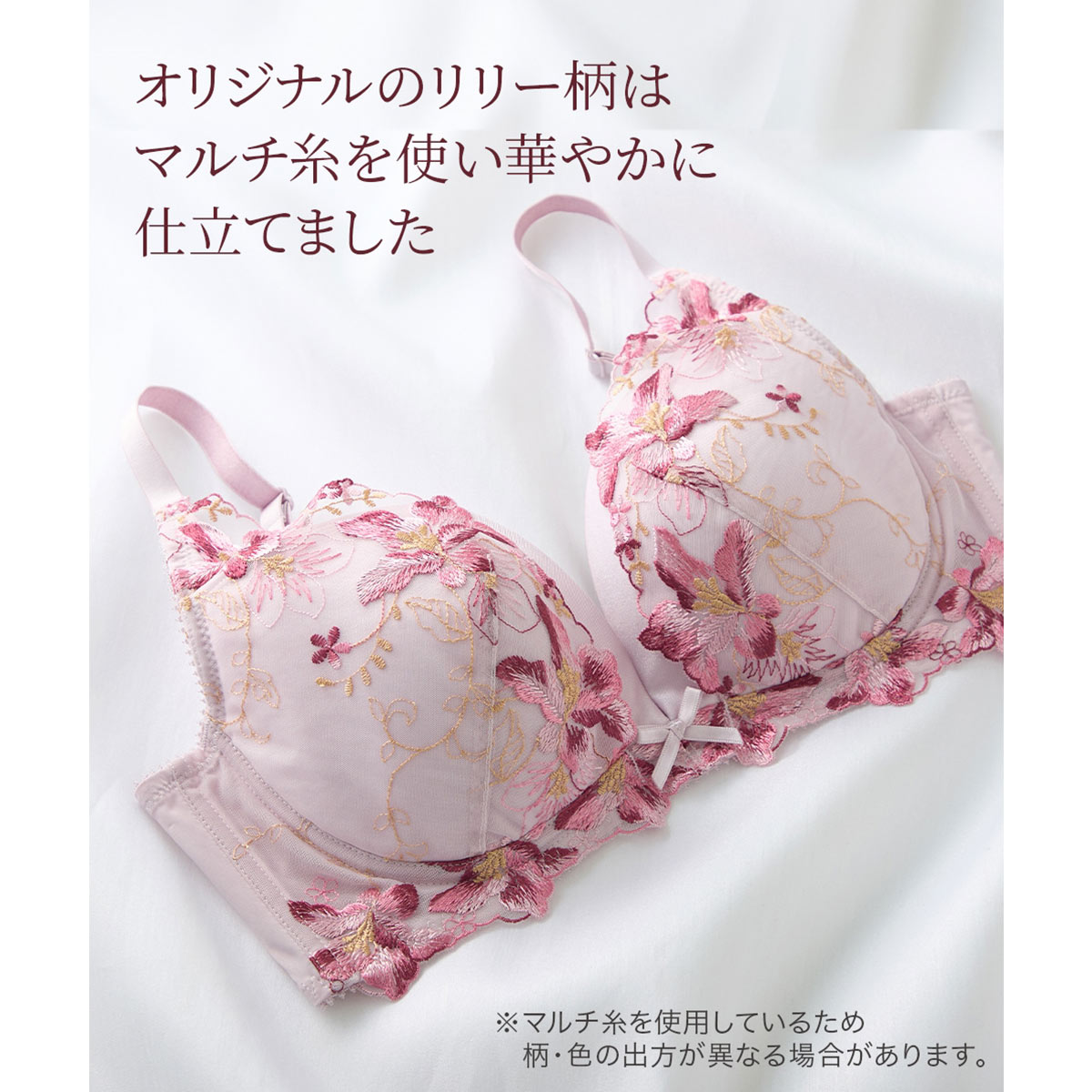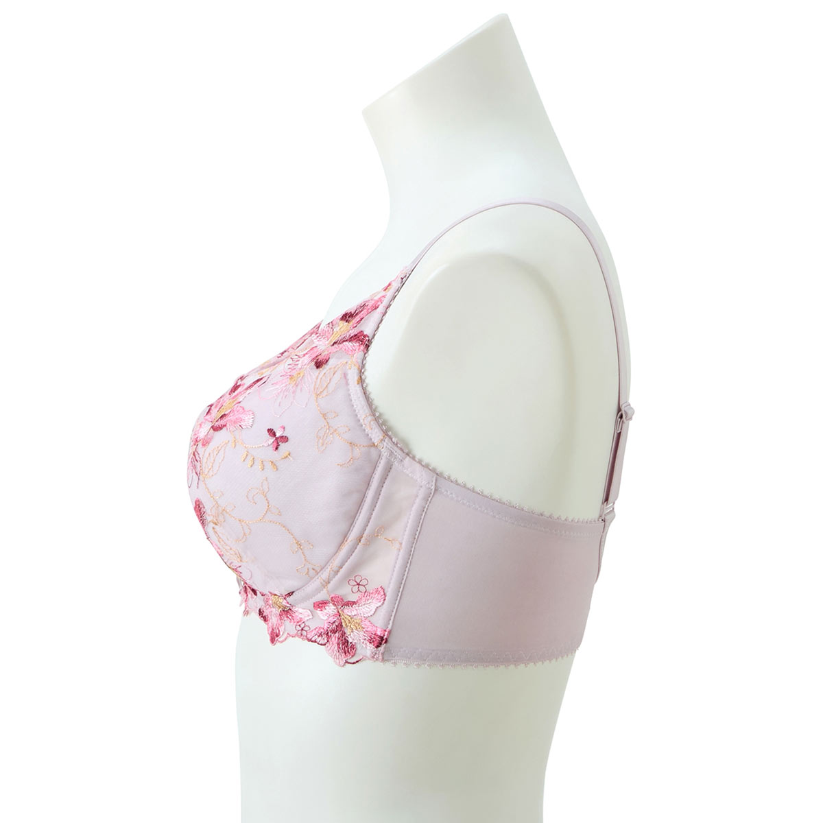 大胆なオリジナル花柄レースとマルチカラーの刺しゅう糸が、バストを華やかに彩ります。アンダーバストまで柄が入った豪華な仕上がり。コーディネートできるショーツ(C47BKR325B02)は別売りです。