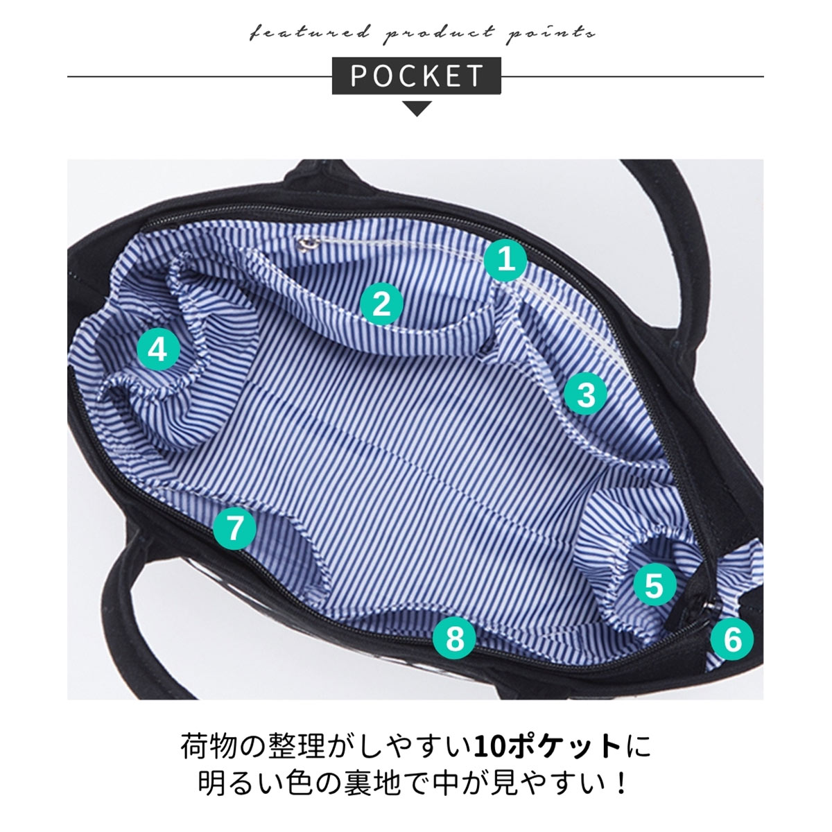 内外に合計10個のポケットが付いているので、荷物が迷子になりがちな方でもすっきり収納できます。A4サイズ対応で、ファイルや書類もすっぽり入るため、デイリーユースにぴったりです。