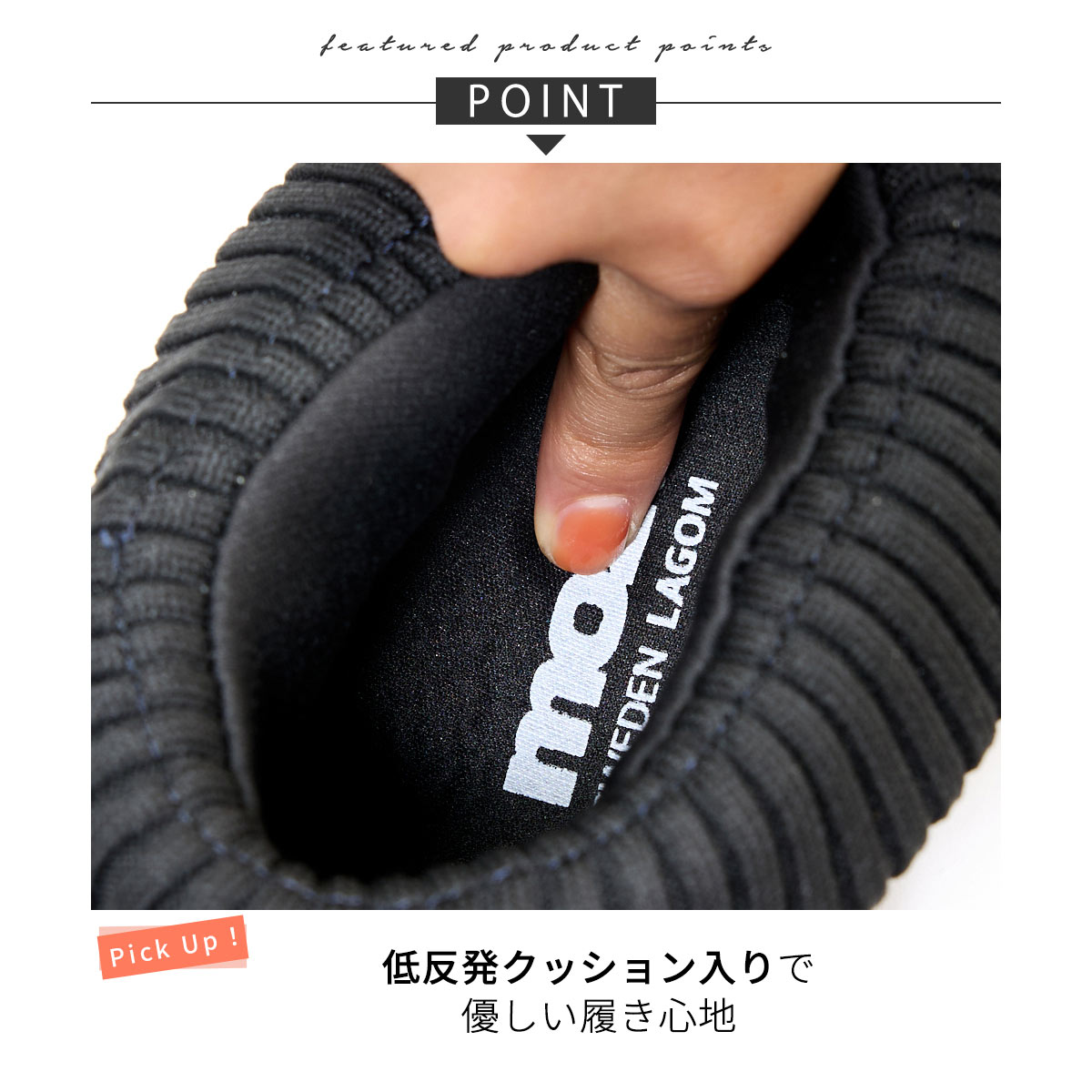 片足約220gと驚くほどの軽さで、屈曲性の良いソールが足裏に馴染み、快適な歩行をサポートします。履き口はリブニットで伸縮性があり、脱ぎ履きもスムーズ。ベルト内側の隠しゴムも便利なポイントです。
