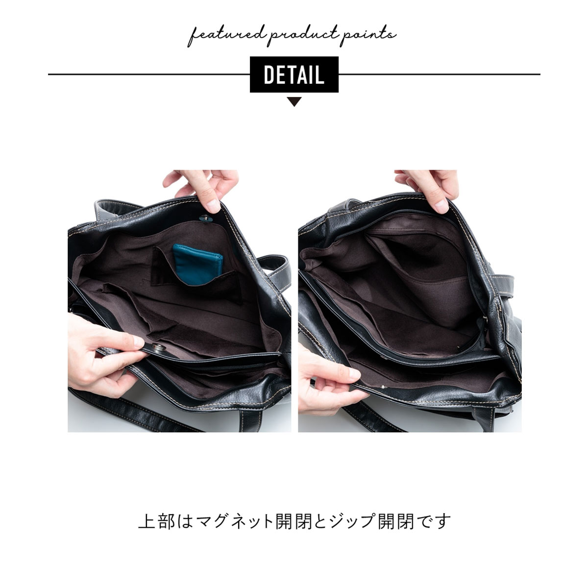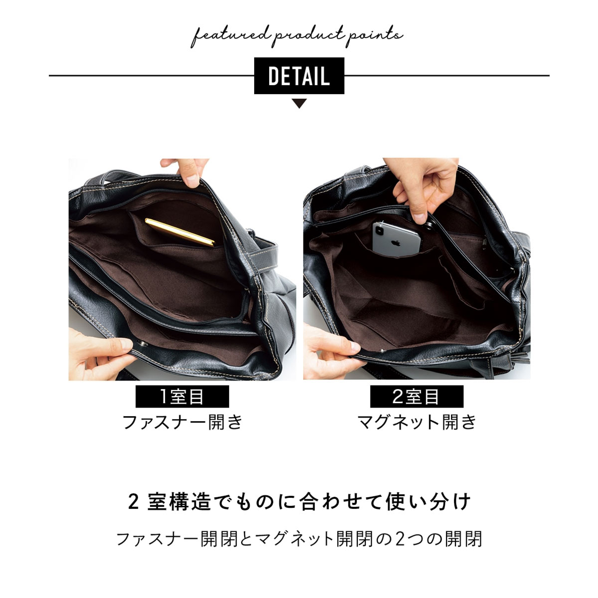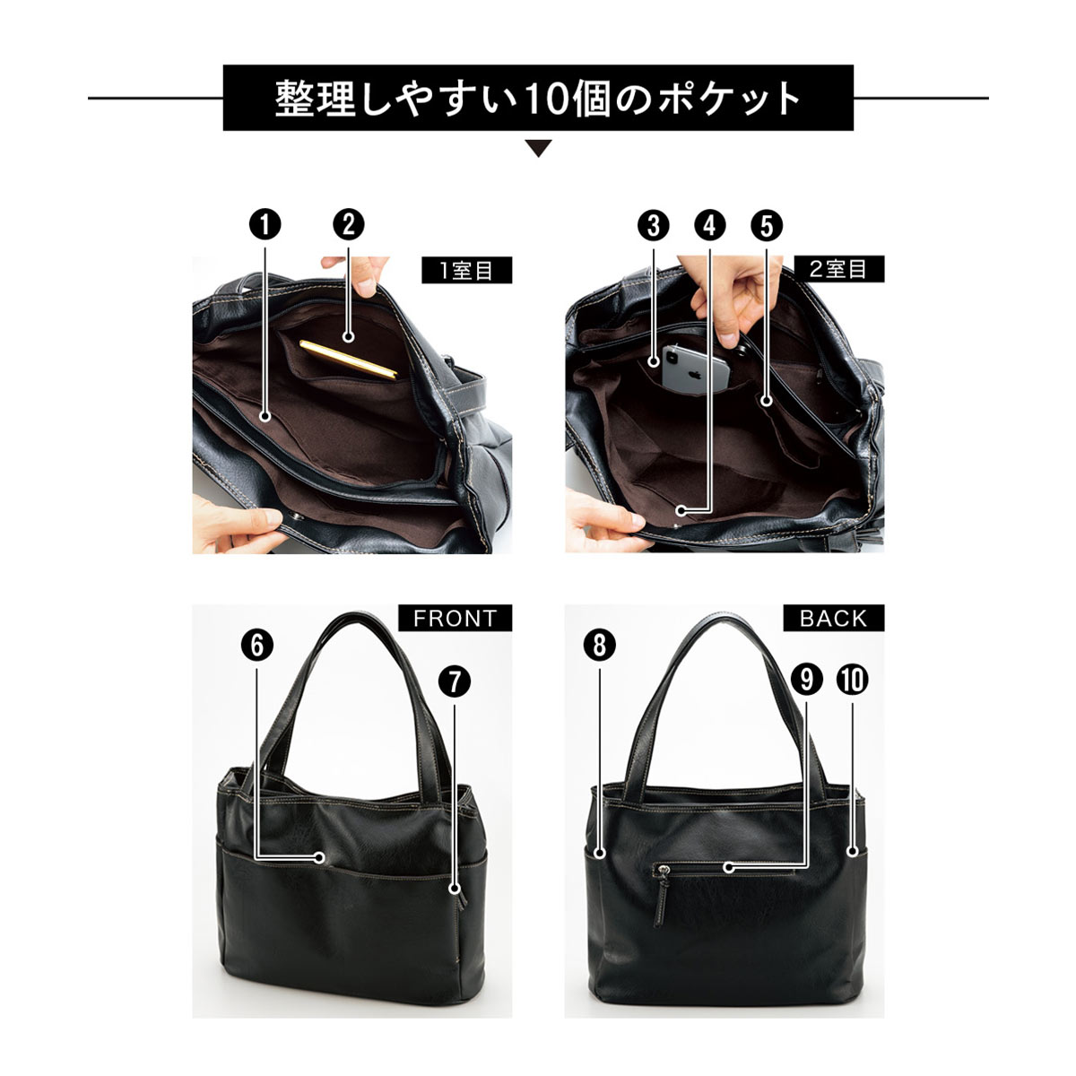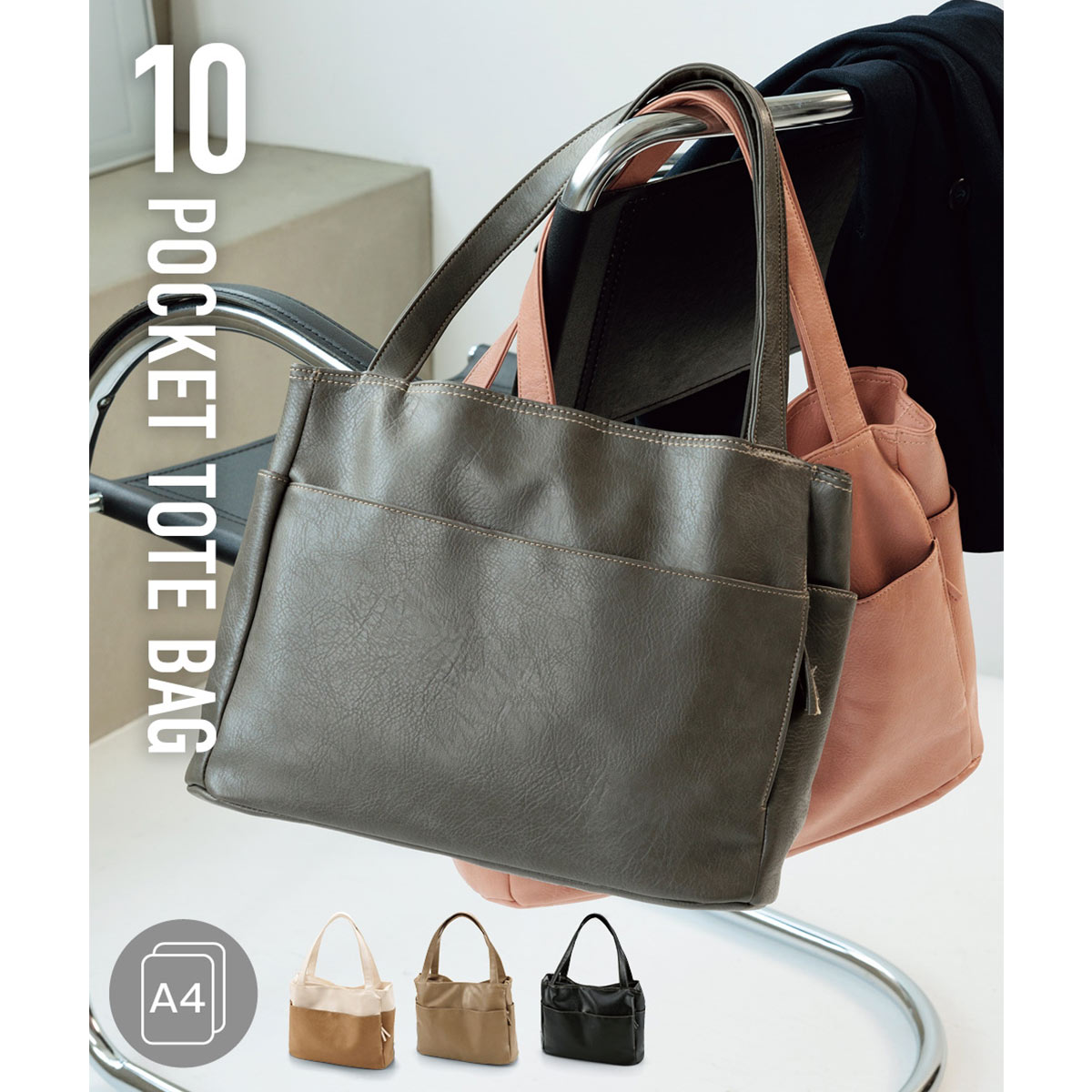 人気の多収納トートバッグが、10ポケットになってリニューアル。A4サイズも楽々入る大容量で、通勤や通学にぴったりのバッグです。