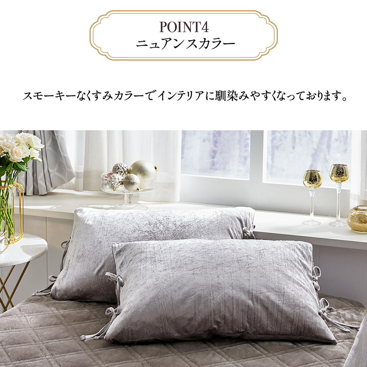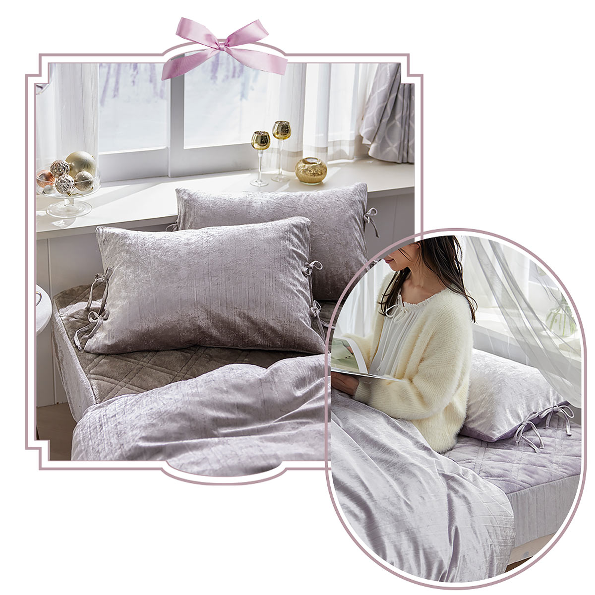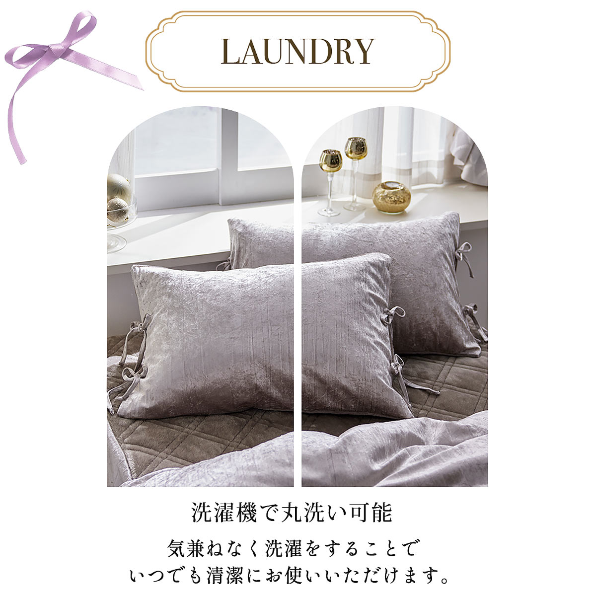 細リボンを4か所に施し、大人可愛い世界観を演出。スモーキーなニュアンスカラーがインテリアに馴染みます。