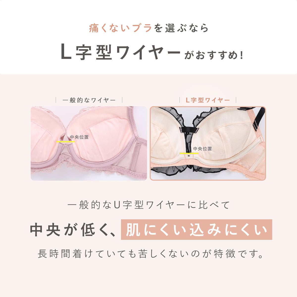 フロントは低めのL字ワイヤーで、体に当たりにくい着心地。脇はサイドボーン、伸び止め素材の裏打ちで、軽さと安定感を実現。バックはストレッチレースを使用し、締め付けすぎない着用感になっています。