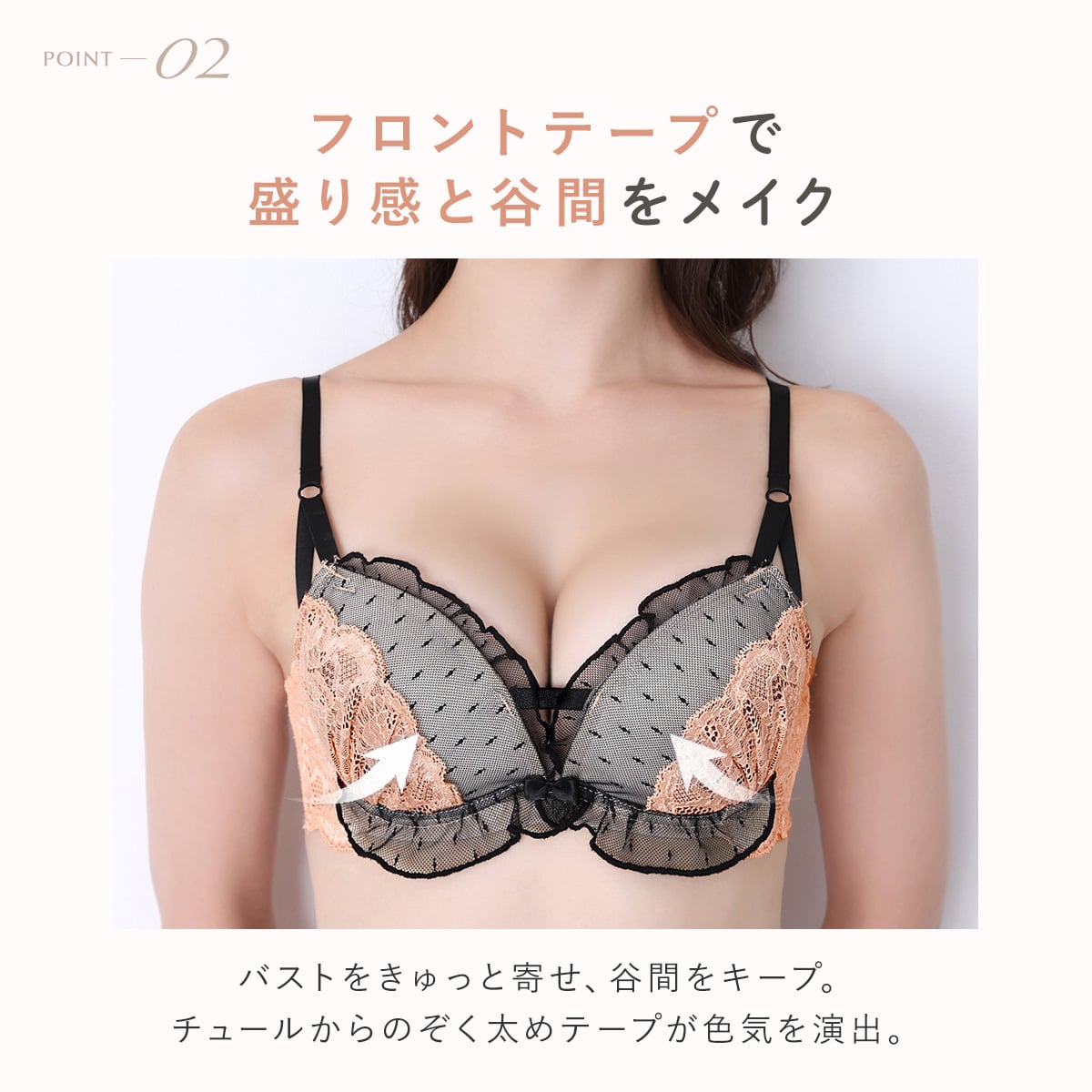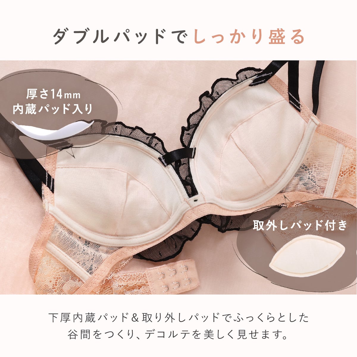 カップ下のフリルがあざといブラジャーは、14㎜の下厚内蔵パッドと取り外し可能なパッドのW効果でしっかりボリュームアップ。二股ストラップで胸を中心にキープし、フリルに隠した前中心のテープでむぎゅっと谷間メイク!