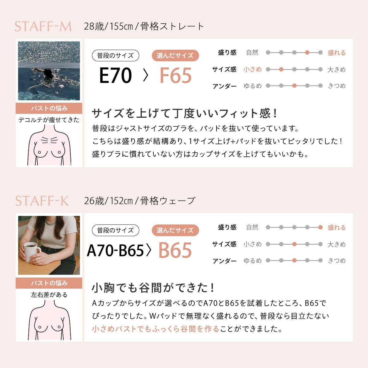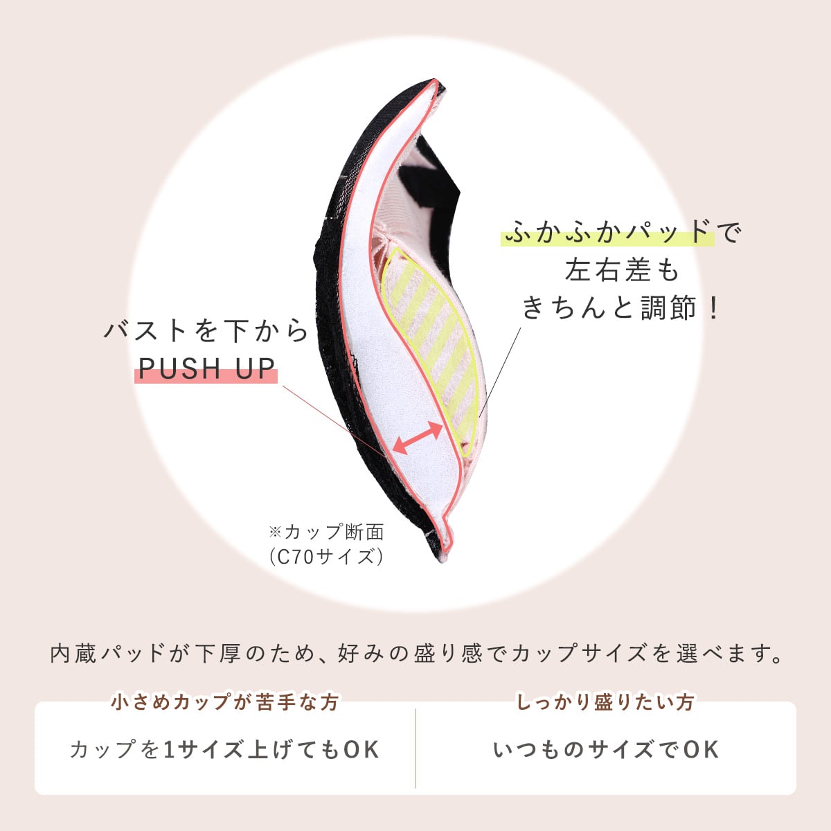 14㎜の下厚内蔵パッド入りの小さめカップです。薄手パッドをお好みの方、胸の収まりが気になる方は1サイズ上のカップサイズがオススメです。下厚内蔵パッドとは別に、取外しパッドでボリューム調節も可能です。
