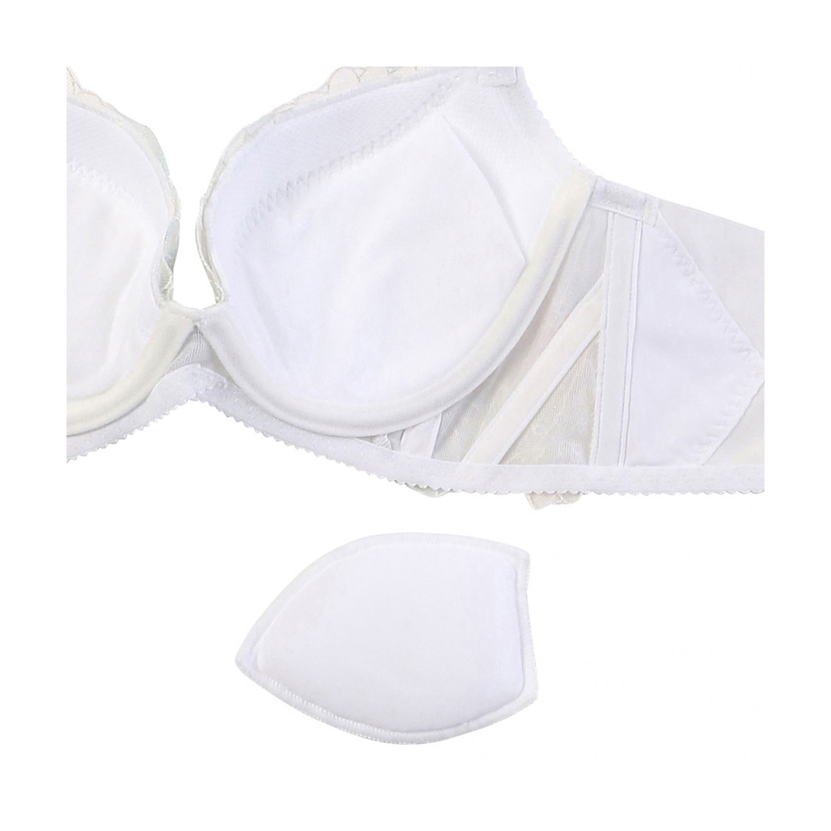 最大の特長は、サイドをすっきりと整える補整力。脇高・幅広設計と長めのボーンがバストをしっかり支え、気になる脇の段差を抑えて後ろ姿までスマートに見せます。低めの前中心とカップ内側の保形パーツにより、バストを中央へ寄せてくっきりとした美しい谷間をキープします。
