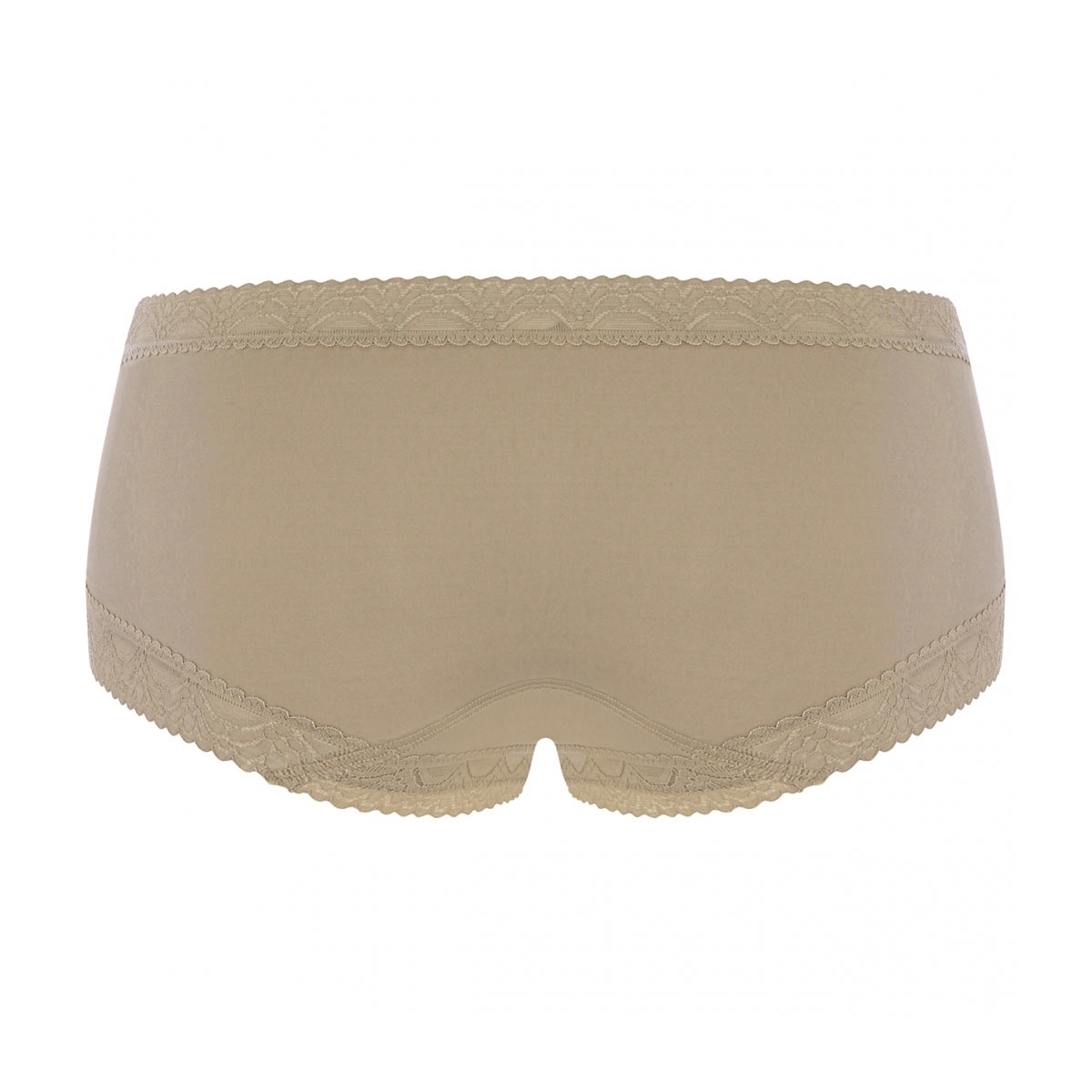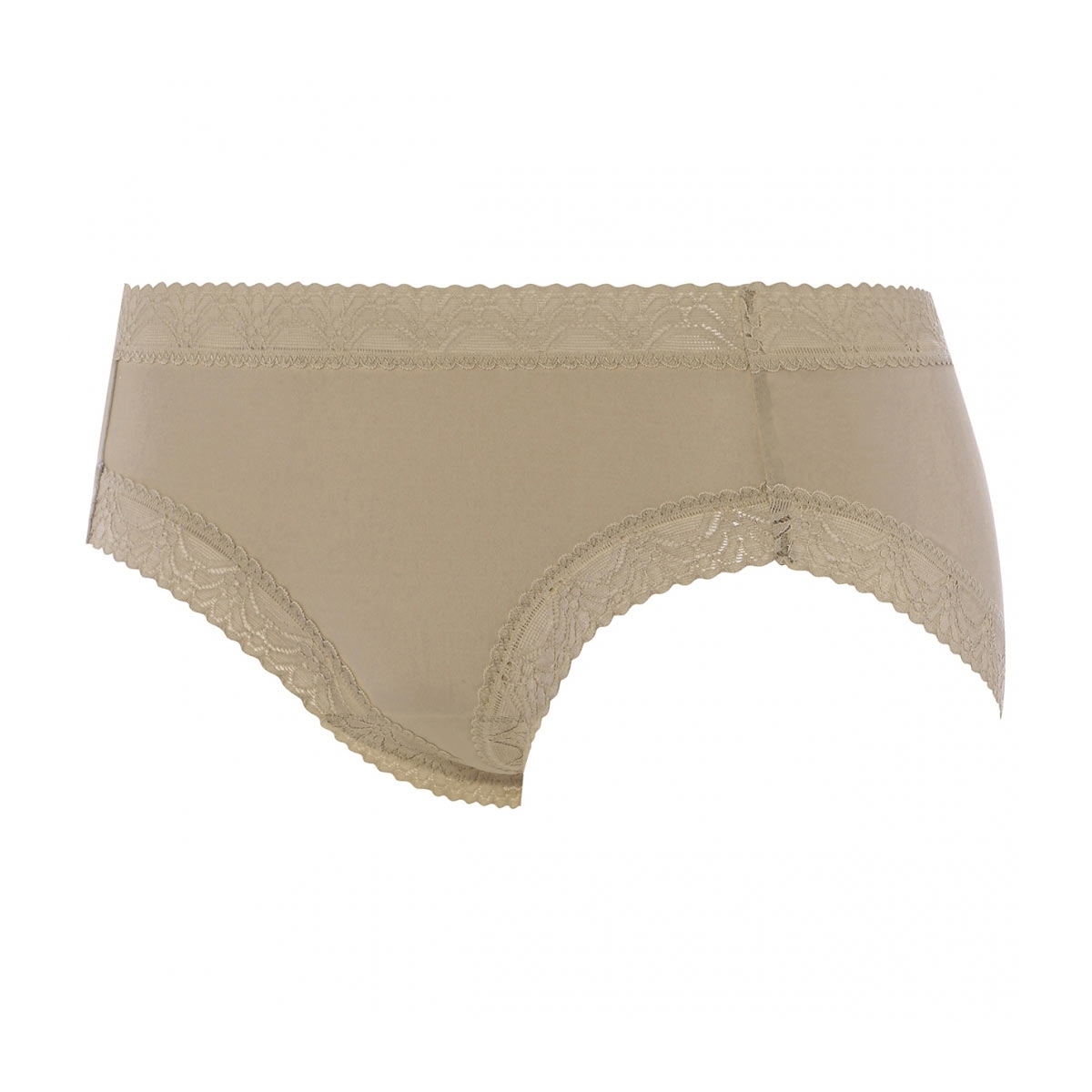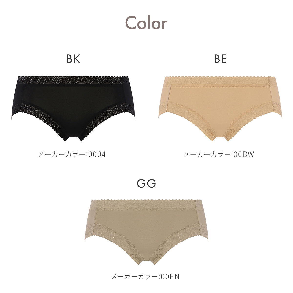 最大の特徴は、ウエストと脚口にあしらわれたモダンな薄手レース。段差ができにくいフラットな仕上がりなので、タイトなボトムスを履いても下着のラインがひびきにくく、肌へのくい込みも軽減します。