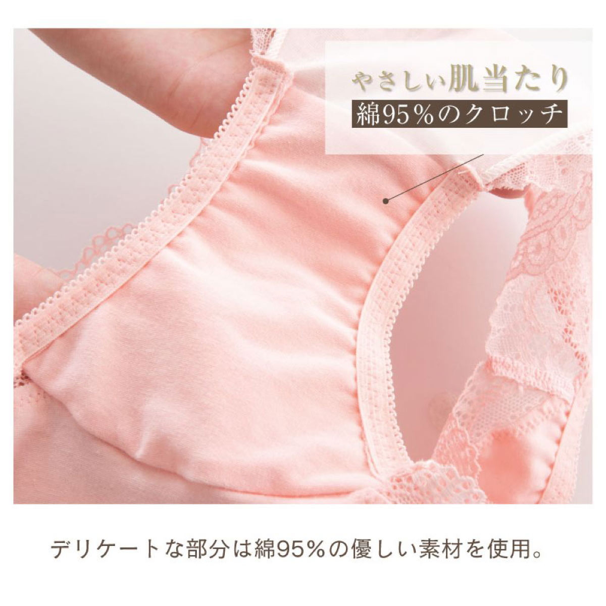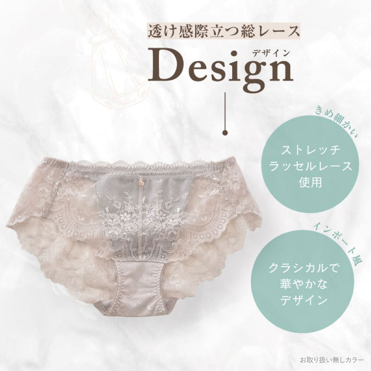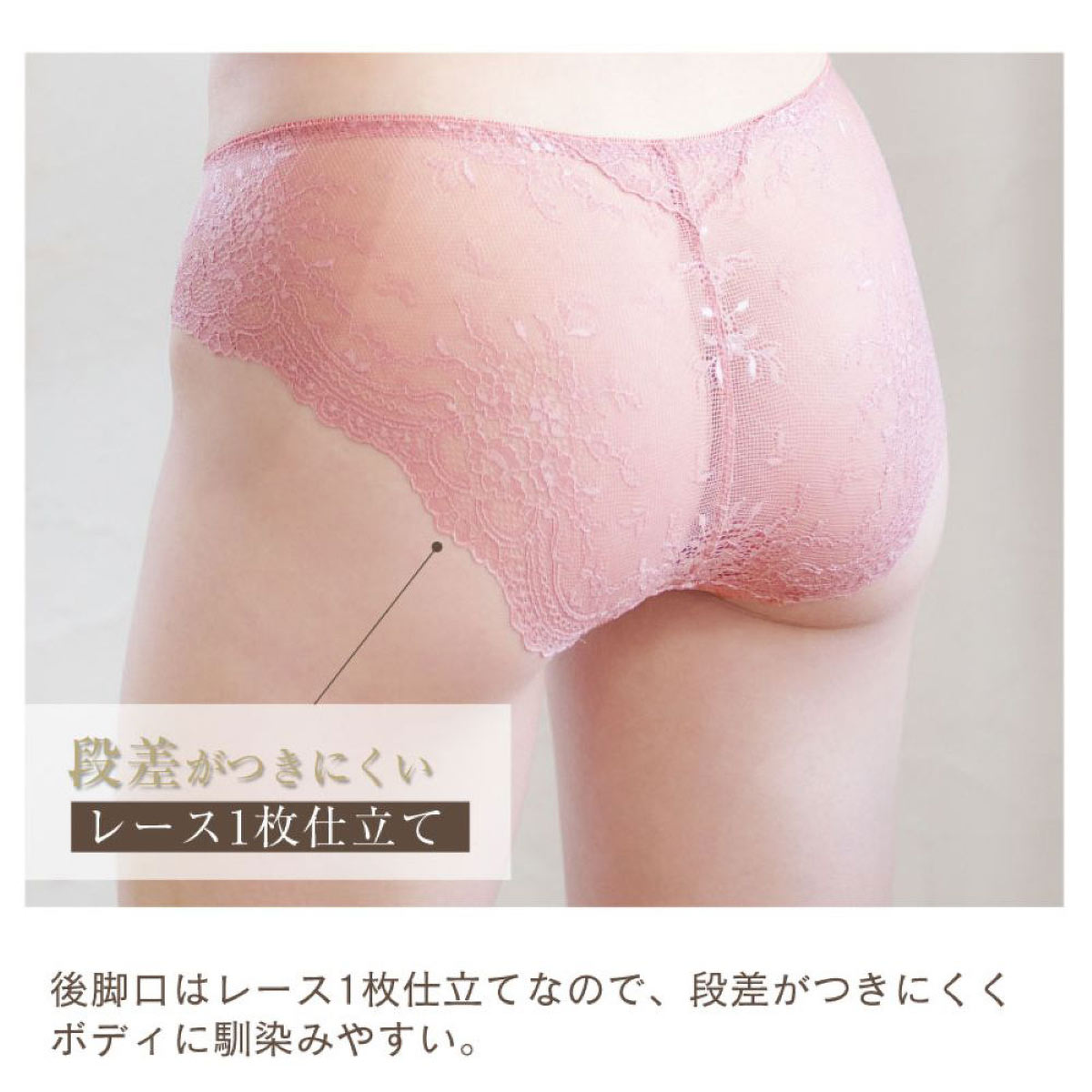 レースをふんだんにあしらった総レースタイプは、ボトムスにもショーツラインが響きにくいのが最大の魅力。脚口ノンゴム仕様で、鼠径部に食い込みにくく、優しい履き心地を実現しました。程よく伸びるストレッチレースを使用しているため、肌に負担をかけにくい設計です。