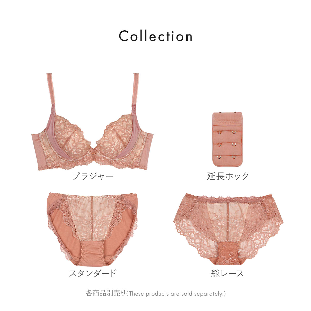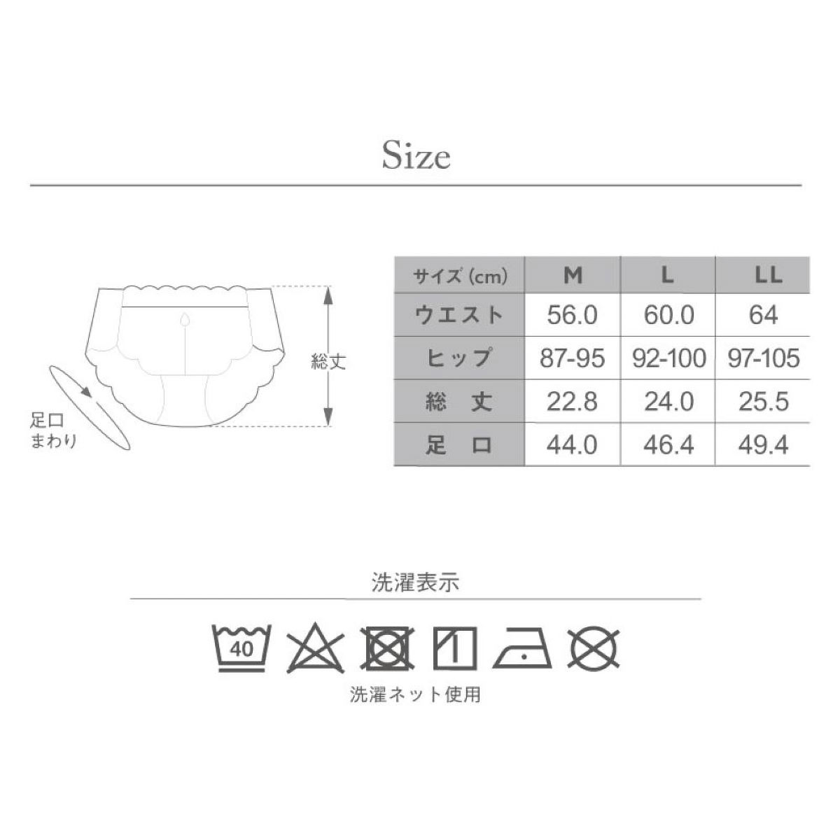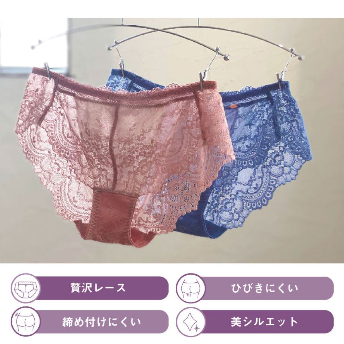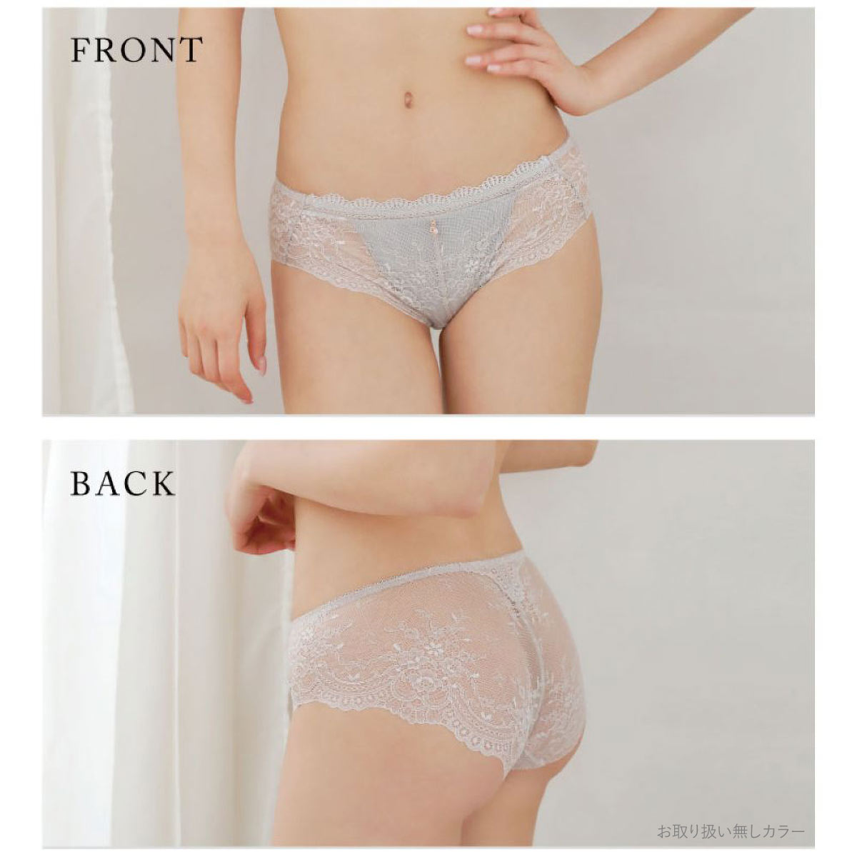 レースをふんだんにあしらった総レースタイプは、ボトムスにもショーツラインが響きにくいのが最大の魅力。脚口ノンゴム仕様で、鼠径部に食い込みにくく、優しい履き心地を実現しました。程よく伸びるストレッチレースを使用しているため、肌に負担をかけにくい設計です。