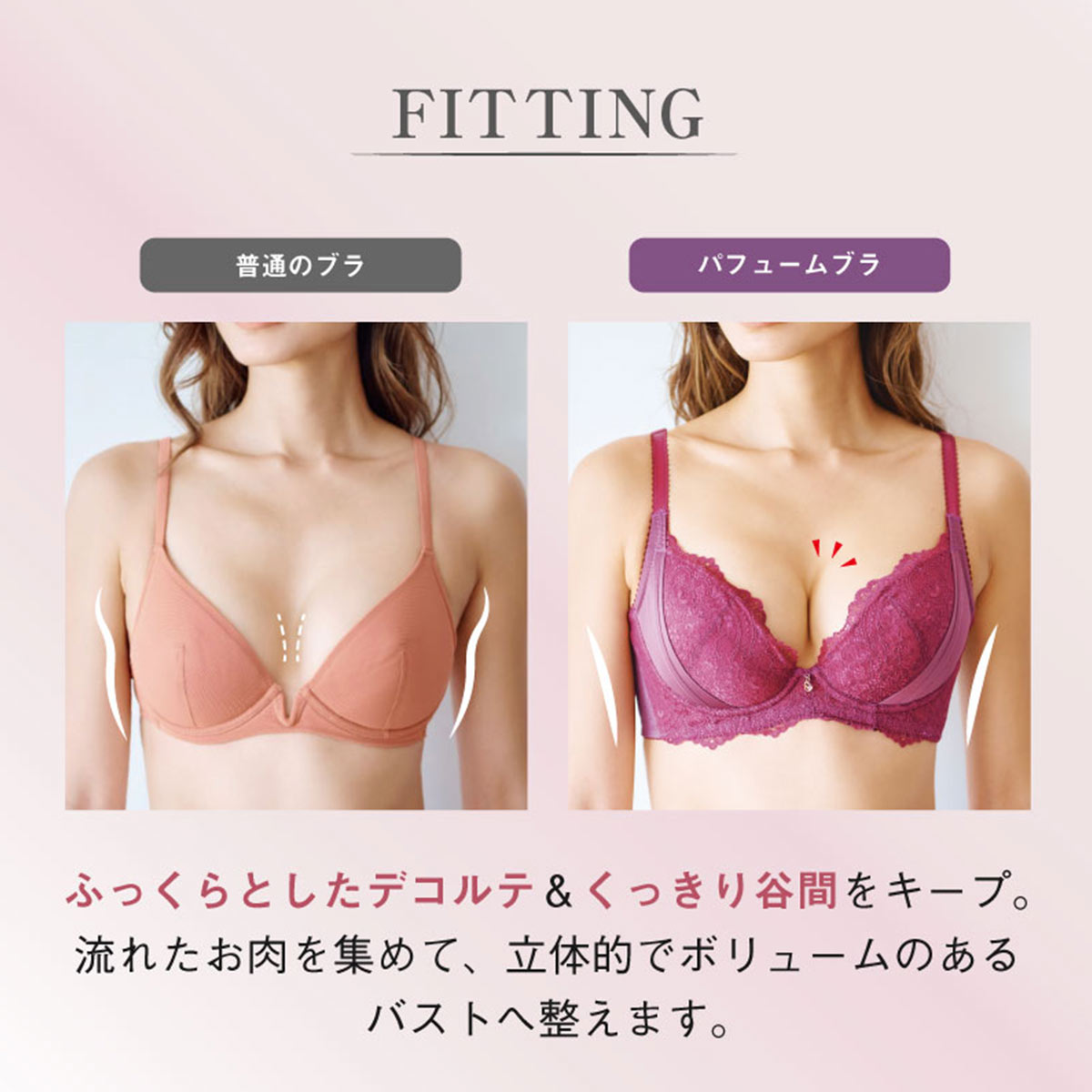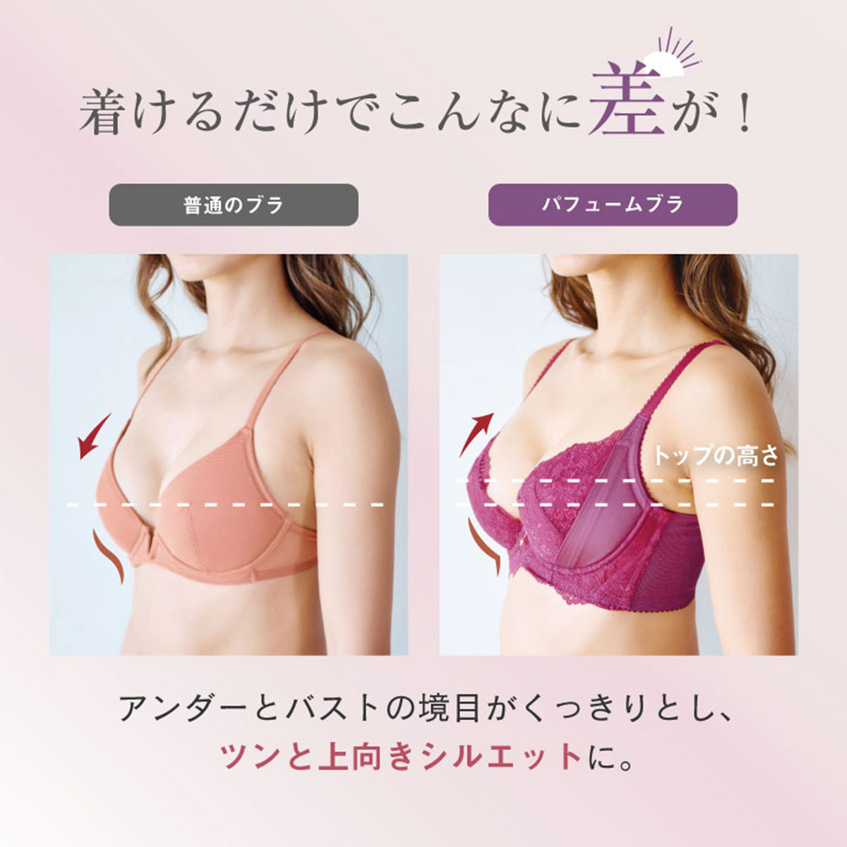 離れた胸を離さず、流れたお肉を集めてきれいなバストに整えるパフュームブラ。下から上に胸を持ち上げ、デコルテのボリュームをアップさせます。