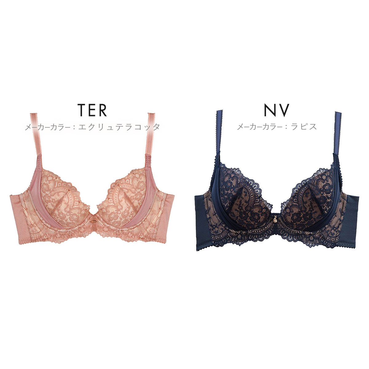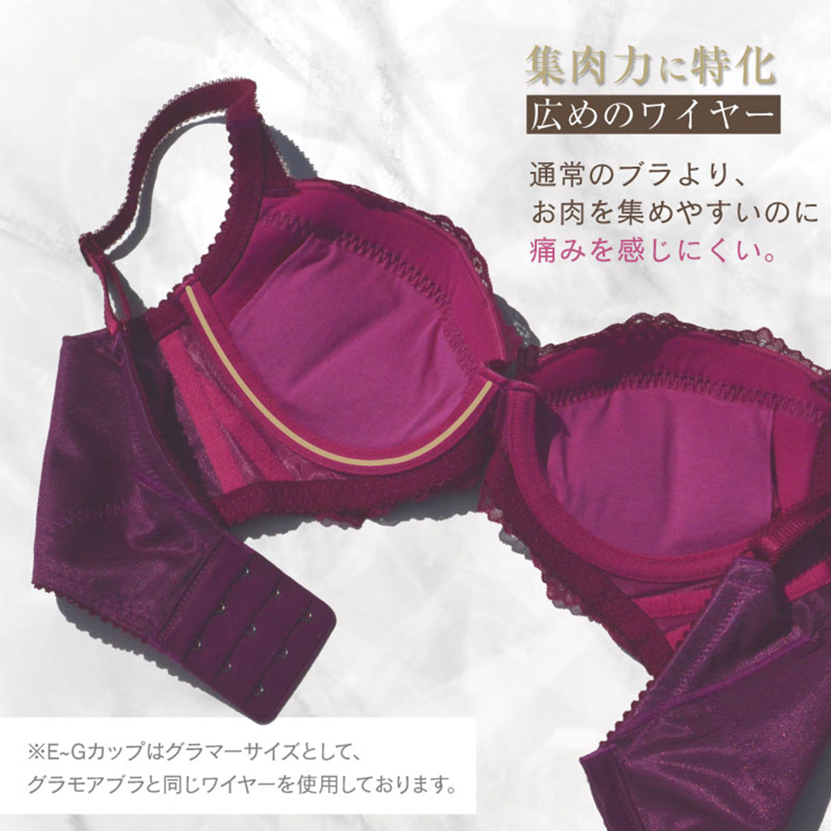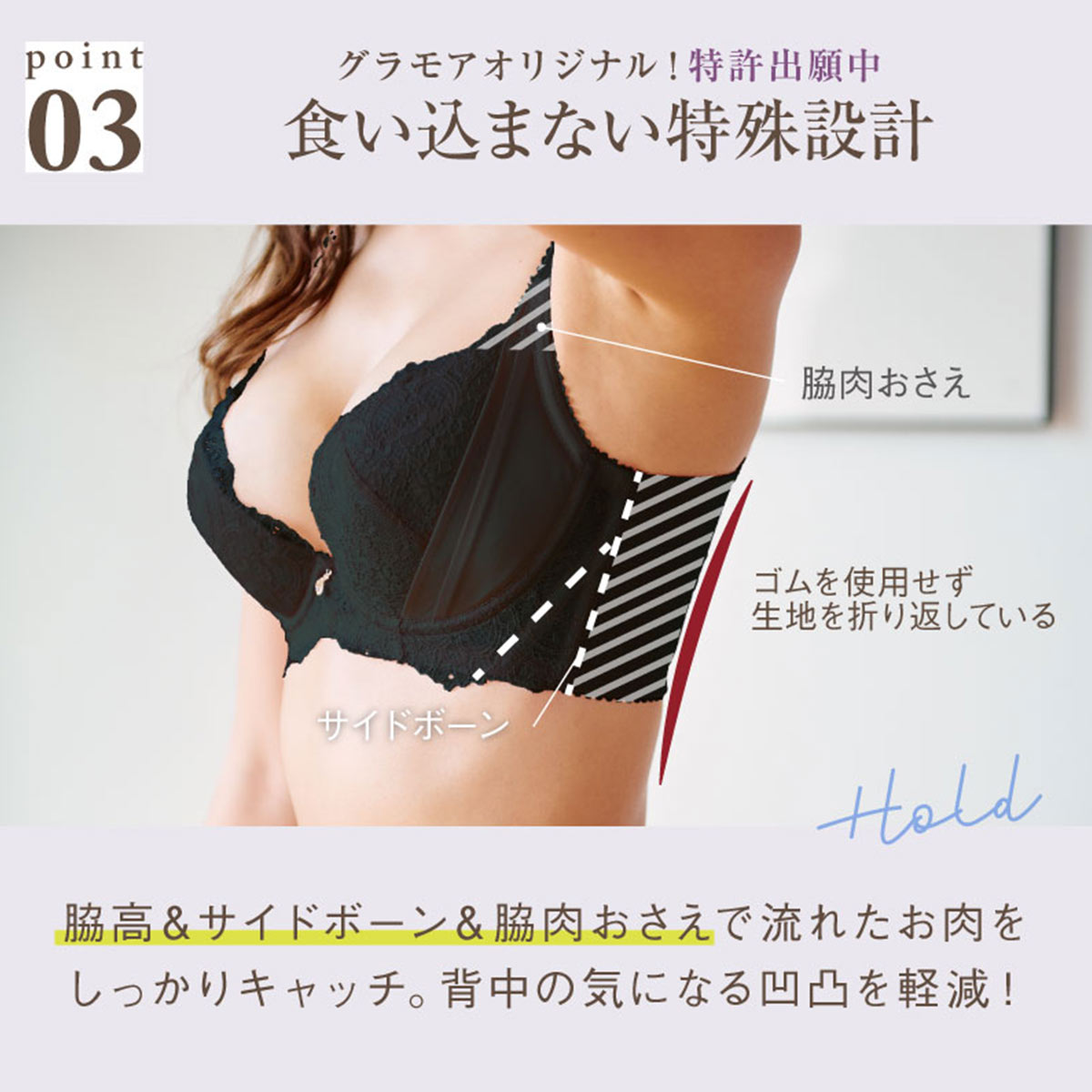 脇肉や背肉をぐっとカップに入れ込み、下から持ち上げることでボリュームがアップ。内向きカップの特殊設計が乳間を中央へ寄せ、美しい黄金比を実現します。