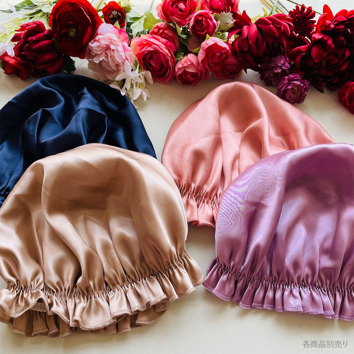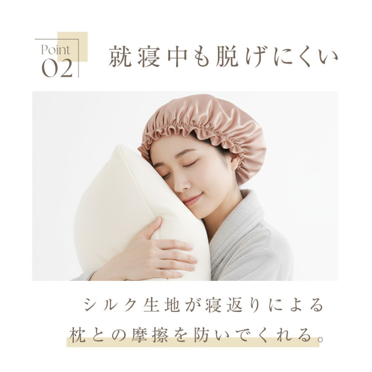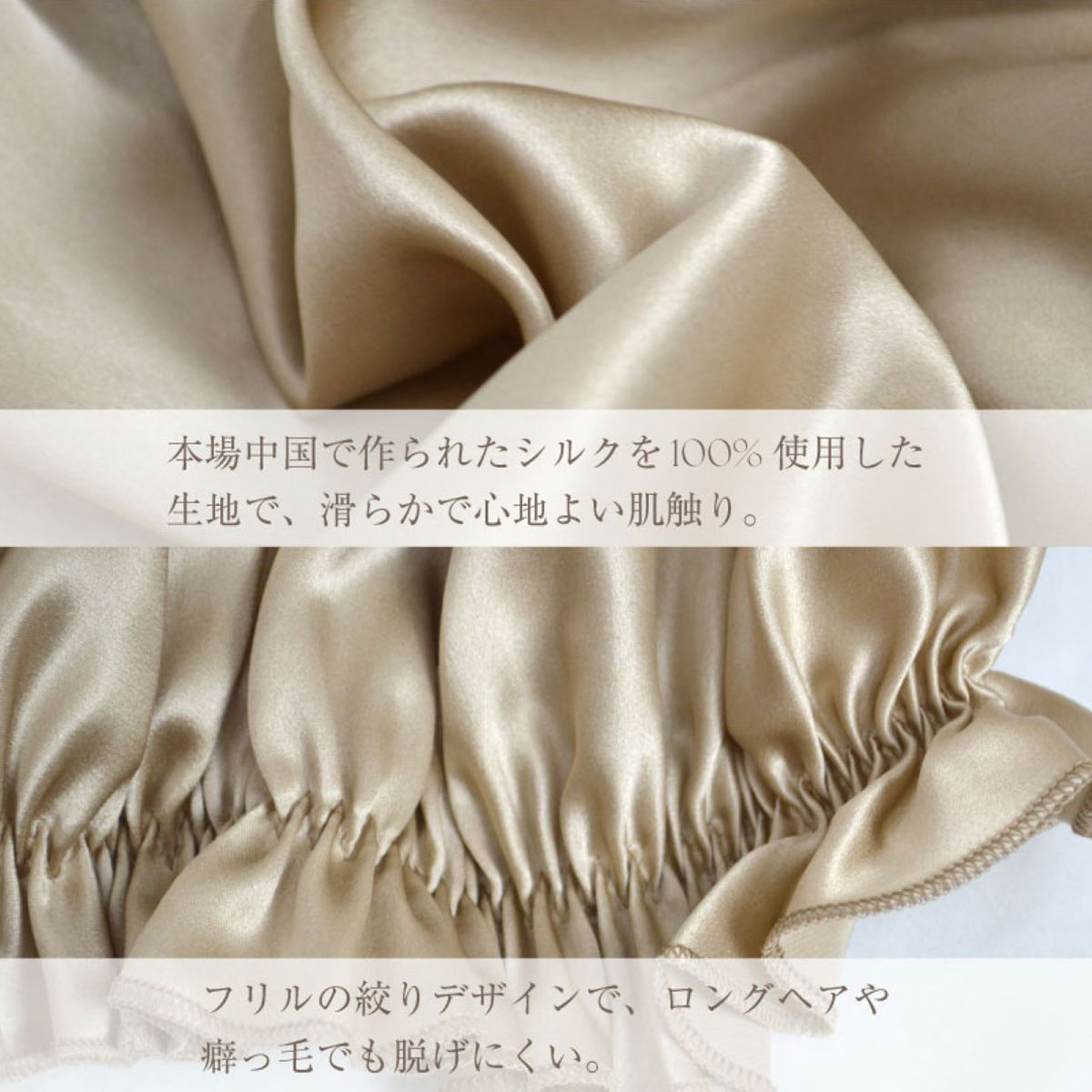 髪と頭皮に優しい シルク100% ナイトキャップ。シルク100%のなめらかな素材を使用した、髪と頭皮に優しいナイトキャップです。