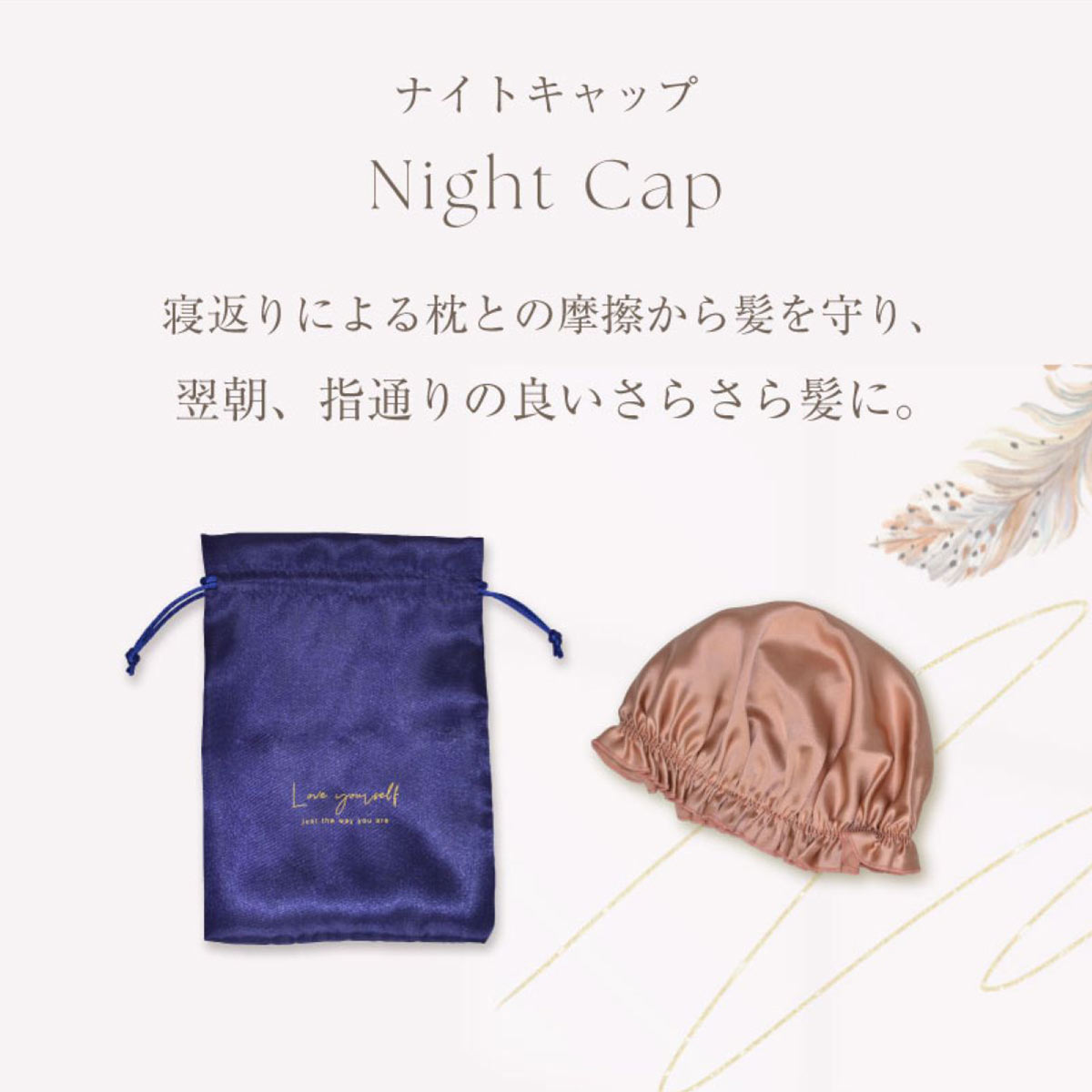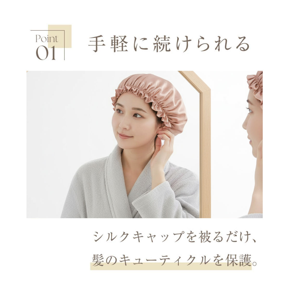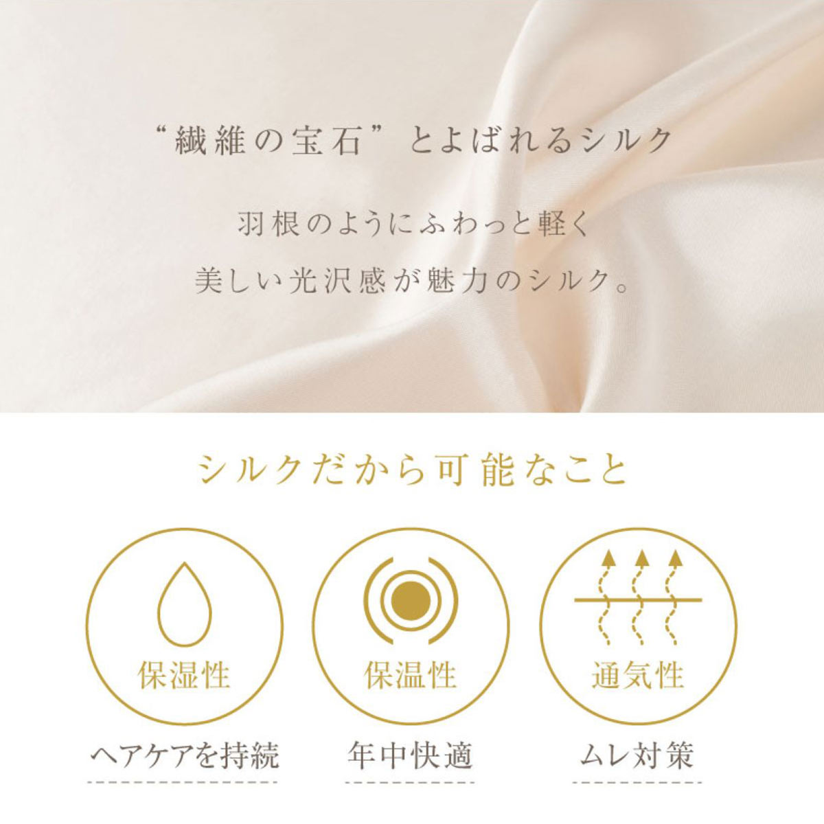 髪と頭皮に優しい シルク100% ナイトキャップ。シルク100%のなめらかな素材を使用した、髪と頭皮に優しいナイトキャップです。